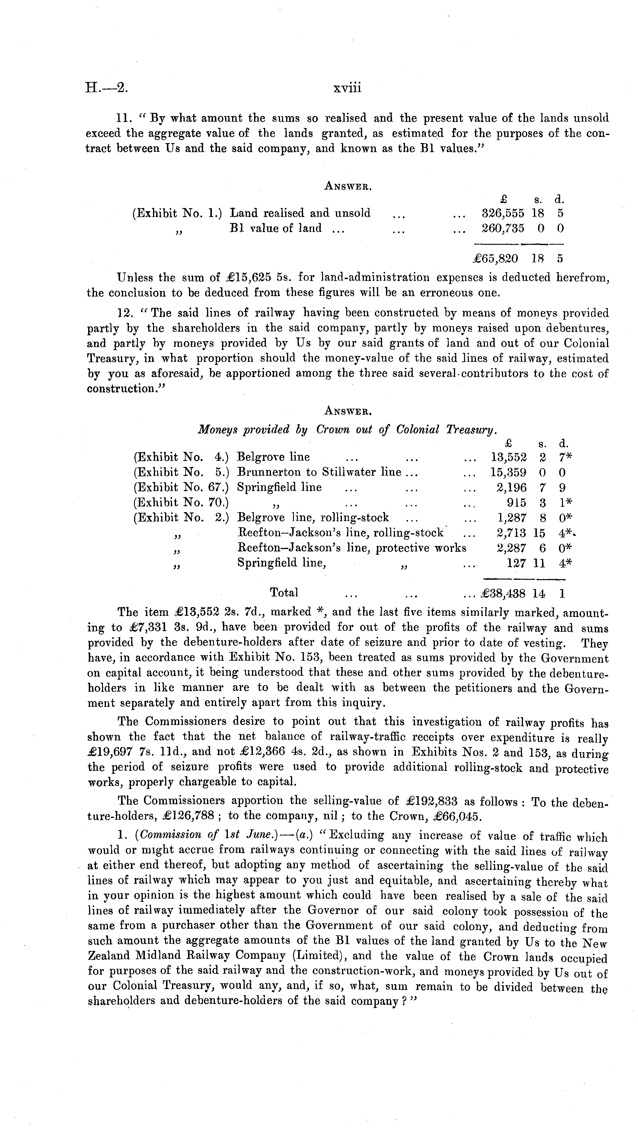 11. "By what amount the sums so realised and the present value of the lands unsold exceed the aggregate value of the lands granted, as estimated for the purposes of the contract between Us and the said company, and known as the Bl values." Answbii. £ s. d. (Exhibit No. 1.) Land realised and unsold ... ... 326,555 18 5 „ Bl value of land ... ... ... 260,735 0 0 £65,820 18 5 Unless the sum of £15,625 ss. for land-administration expenses is deducted herefrom, the conclusion to be deduced from these figures will be an erroneous one. 12. " The said lines of railway having been constructed by means of moneys provided partly by the shareholders in the said company, partly by moneys raised upon debentures, and partly by moneys provided by Us by our said grants of land and out of our Colonial Treasury, in what proportion should the money-value of the said Jines of railway, estimated by you as aforesaid, be apportioned among the three said several contributors to the cost of construction." Answer. Moneys provided by Crown out of Colonial Treasury. & s. d. (Exhibit No. 4.) Belgrove line ... ... ... 13,552 2 7* (Exhibit No. 5.) Brunnerton to Still water line ... ... 15,359 0 0 (Exhibit No. 67.) Springfield line ... ... ... 2,196 7 9 (Exhibit No. 70.) „ ... ... ... 915 3 1* (Exhibit No. 2.) Belgrove line, rolling-stock ... ... 1,287 8 0* „ Reefton—Jackson's line, rolling-stock ... 2,713 15 4*» „ Reef ton-Jackson's line, protective works 2,287 6 0* Springfield line, „ ... 127 11 4* Total ... ... ... £38,438 14 1 The item £13,552 2s. 7d., marked *, and the last five items similarly marked, amounting to £7,331 3s. 9d., have been provided for out of the profits of the railway and sums provided by the debenture-holders after date of seizure and prior to date of vesting. They have, in accordance with Exhibit No. 153, been treated as sums provided by the Government on capital account, it being understood that these and other sums provided by the debentureholders in like manner are to be dealt with as between the petitioners and the Government separately and entirely apart from this inquiry. The Commissioners desire to point out that this investigation of railway profits has shown the fact that the net balance of railway-traffic receipts over expenditure is really £19,697 7s. lid., and not £12,366 4s. 2d., as shown in Exhibits Nos. 2 and 153, as during the period of seizure profits were used to provide additional rolling-stock and protective works, properly chargeable to capital. The Commissioners apportion the selling-value of £192,833 as follows : To the deben-ture-holders, £126,788 ; to the company, nil; to the Crown, £66,045. 1. (Commission of Ist June.) — (a.) "Excluding any increase of value of traffic which would or might accrue from railways continuing or connecting with the said lines of railway at either end thereof, but adopting any method of ascertaining the selling-value of the said lines of railway which may appear to you just and equitable, and ascertaining thereby what in your opinion is the highest amount which could have been realised by a sale of the said lines of railway immediately after the Governor of our said colony took possession of the same from a purchaser other than the Government of our said colony, and deducting from such amount the aggregate amounts of the Bl values of the land granted by Us to the New Zealand Midland Railway Company (Limited), and the value of the Crown lands occupied for purposes of the said railway and the construction-work, and moneys provided by Us out of our Colonial Treasury, would any, and, if so, what, sum remain to be divided between the shareholders and debenture-holders of the said company ? "