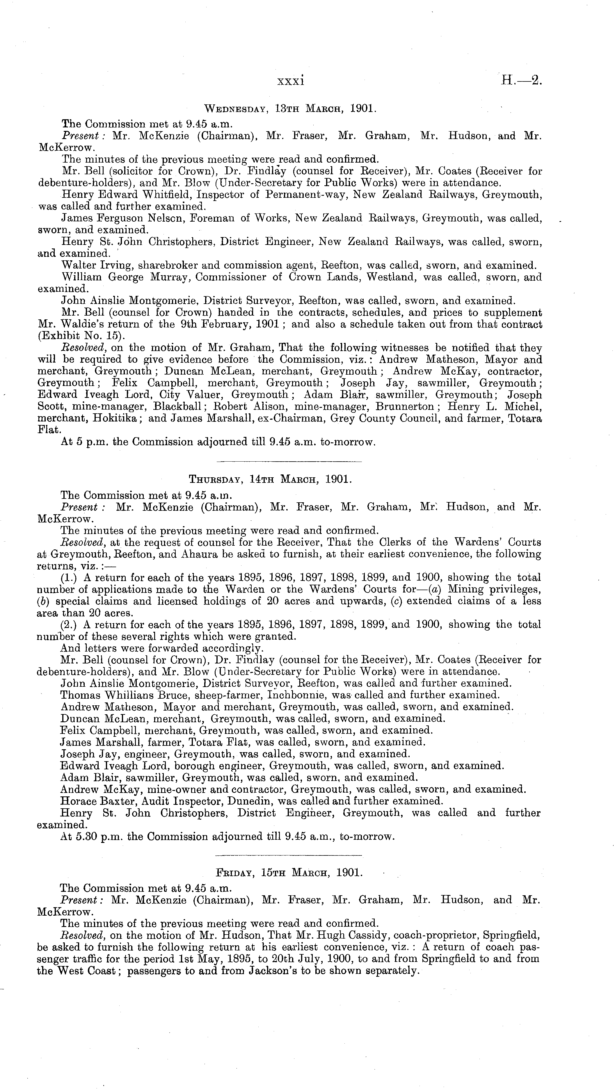 Thuesday, 14th March, 1901. The Commission met at 9.45 a.m. Present : Mr. McKenzie (Chairman), Mr. Fraser, Mr. Graham, Mrl Hudson, and Mr. McKerrow. The minutes of the previous meeting were read and confirmed. Resolved, at the request of counsel for the Receiver, That the Clerks of the Wardens' Courts at Greymouth, Reefton, and Ahaura be asked to furnish, at their earliest convenience, the following returns, viz. :— (1.) A return for each of the years 1895, 1896, 1897, 1898, 1899, and 1900, showing the total number of applications made to the Warden or the Wardens' Courts for— (a) Mining privileges, (b) special claims and licensed holdings of 20 acres and upwards, (c) extended claims of a less area than 20 acres. (2.) A return for each of the years 1895, 1896, 1897, 1898, 1899, and 1900, showing the total number of these several rights which were granted. And letters were forwarded accordingly. Mr. Bell (counsel for Crown), Dr. Findlay (counsel for the Receiver), Mr. Coates (Receiver for debenture-holders), and Mr. Blow (Under-Secretary for Public Works) were in attendance. John Ainslie Montgomerie, District Surveyor, Reefton, was called and further examined. Thomas Whillians Bruce, sheep-farmer, Inchbonnie, was called and further examined. Andrew Matheson, Mayor and merchant, Greymouth, was called, sworn, and examined. Duncan McLean, merchant, Greymouth, was called, sworn, and examined. Felix Campbell, merchant, Greymouth, was called, sworn, and examined. James Marshall, farmer, Totara Flat, was called, sworn, and examined. Joseph Jay, engineer, Greymouth, was called, sworn, and examined. Edward Iveagh Lord, borough engineer, Greymouth, was called, sworn, and examined. Adam Blair, sawmiller, Greymouth, was called, sworn, and examined. Andrew McKay, mine-owner and contractor, Greymouth, was called, sworn, and examined. Horace Baxter, Audit Inspector, Dunedin, was called and further examined. Henry St. John Christophers, District Engineer, Greymouth, was called and further examined. At 5.30 p.m. the Commission adjourned till 9.45 a.m., to-morrow.
