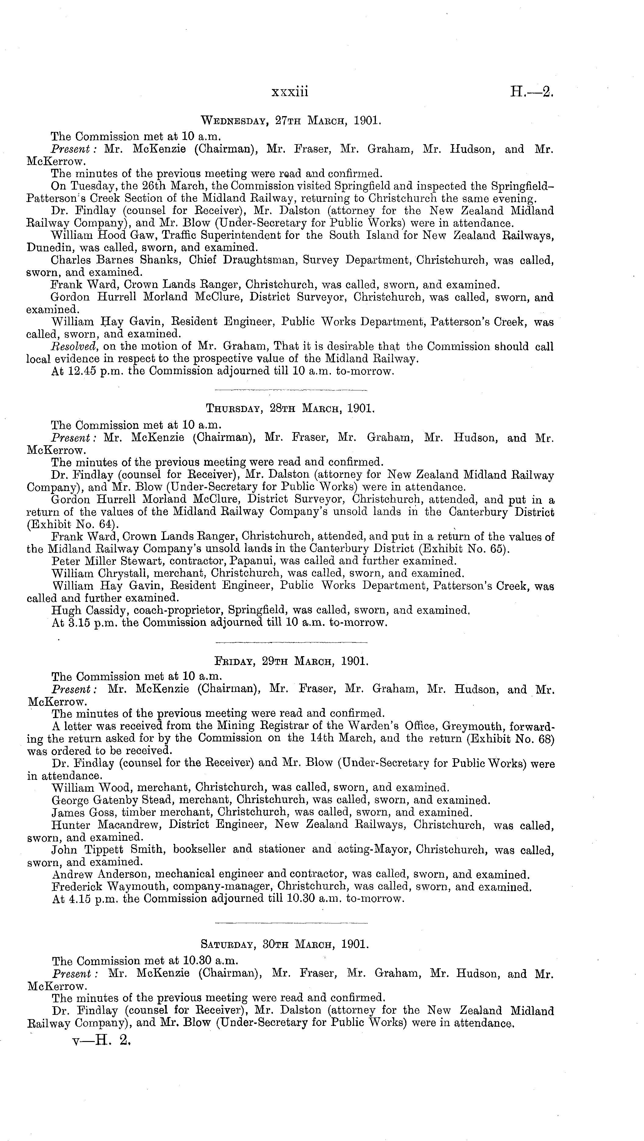 Satueday, 30th Maech, 1901. The Commission met at 10.30 a.m. Present: Mr. McKenzie (Chairman), Mr. Praser, Mr. Graham, Mr. Hudson, and Mr. McKerrow. The minutes of the previous meeting were read and confirmed. Dr. Pindlay (counsel for Eeceiver), Mr. Dalston (attorney for the New Zealand Midland Eailway Company), and Mr. Blow (Under-Secretary for Public Works) were in attendance, v—H. 2.