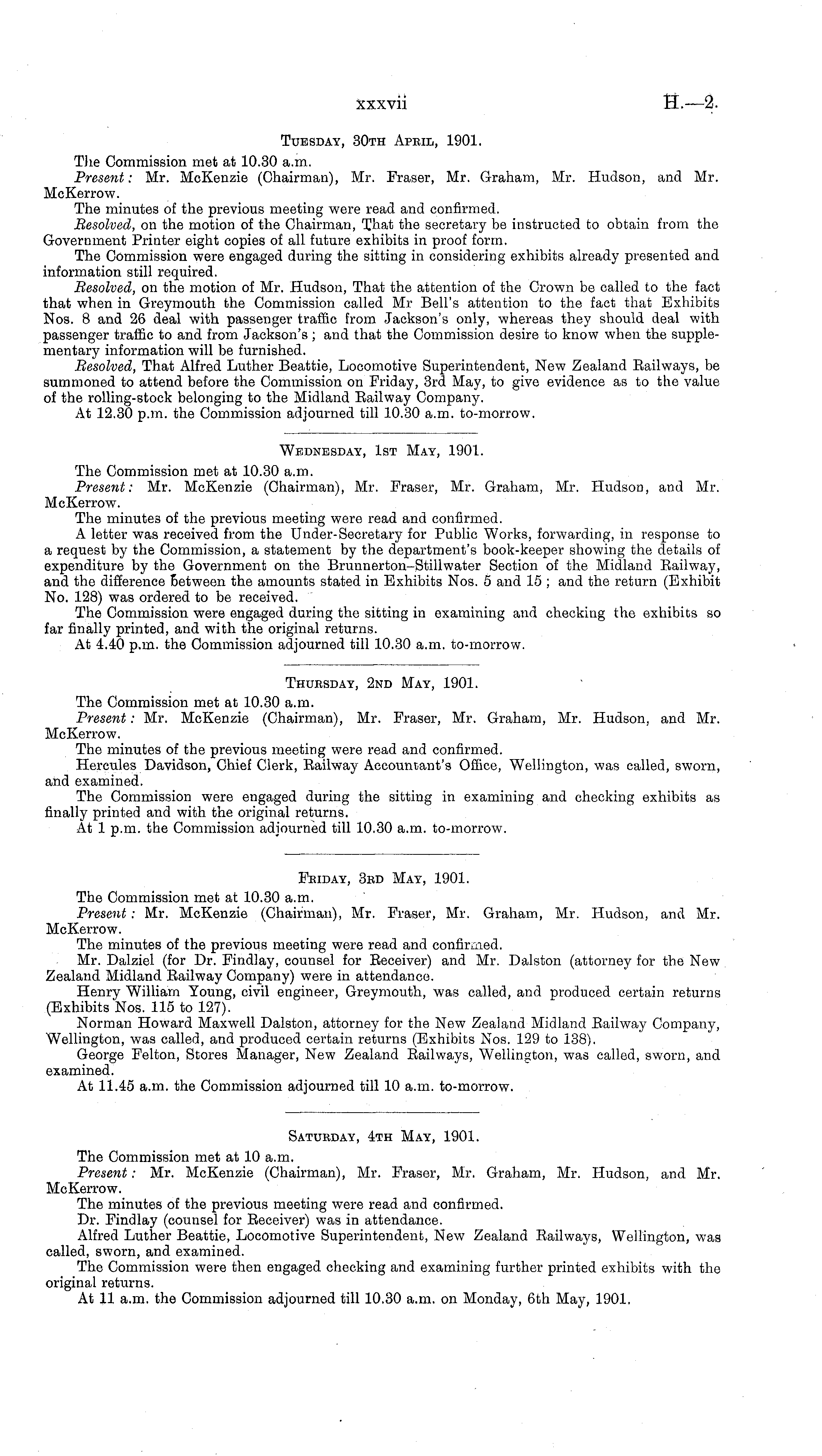 Tuesday, 30th April, 1901. The Commission met at 10.30 a.m. Present: Mr. McKenzie (Chairman), Mr. Fraser, Mr. Graham, Mr. Hudson, and Mr. McKerrow. The minutes of the previous meeting were read and confirmed. Besolved, on the motion of the Chairman, That the secretary be instructed to obtain from the Government Printer eight copies of all future exhibits in proof form. The Commission were engaged during the sitting in considering exhibits already presented and information still required. Besolved, on the motion of Mr. Hudson, That the attention of the Crown be called to the fact that when in Greymouth the Commission called Mr Bell's attention to the fact that Exhibits Nos. 8 and 26 deal with passenger traffic from Jackson's only, whereas they should deal with passenger traffic to and from Jackson's ; and that the Commission desire to know when the supplementary information will be furnished. Besolved, That Alfred Luther Beattie, Locomotive Superintendent, New Zealand Eailways, be summoned to attend before the Commission on Friday, 3rd May, to give evidence as to the value of the rolling-stock belonging to the Midland Railway Company. At 12.30 p.m. the Commission adjourned till 10.30 a.m. to-morrow.