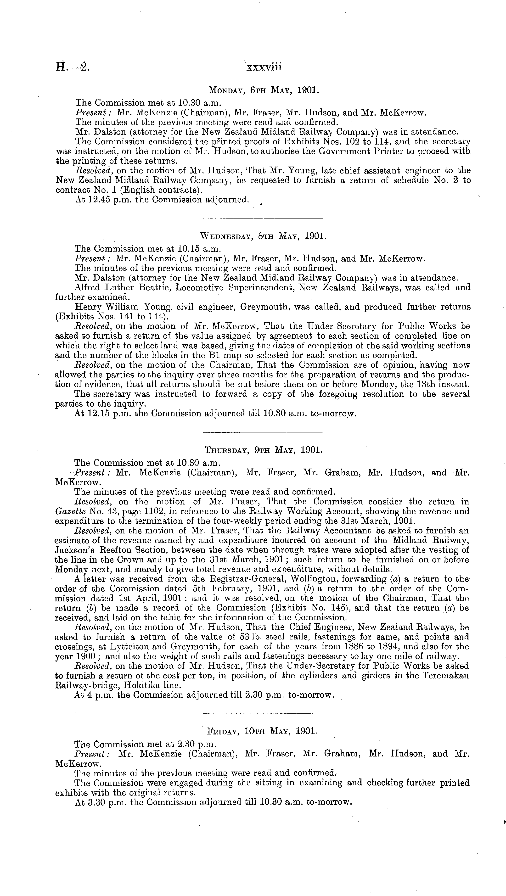 Monday, 6th May, 1901. The Commission met at 10.30 a.m. Present: Mr. McKenzie (Chairman), Mr. Fraser, Mr. Hudson, and Mr. McKerrow. The minutes of the previous meeting were read and confirmed. Mr. Dalston (attorney for the New Zealand Midland Bailway Company) was in attendance. The Commission considered the printed proofs of Exhibits Nos. 102 to 114, and the secretary was instructed, on the motion of Mr. Hudson, to authorise the Government Printer to proceed with the printing of these returns. Resolved, on the motion of Mr. Hudson, That Mr. Young, late chief assistant engineer to the New Zealand Midland Eailway Company, be requested to furnish a return of schedule No. 2 to contract No. 1 (English contracts). At 12.45 p.m. the Commission adjourned.
