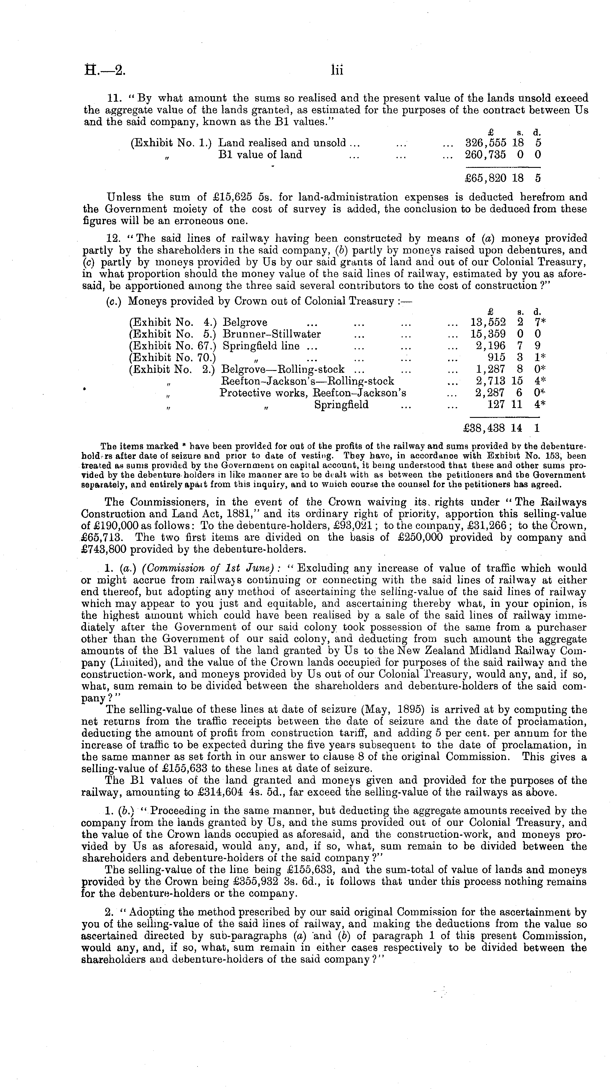 11. "By what amount the sums so realised and the present value of the lands unsold exceed the aggregate value of the lands granted, as estimated for the purposes of the contract between Us and the said company, known as the Bl values." £ s. d. (Exhibit No. 1.) Land realised and unsold ... ... ... 326,555 18 5 Bl value of land ... ... ... 260,735 0 0 £65,820 18 5 Unless the sum of £15,625 ss. for land-administration expenses is deducted herefrom and the Government moiety of the cost of survey is added, the conclusion to be deduced from these figures will be an erroneous one. 12. " The said lines of railway having been constructed by means of (a) moneys provided partly by the shareholders in the said company, (b) partly by moneys raised upon debentures, and (c) partly by moneys provided by Us by our said grants of land and out of our Colonial Treasury, in what proportion should the money value of the said lines of railway, estimated by you as aforesaid, be apportioned among the three said several contributors to the cost of construction ?" (c.) Moneys provided by Crown out of Colonial Treasury : — £ s. d. (Exhibit No. 4.) Belgrove ... ... ... ... 13,552 2 7* (Exhibit No. 5.) Brunner-Stillwater ... ... ... 15,359 0 0 (Exhibit No. 67.) Springfield line ... ... ... ... 2,196 7 9 (Exhibit No. 70.) „ ... ... ... ... 915 3 1* (Exhibit No. 2.) i Belgrove—Boiling-stock ... ... ... 1,287 8 0* „ Beefton-Jackson's—Boiling-stock ... 2,713 15 4* „ Protective works, Beef ton-Jackson's ... 2,287 6 0* Springfield 127 11 4* £38,438 14 1 The items marked * have been provided for out of the profits of the railway and sums provided by the debenturehold rs after date of seizure and prior to date of vesting. They havo, in accordance with Exhibit No. 153, been treated as sums provided by the Government on capital account, it being understood that these and other sums provided by the debenture-holders in like manner are to be dealt with as between the petitioners and the Government separately, and entirely apait from this inquiry, and to wuich course the counsel for the petitioners has agreed. The Commissioners, in the event of the Crown waiving its, rights under "The Bailways Construction and Land Act, 1881," and its ordinary right of priority, apportion this selling-value of £190,000 as follows: To the debenture-holders, £93,021; to the company, £31,266 ; to the Crown, £65,713. The two first items are divided on the basis of £250,000 provided by company and £743,800 provided by the debenture-holders. 1. (a.) (Commission of Ist June) : " Excluding any increase of value of traffic which would or might accrue from railways continuing or connecting with the said lines of railway at either end thereof, but adopting any method of ascertaining the selling-value of the said lines of railway which may appear to you just and equitable, and ascertaining thereby what, in your opinion, is the highest amount which could have been realised by a sale of the said lines of railway immediately after the Government of our said colony took possession of the same from a purchaser other than the Government of our said colony, and deducting from such amount the aggregate amounts of the Bl values of the land granted by Us to the New Zealand Midland Bailway Company (Limited), and the value of the Crown lands occupied for purposes of the said railway and the construction-work, and moneys provided by Us out of our Colonial Treasury, would any, and, if so, what, sum remain to be divided between the shareholders and debenture-holders of the said company ? " The selling-value of these lines at date of seizure (May, 1895) is arrived at by computing the net returns from the traffic receipts between the date of seizure and the date of proclamation, deducting the amount of profit from construction tariff, and adding 5 per cent, per annum for the increase of traffic to be expected during the five years subsequent to the date of proclamation, in the same manner as set forth in our answer to clause Bof the original Commission. This gives a selling-value of £155,633 to these lines at date of seizure. The Bl values of the land granted and moneys given and provided for the purposes of the railway, amounting to £314,604 4s. 5d., far exceed the selling-value of the railways as above. 1. (&.) " Proceeding in the same manner, but deducting the aggregate amounts received by the company from the lands granted by Us, and the sums provided out of our Colonial Treasury, and the value of the Crown lands occupied as aforesaid, and the construction-work, and moneys provided by Us as aforesaid, would any, and, if so, what, sum remain to be divided between the shareholders and debenture-holders of the said company?" The selling-value of the line being £155,633, and the sum-total of value of lands and moneys provided by the Crown being £355,932 3s. 6d., it follows that under this process nothing remains for the debenture-holders or the company. 2. " Adopting the method prescribed by our said original Commission for the ascertainment by you of the sellmg-value of the said lines of railway, and making the deductions from the value so ascertained directed by sub-paragraphs (a) and (6) of paragraph 1 of this present Commission, would any, and, if so, what, sum remain in either cases respectively to be divided between the shareholders and debenture-holders of the said company?"