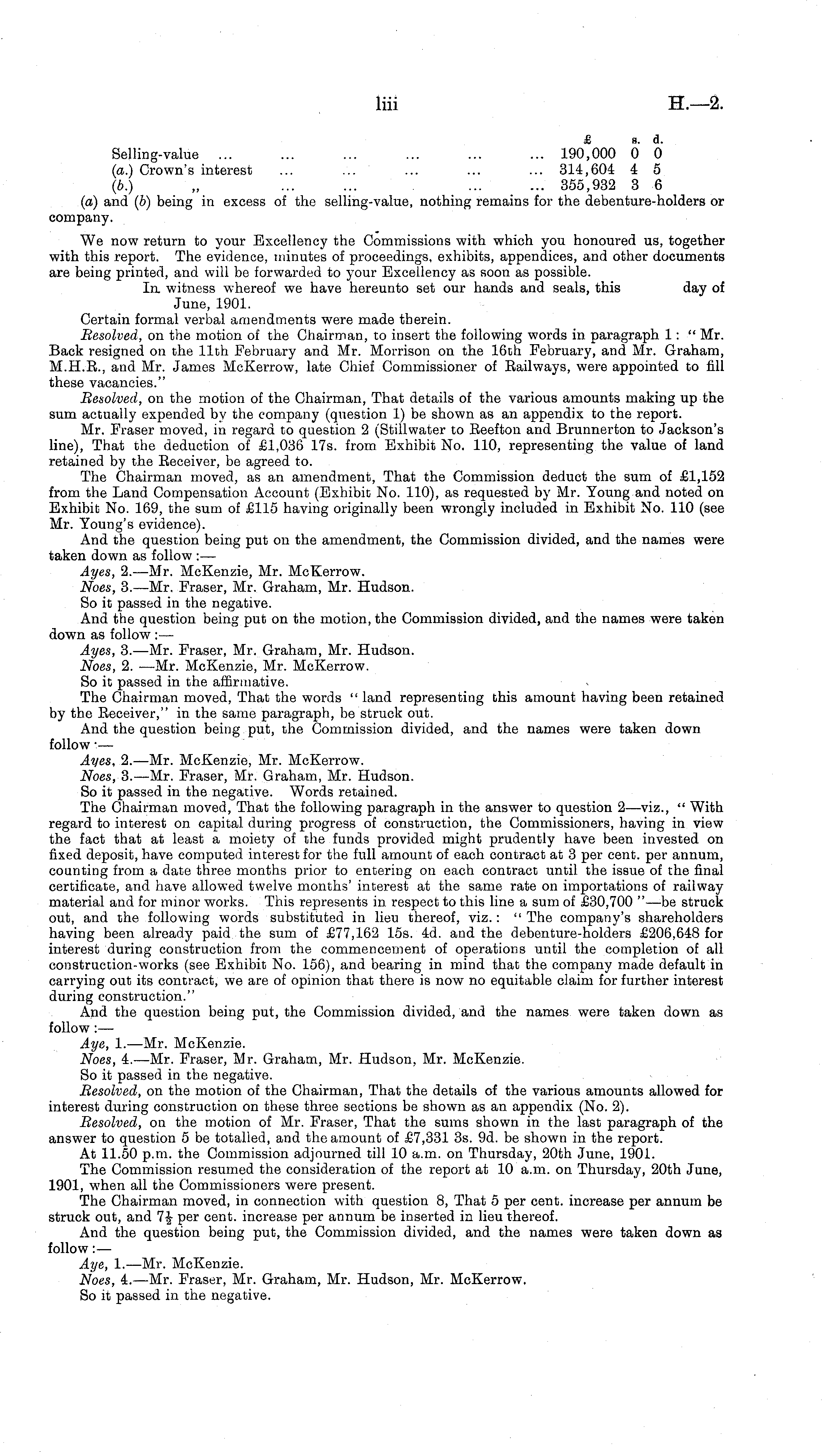 £ a. d. Selling-value ... ... ... ... ... ... 190,000 0 0 (a.) Crown's interest ... ... ... ... ... 314,604 4 5 (b.) „ ... ... ... ... 355,932 3 6 (a) and (b) being in excess of the selling-value, nothing remains for the debenture-holders or company. We now return to your Excellency the Commissions with which you honoured us, together with this report. The evidence, minutes of proceedings, exhibits, appendices, and other documents are being printed, and will be forwarded to your Excellency as soon as possible. In. witness whereof we have hereunto set our hands and seals, this day of June, 1901. Certain formal verbal amendments were made therein. Resolved, on the motion of the Chairman, to insert the following words in paragraph 1: " Mr. Back resigned on the 11th February and Mr. Morrison on the 16th February, and Mr. Graham, M.H.E., and Mr. James McKerrow, late Chief Commissioner of Eailways, were appointed to fill these vacancies." Resolved, on the motion of the Chairman, That details of the various amounts making up the sum actually expended by the company (question 1) be shown as an appendix to the report. Mr. Fraser moved, in regard to question 2 (Stillwater to Eeefton and Brunnerton to Jackson's line), That the deduction of £1,036 17s. from Exhibit No. 110, representing the value of land retained by the Receiver, be agreed to. The Chairman moved, as an amendment, That the Commission deduct the sum of £1,152 from the Land Compensation Account (Exhibic No. 110), as requested by Mr. Young and noted on Exhibit No. 169, the sum of £115 having originally been wrongly included in Exhibit No. 110 (see Mr. Young's evidence). And the question being put on the amendment, the Commission divided, and the names were taken down as follow :— Ayes, 2.—Mr. McKenzie, Mr. McKerrow. Noes, 3.—Mr. Fraser, Mr. Graham, Mr. Hudson. So it passed in the negative. And the question being put on the motion, the Commission divided, and the names were taken down as follow :— Ayes, 3.—Mr. Fraser, Mr. Graham, Mr. Hudson. Noes, 2. —Mr. McKenzie, Mr. McKerrow. So it passed in the affirmative. The Chairman moved, That the words " land representing this amount having been retained by the Receiver," in the same paragraph, be struck out. And the question being put, the Commission divided, and the names were taken down follow • — Ayes, 2.—Mr. McKenzie, Mr. McKerrow. Noes, 3. —Mr. Fraser, Mr. Graham, Mr. Hudson. So it passed in the negative. Words retained. The Chairman moved, That the following paragraph in the answer to question 2—viz., " With regard to interest on capital during progress of construction, the Commissioners, having in view the fact that at least a moiety of the funds provided might prudently have been invested on fixed deposit, have computed interest for the full amount of each contract at 3 per cent, per annum, counting from a date three months prior to entering on each contract until the issue of the final certificate, and have allowed twelve months' interest at the same rate on importations of railway material and for minor works. This represents in respect to this line a sum of £30,700 " —be struck out, and the following words substituted in lieu thereof, viz.: " The company's shareholders having been already paid the sum of £77,162 15s. 4d. and the debenture-holders £206,648 for interest during construction from the commencement of operations until the completion of all construction-works (see Exhibit No. 156), and bearing in mind that the company made default in carrying out its contract, we are of opinion that there is now no equitable claim for further interest during construction." And the question being put, the Commission divided, and the names were taken down as follow:— Aye, I.—Mr. McKenzie. Noes, 4.—Mr. Fraser, Mr. Graham, Mr. Hudson, Mr. McKenzie. So it passed in the negative. Resolved, on the motion of the Chairman, That the details of the various amounts allowed for interest during construction on these three sections be shown as an appendix (No. 2). Resolved, on the motion of Mr. Fraser, That the sums shown in the last paragraph of the answer to question 5 be totalled, and the amount of £7,331 3s. 9d. be shown in the report. At 11.50 p.m. the Commission adjourned till 10 a.m. on Thursday, 20th June, 1901. The Commission resumed the consideration of the report at 10 a.m. on Thursday, 20th June, 1901, when all the Commissioners were present. The Chairman moved, in connection with question 8, That 5 per cent, increase per annum be struck out, and per cent, increase per annum be inserted in lieu thereof. And the question being put, the Commission divided, and the names were taken down as follow:— Aye, I.—Mr. McKenzie. Noes, 4.—Mr. Fraser, Mr. Graham, Mr. Hudson, Mr. McKerrow. So it passed in the negative.