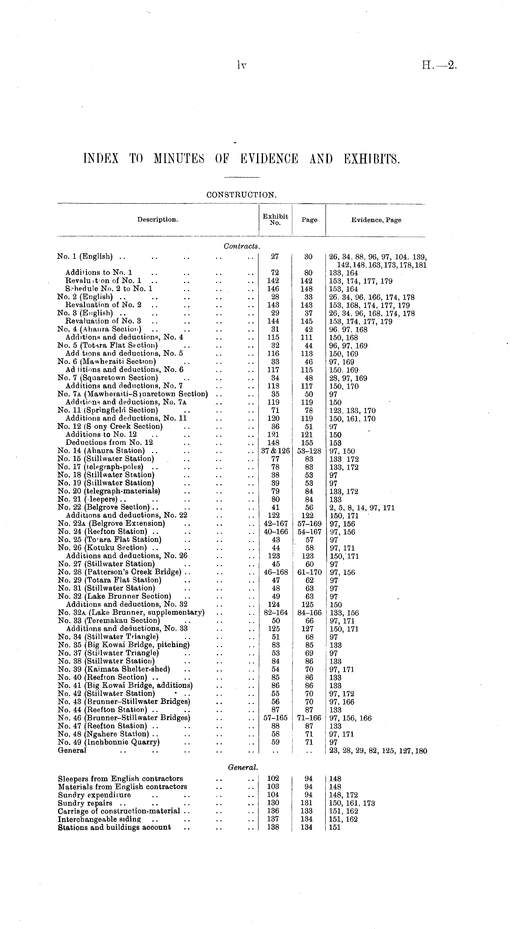 Description. Exhibit No. Page Evidence, Page Contracts. No. 1 (English) 27 30 26, 34, 88, 96, 97, 104. 139, 142,148.163,173,178,181 133, 164 153, 174, 177, 179 153, 164 26. 34, 96, 166, 174, 178 153, 168, 174, 177, 179 26, 34, 96, 168. 174, 178 153, 174, 177, 179 96, 97. 168 150, 168 96, 97, 169 150, 169 97, 169 150. 169 28, 97, 169 150, 170 97 150 123, 133, 170 150, 161, 170 97 150 153 97, 150 133 172 133, 172 97 97 133, 172 133 2, 5, 8, 14, 97, 171 150, 171 97, 156 97, 156 97 97, 171 150, 171 97 97, 156 97 97 97 150 133, 156 97, 171 150, 171 97 133 97 133 97, 171 133 133 97, 172 97. 166 133 97, 156, 166 133 97, 171 97 23, 28, 29, 82, 125, 127,180 Additions to No. 1 Revalujton of No. 1 Sfhedule No. 2 to No. 1 .. ... No. 2 (English) .. Revaluation of No. 2 .. No. 3 (English) .. .. .'. Revaluation of No. 3 No. 4 (Ahaura Section) Additions and deductions, No. 4 No. 5 (Totira Flat Section) Add tions and deductions, No. 5 No. 6 (Mawheraiti Section) Ad iitinns and deductions, No. 6 No. 7 (Squaretown Section) Additions and deductions, No. 7 No. 7a (Mawheraiti-Sjnaretown Section) .. Additions and deductions, No. 7a No. 11 (Springfield Section) Additionsanddeductions.No.il No. 12 (S ony Creek Section) Additions to No. 12 Deductions from No. 12 No. 14 (Ahaura Station) No. 15 (Stillwater Station) No. 17 (telegraph-poles) No. 18 (Stillwater Station) No. 19 (Stillwater Station) No. 20 (telegraph-materials) No. 21 (leepers) No. 22 (Belgrove Section) Additions and deductions, No. 22 No. 22a (Belgrove Extension) No. 24 (Reefton Station) No. 25 (To-ara Flat Station) No. 26 (Kotuku Section) Additions and deductions, No. 26 No. 27 (Stillwater Station) No. 28 (Patterson's Creek Bridge) No. 29 (Totara Flat Station) No. 31 (Stillwater Station) No. 32 (Lake Brunner Section) Additions and deductions, No. 32 No. 32a (Lake Brunner, supplementary) No. 33 (Teremakau Section) .. Additions and deductions, No. 33 No. 34 (Stillwater Triangle) No. 35 (Big Kowai Bridge, pitching) No. 37 (Stillwater Triangle) No. 38 (Stillwater Station) No. 39 (Kaimata Shelter-shed) No. 40 (Reefton Section) No. 41 (Big Kowai Bridge, additions) No. 42 (Stillwater Station) • .. No. 43 (Brunner-Stillwater Bridges) No. 44 (Reefton Station) No. 46 (Brunner-Stillwater Bridges) No. 47 (Reefton Station) No. 48 (Ngahere Station) No. 49 (lnchbonnie Quarry) General 72 142 146 28 143 29 144 31 115 32 116 33 117 34 113 35 119 71 120 36 121 148 37 & 126 77 78 38 39 79 80 41 122 42-167 40-166 43 44 123 45 46-168 47 48 49 124 82-164 50 125 51 83 53 84 54 85 86 55 56 87 57-165 88 58 59 80 142 148 33 143 37 145 42 111 44 113 46 115 48 117 50 119 78 119 51 121 155 53-128 83 83 53 53 84 84 56 122 57-169 54-167 57 58 123 60 61-170 62 63 63 125 84-166 66 127 68 85 69 86 70 86 86 70 70 87 71-166 87 71 71 General. 102 103 104 130 136 137 138 94 94 94 131 133 134 134 148 148 148, 172 150, 161, 173 151, 162 151, 162 151 Sleepers from English contractors Materials from English contractors Sundry expendiiure Sundry repairs Carriage of construction-material Interchangeable siding Stations and buildings account