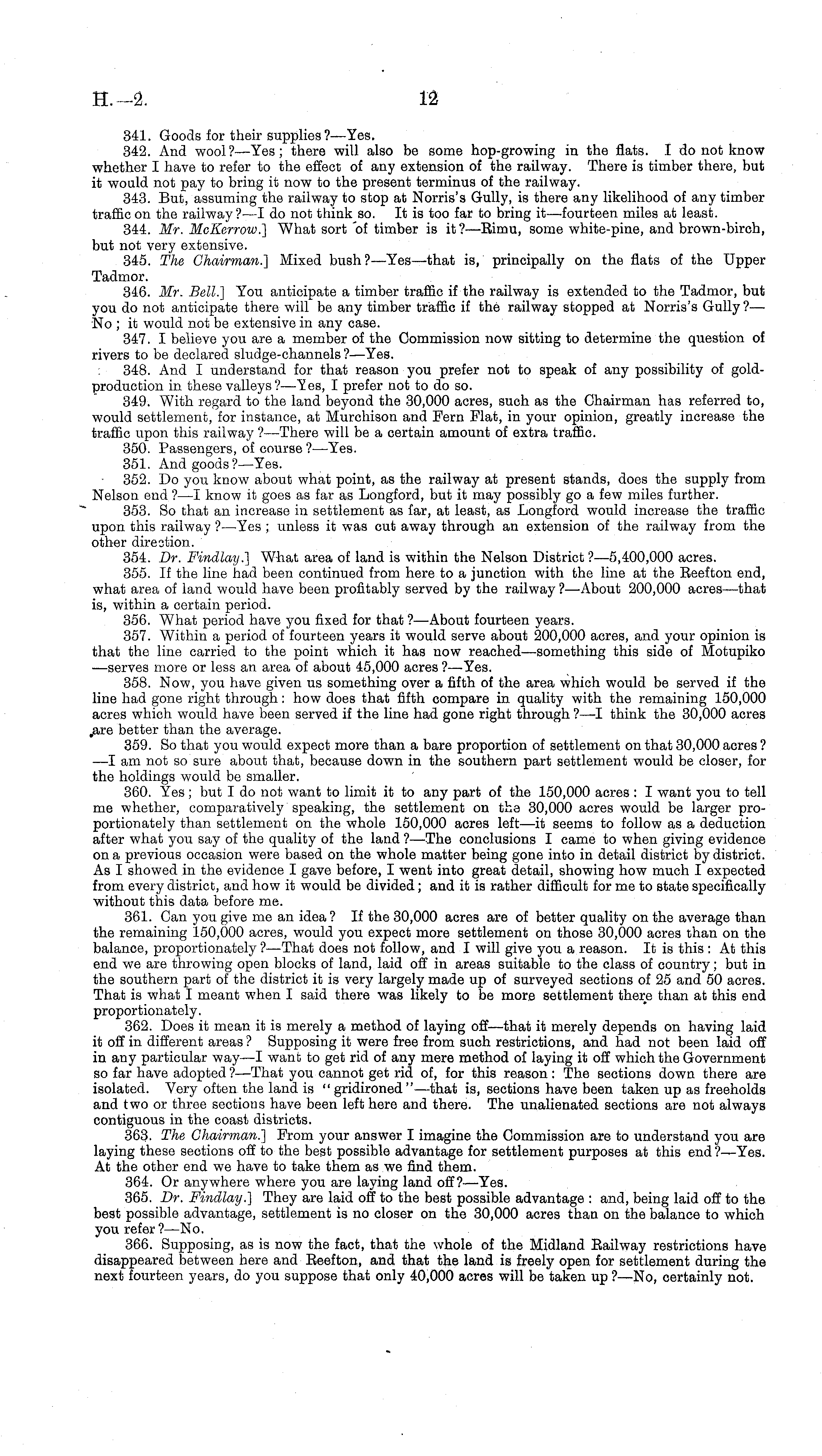 341. Goods for their supplies ?—Yes. 342. And wool? —Yes; there will also be some hop-growing in the flats. I do not know whether I have to refer to the effect of any extension of the railway. There is timber there, but it would not pay to bring it now to the present terminus of the railway. 343. But, assuming the railway to stop at Norris's Gully, is there any likelihood of any timber traffic on the railway ?—I do not think so. It is too far to bring it—fourteen miles at least. 344. Mr. McEerrow.] What sort of timber is it ?—Eimu, some white-pine, and brown-birch, but not very extensive. 345. The Chairman.] Mixed bush ? —Yes—that is, principally on the flats of the Upper Tadmor. 346. Mr. Bell.] You anticipate a timber traffic if the railway is extended to the Tadmor, but you do not anticipate there will be any timber traffic if the railway stopped at Norris's Gully?— No ; it would not be extensive in any case. 347. I believe you are a member of the Commission now sitting to determine the question of rivers to be declared sludge-channels ? —Yes. : 348. And I understand for that reason you prefer not to speak of any possibility of goldproduction in these valleys? —Yes, I prefer not to do so. 349. With regard to the land beyond the 30,000 acres, such as the Chairman has referred to, would settlement, for instance, at Murchison and Fern Flat, in your opinion, greatly increase the traffic upon this railway ? —There will be a certain amount of extra traffic. 350. Passengers, of course ? —Yes. 351. And goods ?—Yes. 352. Do you know about what point, as the railway at present stands, does the supply from Nelson end ?—I know it goes as far as Longford, but it may possibly go a few miles further. 353. So that an increase in settlement as far, at least, as Longford would increase the traffic upon this railway ? —Yes ; unless it was cut away through an extension of the railway from the other direotion. 354. Dr. Findlay.] What area of land is within the Nelson District?—s,4oo,ooo acres. 355. If the line had been continued from here to a junction with the line at the Eeefton end, what area of land would have been profitably served by the railway ?—About 200,000 acres—that is, within a certain period. 356. What period have you fixed for that ?—About fourteen years. 357. Within a period of fourteen years it would serve about 200,000 acres, and your opinion is that the line carried to the point which it has now reached—something this side of Motupiko —serves more or less an area of about 45,000 acres ?—Yes. 358. Now, you have given us something over a fifth of the area which would be served if the line had gone right through: how does that fifth compare in quality with the remaining 150,000 acres which would have been served if the line had gone right through ?—I think the 30,000 acres ,are better than the average. 359. So that you would expect more than a bare proportion of settlement on that 30,000 acres ? —I am not so sure about that, because down in the southern part settlement would be closer, for the holdings would be smaller. 360. Yes; but Ido not want to limit it to any part of the 150,000 acres : I want you to tell me whether, comparatively speaking, the settlement on the 30,000 acres would be larger proportionately than settlement on the whole 150,000 acres left—it seems to follow as a deduction after what you say of the quality of the land ?—The conclusions I came to when giving evidence on a previous occasion were based on the whole matter being gone into in detail district by district. As I showed in the evidence I gave before, I went into great detail, showing how much I expected from every district, and how it would be divided; and it is rather difficult for me to state specifically without this data before me. 361. Can you give me an idea ? If the 30,000 acres are of better quality on the average than the remaining 150,000 acres, would you expect more settlement on those 30,000 acres than on the balance, proportionately ? —That does not follow, and I will give you a reason. It is this :At this end we are throwing open blocks of land, laid off in areas suitable to the class of country; but in the southern part of the district it is very largely made up of surveyed sections of 25 and 50 acres. That is what I meant when I said there was likely to be more settlement there than at this end proportionately. 362. Does it mean it is merely a method of laying off—that it merely depends on having laid it off in different areas ? Supposing it were free from such restrictions, and had not been laid off in any particular way—l want to get rid of any mere method of laying it off which the Government so far have adopted ?—That you cannot get rid of, for this reason : The sections down there are isolated. Very often the land is "gridironed"—that is, sections have been taken up as freeholds and two or three sections have been left here and there. The unalienated sections are not always contiguous in the coast districts. 363. The Chairman.] From your answer I imagine the Commission are to understand you are laying these sections off to the best possible advantage for settlement purposes at this end ?—Yes. At the other end we have to take them as we find them. 364. Or anywhere where you are laying land off?— Yes. 365. Dr. Findlay.] They are laid off to the best possible advantage : and, being laid off to the best possible advantage, settlement is no closer on the 30,000 acres than on the balance to which you refer ?—No. 366. Supposing, as is now the fact, that the whole of the Midland Eailway restrictions have disappeared between here and Eeefton, and that the land is freely open for settlement during the next fourteen years, do you suppose that only 40,000 acres will be taken up ? —No, certainly not.