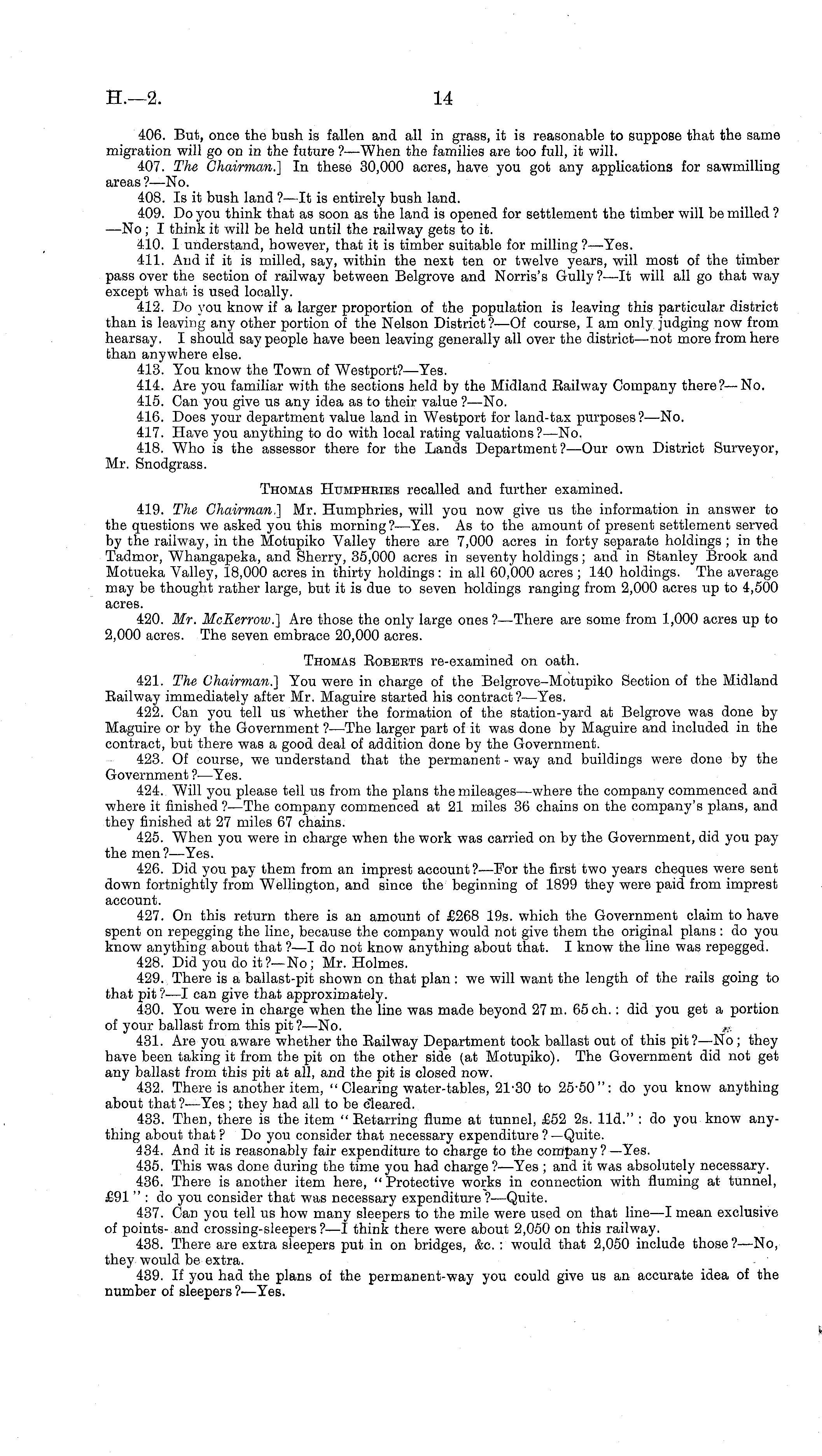 406. But, once the bush is fallen and all in grass, it is reasonable to suppose that the same migration will go on in the future ?—When the families are too full, it will. 407. The Chairman.'] In these 30,000 acres, have you got any applications for sawmilling areas ?—No. 408. Is it bush land ?—lt is entirely bush land. 409. Do you think that as soon as the land is opened for settlement the timber will be milled ? —No; I think it will be held until the railway gets to it. 410. I understand, however, that it is timber suitable for milling ?—Yes. 411. And if it is milled, say, within the next ten or twelve years, will most of the timber pass over the section of railway between Belgrove and Norris's Gully? —It will all go that way except what is used locally. 412. Do you know if a larger proportion of the population is leaving this particular district than is leaving any other portion of the Nelson District?—Of course, I am only judging now from hearsay. I should say people have been leaving generally all over the district—not more from here than anywhere else. 413. You know the Town of Westport?—Yes. 414. Are you familiar with the sections held by the Midland Eailway Company there?— No. 415. Can you give us any idea as to their value ? —No. 416. Does your department value land in Westport for land-tax purposes? —No. 417. Have you anything to do with local rating valuations?— No. 418. Who is the assessor there for the Lands Department?— Our own District Surveyor, Mr. Snodgrass. Thomas Humphries recalled and further examined. 419. The Chairman] Mr. Humphries, will you now give us the information in answer to the questions we asked you this morning?— Yes. As to the amount of present settlement served by the railway, in the Motupiko Valley there are 7,000 acres in forty separate holdings ; in the Tadmor, Whangapeka, and Sherry, 35,000 acres in seventy holdings; and in Stanley Brook and Motueka Valley, 18,000 acres in thirty holdings :in all 60,000 acres ; 140 holdings. The average may be thought rather large, but it is due to seven holdings ranging from 2,000 acres up to 4,500 acres. 420. Mr. McEerrow.] Are those the only large ones?— There are some from 1,000 acres up to 2,000 acres. The seven embrace 20,000 acres. Thomas Eoberts re-examined on oath. 421. The Chairman.] You were in charge of the Belgrove-Motupiko Section of the Midland Eailway immediately after Mr. Maguire started his contract ?—Yes. 422. Can you tell us whether the formation of the station-yard at Belgrove was done by Maguire or by the Government ?—The larger part of it was done by Maguire and included in the contract, but there was a good deal of addition done by the Government. 423. Of course, we understand that the permanent - way and buildings were done by the Government ?—Yes. 424. Will you please tell us from the plans the mileages —where the company commenced and where it finished? —The company commenced at 21 miles 36 chains on the company's plans, and they finished at 27 miles 67 chains. 425. When you were in charge when the work was carried on by the Government, did you pay the men?— Yes. 426. Did you pay them from an imprest account ?■—For the first two years cheques were sent down fortnightly from Wellington, and since the beginning of 1899 they were paid from imprest account. 427. On this return there is an amount of £268 19s. which the Government claim to have spent on repegging the line, because the company would not give them the original plans : do you know anything about that ?—I do not know anything about that. I know the line was repegged. 428.' Did you do it?—No; Mr. Holmes. 429. There is a ballast-pit shown on that plan : we will want the length of the rails going to that pit ?—I can give that approximately. 430. You were in charge when the line was made beyond 27 m. 65 eh.: did you get a portion of your ballast from this pit ?—No. 431. Are you aware whether the Eailway Department took ballast out of this pit?—No; they have been taking it from the pit on the other side (at Motupiko). The Government did not get any ballast from this pit at all, and the pit is closed now. 432. There is another item, " Clearing water-tables, 21-30 to 25-50": do you know anything about that?— Yes ; they had all to be cleared. 433. Then, there is the item " Eetarring flume at tunnel, £52 2s. lid." : do you know anything about that ? Do you consider that necessary expenditure ? —Quite. 434. And it is reasonably fair expenditure to charge to the company ? —Yes. 435. This was done during the time you had charge ?—Yes ; and it was absolutely necessary. 436. There is another item here, " Protective works in connection with fluming at tunnel, £91 " : do you consider that was necessary expenditure ?•—Quite. 437. Can you tell us how many sleepers to the mile were used on that line —I mean exclusive of points- and crossing-sleepers ?—I think there were about 2,050 on this railway. 438. There are extra sleepers put in on bridges, &c. : would that 2,050 include those ? —No, they would be extra. 439. If you had the plans of the permanent-way you could give us an accurate idea of the number of sleepers ?—Yes.