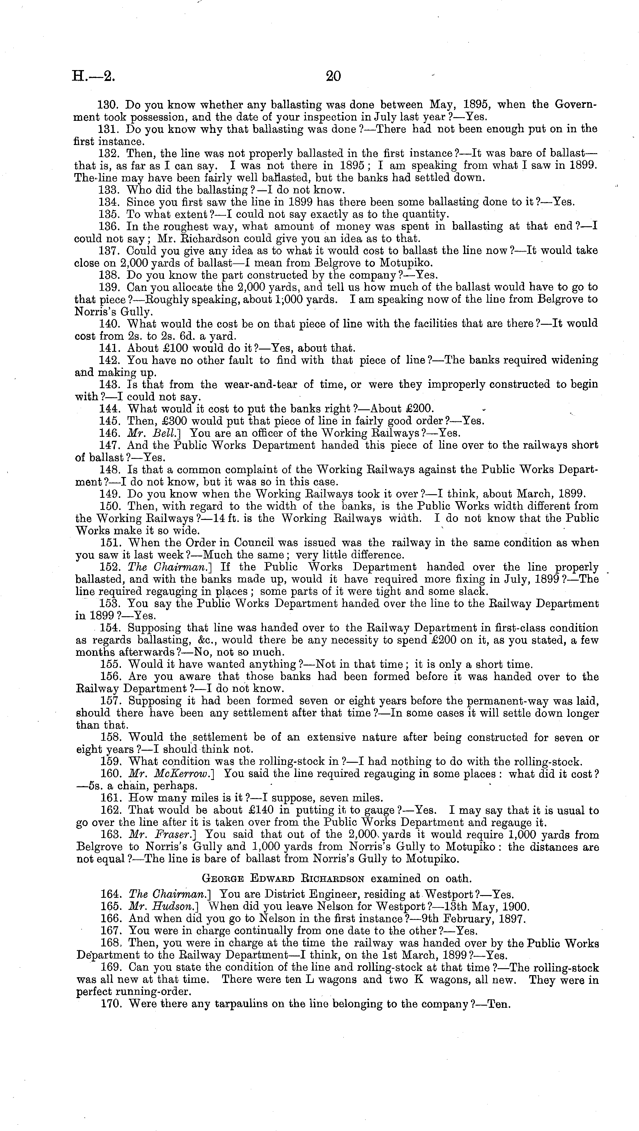130. Do you know whether any ballasting was done between May, 1895, when the Government took possession, and the date of your inspection in July last year ? —Yes. 131. Do you know why that ballasting was done ?—There had not been enough put on in the first instance. 132. Then, the line was not properly ballasted in the first instance?—lt was bare of ballast— that is, as far as I can say. I was not there in 1895 ; I am speaking from what I saw in 1899. The-line may have been fairly well ballasted, but the banks had settled down. 133. Who did the ballasting ?—I do not know. 134. Since you first saw the line in 1899 has there been some ballasting done to it ? —Yes. 135. To what extent ? —I could not say exactly as to the quantity. 136. In the roughest way, what amount of money was spent in ballasting at that end ?—I could not say; Mr. Richardson could give you an idea as to that. 137. Could you give any idea as to what it would cost to ballast the line now?—lt would take close on 2,000 yards of ballast—l mean from Belgrove to Motupiko. 138. Do you know the part constructed by the company?— Yes. 139. Can you allocate the 2,000 yards, and tell us how much of the ballast would have to go to that piece ?—Eoughly speaking, about 1,000 yards. lam speaking now of the line from Belgrove to Norris's Gully. 140. What would the cost be on that piece of line with the facilities that are there? —It would cost from 2s. to 2s. 6d. a yard. 141. About £100 would do it?— Yes, about that. 142. You have no other fault to find with that piece of line ?—-The banks required widening and making up. 143. Is that from the wear-and-tear of time, or were they improperly constructed to begin with ?—I could not say. 144. What would it cost to put the banks right ?—About £200. 145. Then, £300 would put that piece of line in fairly good order?— Yes. 146. Mr. Bell.'] You are an officer of the Working Railways?— Yes. 147. And the Public Works Department handed this piece of line over to the railways short of ballast?— Yes. 148. Is that a common complaint of the Working Railways against the Public Works Department ? —I do not know, but it was so in this case. 149. Do you know when the Working Railways took it over ? —I think, about March, 1899. 150. Then, with regard to the width of the banks, is the Public Works width different from the Working Railways ?—l4 ft. is the Working Railways width. I do not know that the Public Works make it so wide. 151. When the Order in Council was issued was the railway in the same condition as when you saw it last week?— Much the same; very little difference. 152. The Chairman.] If the Public Works Department handed over the line properly ballasted, and with the banks made up, would it have required more fixing in July, 1899 ?—The line required regauging in places ; some parts of it were tight and some slack. 153. You say the Public Works Department handed over the line to the Railway Department in 1899 ?—Yes. 154. Supposing that line was handed over to the Railway Department in first-class condition as regards ballasting, &c, would there be any necessity to spend £200 on it, as you stated, a few months afterwards ?—No, not so much. 155. Would it have wanted anything ?—Not in that time ; it is only a short time. 156. Are you aware that those banks had been formed before it was handed over to the Railway Department ?—I do not know. 157. Supposing it had been formed seven or eight years before the permanent-way was laid, should there have been any settlement after that time ?—ln some cases it will settle down longer than that. 158. Would the settlement be of an extensive nature after being constructed for seven or eight years ? —I should think not. 159. What condition was the rolling-stock in ?—I had nothing to do with the rolling-stock. 160. Mr. McKerrow.] You said the line required regauging in some places : what did it cost ? —ss. a chain, perhaps. 161. How many miles is it ?—I suppose, seven miles. 162. That would be about £140 in putting it to gauge ?—Yes. I may say that it is usual to go over the line after it is taken over from the Public Works Department and regauge it. 163. Mr. Fraser.] You said that out of the 2,000, yards it would require 1,000 yards from Belgrove to Norris's Gully and 1,000 yards from Norris's Gully to Motupiko : the distances are not equal ?—The line is bare of ballast from Norris's Gully to Motupiko. Geobge Edwaed Richardson examined on oath. 164. The Chairman.] You are District Engineer, residing at Westport?—Yes. 165. Mr. Hudson.] When did you leave Nelson for Westport ?—l3th May, 1900. 166. And when did you go to Nelson in the first instance ?—9th February, 1897. 167. You were in charge continually from one date to the other?— Yes. 168. Then, you were in charge at the time the railway was handed over by the Public Works Department to the Railway Department—l think, on the Ist March, 1899 ?—Yes. 169. Can you state the condition of the line and rolling-stock at that time ? —The rolling-stock was all new at that time. There were ten L wagons and two X wagons, all new. They were in perfect running-order. 170. Were there any tarpaulins on the line belonging to the company ?—Ten.