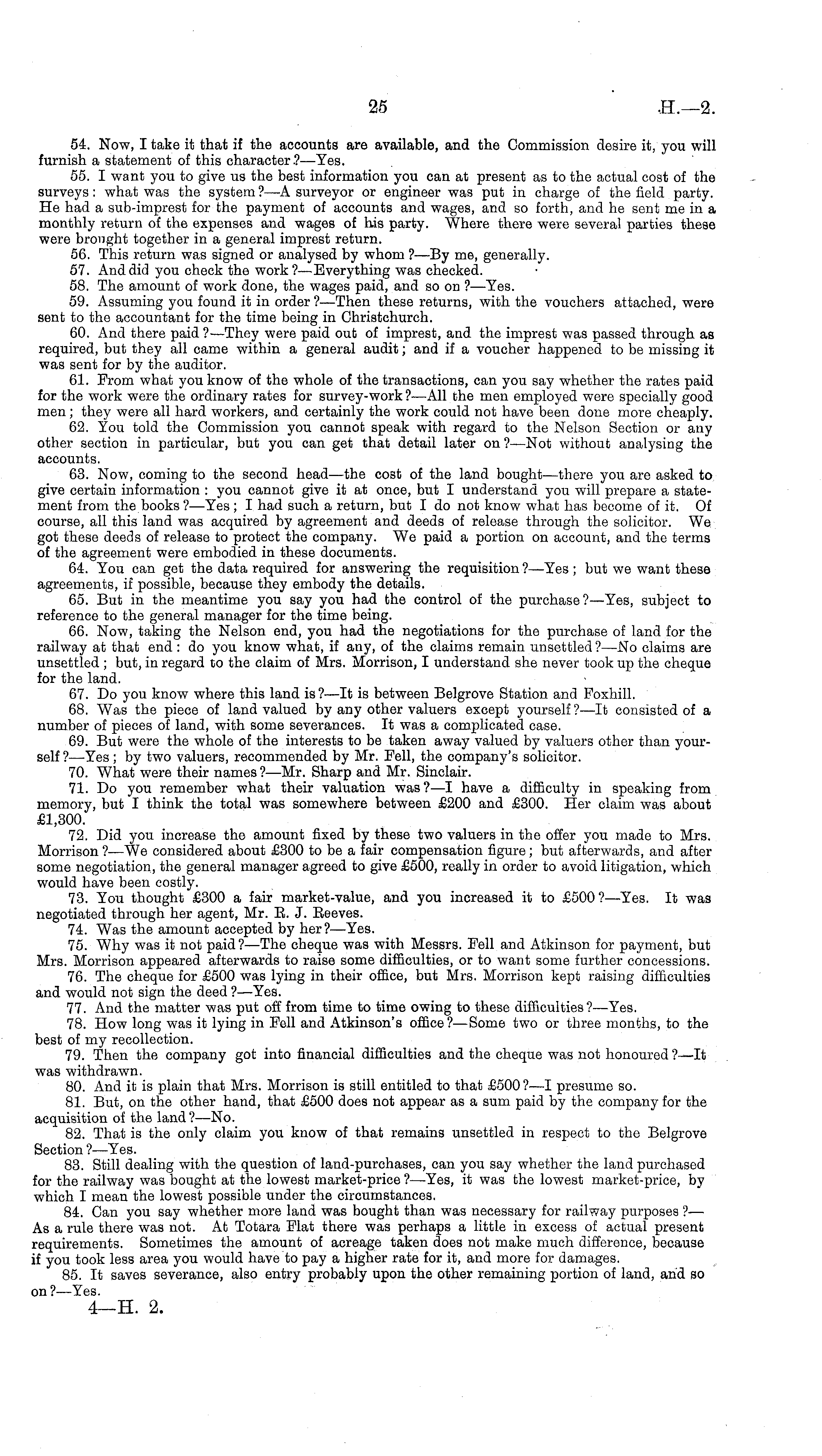 54. Now, I take it that if the accounts are available, and the Commission desire it, you will furnish a statement of this character?— Yes. 55. I want you to give us the best information you can at present as to the actual cost of the surveys: what was the system ?—A surveyor or engineer was put in charge of the field party. He had a sub-imprest for the payment of accounts and wages, and so forth, and he sent me in a monthly return of the expenses and wages of his party. Where there were several parties these were brought together in a general imprest return. 56. This return was signed or analysed by whom ? —By me, generally. 57. And did you check the work ?—Everything was checked. 58. The amount of work done, the wages paid, and so on ?—Yes. 59. Assuming you found it in order ?—Then these returns, with the vouchers attached, were sent to the accountant for the time being in Christchurch. 60. And there paid ? —They were paid out of imprest, and the imprest was passed through as required, but they all came within a general audit; and if a voucher happened to be missing it was sent for by the auditor. 61. From what you know of the whole of the transactions, can you say whether the rates paid for the work were the ordinary rates for survey-work ?—All the men employed were specially good men; they were all hard workers, and certainly the work could not have been done more cheaply. 62. You told the Commission you cannot speak with regard to the Nelson Section or any other section in particular, but you can get that detail later on ?—Not without analysing the accounts. 63. Now, coming to the second head—the cost of the land bought—there you are asked to give certain information : you cannot give it at once, but I understand you will prepare a statement from the books ?—Yes ; I had such a return, but I do not know what has become of it. Of course, all this land was acquired by agreement and deeds of release through the solicitor. We got these deeds of release to protect the company. We paid a portion on account, and the terms of the agreement were embodied in these documents. 64. You can get the data required for answering the requisition?— Yes; but we want these agreements, if possible, because they embody the details. 65. But in the meantime you say you had the control of the purchase?— Yes, subject to reference to the general manager for the time being. 66. Now, taking the Nelson end, you had the negotiations for the purchase of land for the railway at that end : do you know what, if any, of the claims remain unsettled ?—No claims are unsettled ; but, in regard to the claim of Mrs. Morrison, I understand she never took up the cheque for the land. 67. Do you know where this land is?—lt is between Belgrove Station and Poxhill. 68. Was the piece of land valued by any other valuers except yourself ? —lt consisted of a number of pieces of land, with some severances. It was a complicated case. 69. But were the whole of the interests to be taken away valued by valuers other than yourself ? —Yes ; by two valuers, recommended by Mr. Fell, the company's solicitor. 70. What were their names ? —Mr. Sharp and Mr. Sinclair. 71. Do you remember what their valuation was ?—I have a difficulty in speaking from memory, but I think the total was somewhere between £200 and £300. Her claim was about £1,300. 72. Did you increase the amount fixed by these two valuers in the offer you made to Mrs. Morrison ?—We considered about £300 to be a fair compensation figure; but afterwards, and after some negotiation, the general manager agreed to give £500, really in order to avoid litigation, which would have been costly. 73. You thought £300 a fair market-value, and you increased it to £500 ?—Yes. It was negotiated through her agent, Mr. E. J. Eeeves. 74. Was the amount accepted by her?— Yes. 75. Why was it not paid?— The cheque was with Messrs. Fell and Atkinson for payment, but Mrs. Morrison appeared afterwards to raise some difficulties, or to want some further concessions. 76. The cheque for £500 was lying in their office, but Mrs. Morrison kept raising difficulties and would not sign the deed ? —Yes. 77. And the matter was put off from time to time owing to these difficulties ? —Yes. 78. How long was it lying in Fell and Atkinson's office?— Some two or three months, to the best of my recollection. 79. Then the company got into financial difficulties and the cheque was not honoured ?—lt was withdrawn. 80. And it is plain that Mrs. Morrison is still entitled to that £500?— I presume so. 81. But, on the other hand, that £500 does not appear as a sum paid by the company for the acquisition of the land ?—No. 82. That is the only claim you know of that remains unsettled in respect to the Belgrove Section ?—Yes. 83. Still dealing with the question of land-purchases, can you say whether the land purchased for the railway was bought at the lowest market-price ?—Yes, it was the lowest market-price, by which I mean the lowest possible under the circumstances. 84. Can you say whether more land was bought than was necessary for railway purposes ?— As a rule there was not. At Totara Flat there was perhaps a little in excess of actual present requirements. Sometimes the amount of acreage taken does not make much difference, because if you took less area you would have to pay a higher rate for it, and more for damages. 85. It saves severance, also entry probably upon the other remaining portion of land, and so on ?—Yes. 4—H. 2.