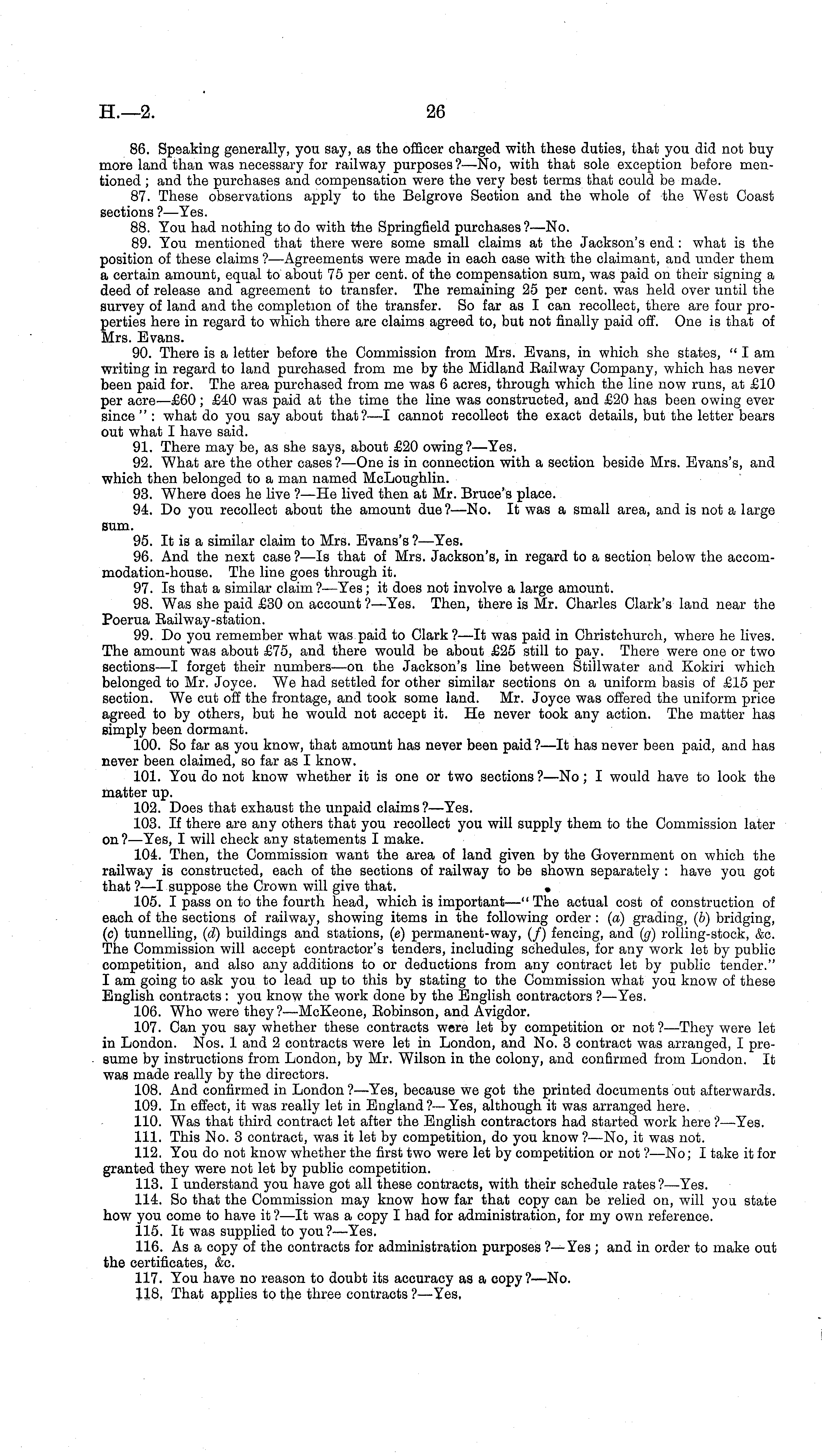 86. Speaking generally, you say, as the officer charged with these duties, that you did not buy more land than was necessary for railway purposes ?—No, with that sole exception before mentioned ; and the purchases and compensation were the very best terms that could be made. 87. These observations apply to the Belgrove Section and the whole of the West Coast sections ? —Yes. 88. You had nothing to do with t-he Springfield purchases?— No. 89. You mentioned that there were some small claims at the Jackson's end: what is the position of these claims ? —Agreements were made in each case with the claimant, and under them a certain amount, equal to about 75 per cent, of the compensation sum, was paid on their signing a deed of release and agreement to transfer. The remaining 25 per cent, was held over until the survey of land and the completion of the transfer. So far as I can recollect, there are four properties here in regard to which there are claims agreed to, but not finally paid off. One is that of Mrs. Evans. 90. There is a letter before the Commission from Mrs. Evans, in which she states, " I am writing in regard to land purchased from me by the Midland Bailway Company, which has never been paid for. The area purchased from me was 6 acres, through which the line now runs, at £10 per acre—£6o ; £40 was paid at the time the line was constructed, and £20 has been owing ever since " : what do you say about that?—l cannot recollect the exact details, but the letter bears out what I have said. 91. There may be, as she says, about £20 owing?— Yes. 92. What are the other cases?— One is in connection with a section beside Mrs. Evans's, and which then belonged to a man named McLoughlin. 93. Where does he live ? —He lived then at Mr. Bruce's place. 94. Do you recollect about the amount due?— No. It was a small area, and is not a large sum. 95. It is a similar claim to Mrs. Evans's ?—Yes. 96. And the next case ? —ls that of Mrs. Jackson's, in regard to a section below the accom-modation-house. The line goes through it. 97. Is that a similar claim ?—Yes; it does not involve a large amount. 98. Was she paid £30 on account ?—Yes. Then, there is Mr. Charles Clark's land near the Poerua Eailway-station. 99. Do you remember what was paid to Clark?—lt was paid in Christchurch, where he lives. The amount was about £75, and there would be about £25 still to pay. There were one or two sections —I forget their numbers—on the Jackson's line between Stillwater and Kokiri which belonged to Mr. Joyce. We had settled for other similar sections On a uniform basis of £15 per section. We cut off the frontage, and took some land. Mr. Joyce was offered the uniform price agreed to by others, but he would not accept it. He never took any action. The matter has simply been dormant. 100. So far as you know, that amount has never been paid ?—lt has never been paid, and has never been claimed, so far as I know. 101. You do not know whether it is one or two sections ?—No; I would have to look the matter up. 102. Does that exhaust the unpaid claims?— Yes. 103. If there are any others that you recollect you will supply them to the Commission later on ?—Yes, I will check any statements I make. 104. Then, the Commission want the area of land given by the Government on which the railway is constructed, each of the sections of railway to be shown separately : have you got that ? —I suppose the Crown will give that. . 105. I pass on to the fourth head, which is important—"The actual cost of construction of each of the sections of railway, showing items in the following order : (a) grading, (b) bridging, (c) tunnelling, (d) buildings and stations, (c) permanent-way, (/) fencing, and (g) rolling-stock, &c. The Commission will accept contractor's tenders, including schedules, for any work let by public competition, and also any additions to or deductions from any contract let by public tender." I am going to ask you to lead up to this by stating to the Commission what you know of these English contracts : you know the work done by the English contractors ? —Yes. 106. Who were they?'—McKeone, Eobinson, and Avigdor. 107. Can you say whether these contracts were let by competition or not ?—They were let in London. Nos. 1 and 2 contracts were let in London, and No. 3 contract was arranged, I presume by instructions from London, by Mr. Wilson in the colony, and confirmed from London. It was made really by the directors. 108. And confirmed in London ?—Yes, because we got the printed documents out afterwards. 109. In effect, it was really let in England ?-—Yes, although it was arranged here. 110. Was that third contract let after the English contractors had started work here ?—Yes. 111. This No. 3 contract, was it let by competition, do you know ?—No, it was not. 112. You do not know whether the first two were let by competition or not ?—No; I take it for granted they were not let by public competition. 113. I understand you have got all these contracts, with their schedule rates?— Yes. 114. So that the Commission may know how far that copy can be relied on, will you state how you come to have it?—lt was a copy I had for administration, for my own reference. 115. It was supplied to you?— Yes. 116. As a copy of the contracts for administration purposes ? —Yes ; and in order to make out the certificates, &c. 117. You have no reason to doubt its accuracy as a copy?— No. 118. That applies to the three contracts ? —Yes,