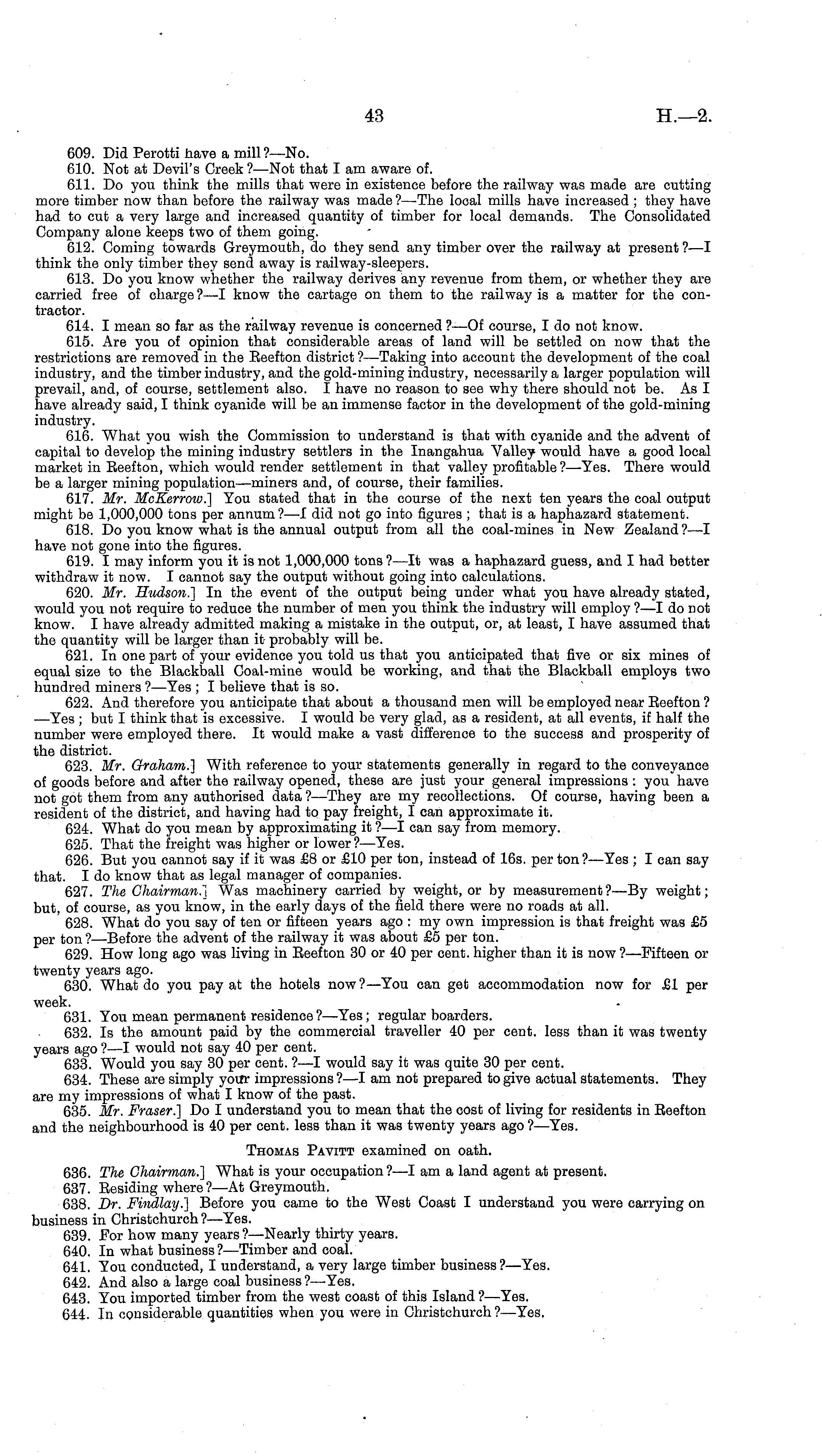 609. Did Perotti have a mill ?—No. 610. Not at Devil's Creek ?—Not that I am aware of. 611. Do you think the mills that were in existence before the railway was made are cutting more timber now than before the railway was made ?—The local mills have increased ; they have had to cut a very large and increased quantity of timber for local demands. The Consolidated Company alone keeps two of them going. 612. Coming towards Greymouth, do they send any timber over the railway at present ?—I think the only timber they send away is railway-sleepers. 613. Do you know whether the railway derives any revenue from them, or whether they are carried free of charge ?—I know the cartage on them to the railway is a matter for the contractor. 614. I mean so far as the railway revenue is concerned ?—Of course, I do not know. 615. Are you of opinion that considerable areas of land will be settled on now that the restrictions are removed in the Eeefton district ? —Taking into account the development of the coal industry, and the timber industry, and the gold-mining industry, necessarily a larger population will prevail, and, of course, settlement also. I have no reason to see why there should not be. As I have already said, I think cyanide will be an immense factor in the development of the gold-mining industry. 616. What you wish the Commission to understand is that with cyanide and the advent of capital to develop the mining industry settlers in the Inangahua Valley would have a good local market in Beefton, which would render settlement in that valley profitable?— Yes. There would be a larger mining population —miners and, of course, their families. 617. Mr. McKerrow.] You stated that in the course of the next ten years the coal output might be 1,000,000 tons per annum?—l did not go into figures ; that is a haphazard statement. 618. Do you know what is the annual output from all the coal-mines in New Zealand ?—I have not gone into the figures. 619. I may inform you it is not 1,000,000 tons ? —lt was a haphazard guess, and I had better withdraw it now. I cannot say the output without going into calculations. 620. Mr. Hudson.] In the event of the output being under what you have already stated, would you not require to reduce the number of men you think the industry will employ ?—I do not know. I have already admitted making a mistake in the output, or, at least, I have assumed that the quantity will be larger than it probably will be. 621. In one part of your evidence you told us that you anticipated that five or six mines of equal size to the Blackball Coal-mine would be working, and that the Blackball employs two hundred miners ? —Yes ; I believe that is so. 622. And therefore you anticipate that about a thousand men will be employed near Eeefton ? —Yes ; but I think that is excessive. I would be very glad, as a resident, at all events, if half the number were employed there. It would make a vast difference to the success and prosperity of the district. 623. Mr. Graham.] With reference to your statements generally in regard to the conveyance of goods before and after the railway opened, these are just your general impressions : you have not got them from any authorised data ? —They are my recollections. Of course, having been a resident of the district, and having had to pay freight, I can approximate it. 624. What do you mean by approximating it ?—I can say from memory. 625. That the freight was higher or lower?— Yes. 626. But you cannot say if it was £8 or £10 per ton, instead of 16s. per ton? —Yes ; I can say that. Ido know that as legal manager of companies. 627. The Chairman.'] Was machinery carried by weight, or by measurement?—By weight; but, of course, as you know, in the early days of the field there were no roads at all. 628. What do you say of ten or fifteen years ago : my own impression is that freight was £5 per ton?— Before the advent of the railway it was about £5 per ton. 629. How long ago was living in Eeefton 30 or 40 per cent, higher than it is now ?—Fifteen or twenty years ago. 630. What do you pay at the hotels now?— You can get accommodation now for £1 per week. 631. You mean permanent residence? —Yes; regular boarders. 632. Is the amount paid by the commercial traveller 40 per cent, less than it was twenty years ago ?—I would not say 40 per cent. 633. Would you say 30 per cent. ?—I would say it was quite 30 per cent. 634. These are simply yotfr impressions?—l am not prepared to give actual statements. They are my impressions of what I know of the past. 635. Mr. Fraser.] Do I understand you to mean that the cost of living for residents in Eeefton and the neighbourhood is 40 per cent, less than it was twenty years ago ?—Yes. Thomas Pavitt examined on oath. 636. The Chairman.] What is your occupation?—l am a land agent at present. 637. Eesiding where?—At Greymouth. 638. Dr. FituLlay.] Before you came to the West Coast I understand you were carrying on business in Christchurch ?—Yes. 639. For how many years? —Nearly thirty years. 640. In what business ?—Timber and coal. 641. You conducted, I understand, a very large timber business?— Yes. 642. And also a large coal business? —Yes. 643. You imported timber from the west coast of this Island ?—Yes. 644. In considerable quantities when you were in Christchurch ? —Yes.