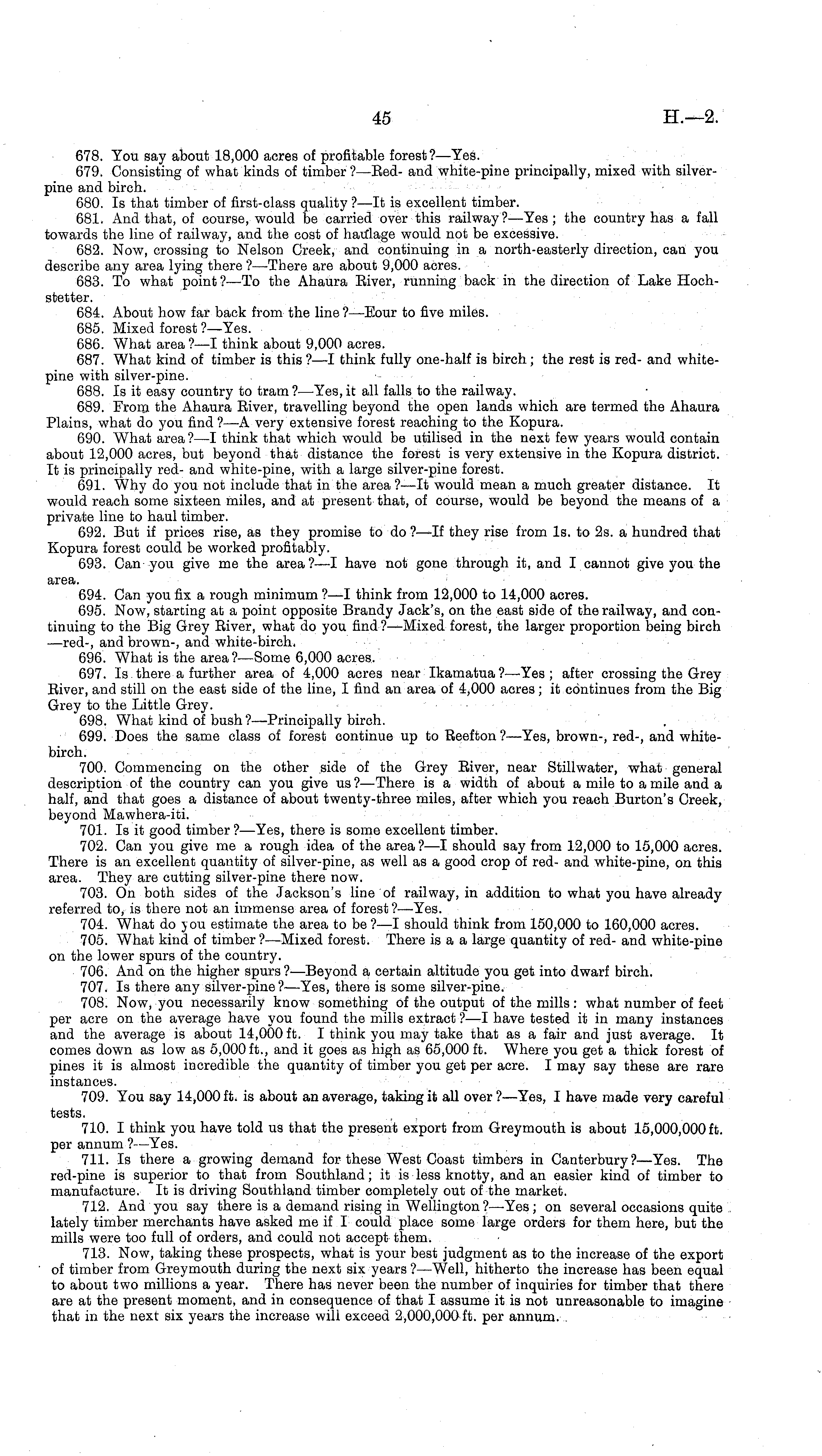 678. You say about 18,000 acres of profitable forest?— Yes. 679. Consisting of what kinds of timber ? —Eed- and white-pine principally, mixed with silverpine and birch. 680. Is that timber of first-class quality ? —lt is excellent timber. 681. And that, of course, would be carried over this railway? —Yes; the country has a fall towards the line of railway, and the cost of haulage would not be excessive. 682. Now, crossing to Nelson Creek, and continuing in a north-easterly direction, can you describe any area lying there ?—There are about 9,000 acres. 683. To what point ?—To the Ahaura Eiver, running back in the direction of Lake Hochstetter. 684. About how far back from the line ? —Eour to five miles. 685. Mixed forest ?—Yes. 686. What area ?—I think about 9,000 acres. 687. What kind of timber is this ?—I think fully one-half is birch; the rest is red- and whitepine with silver-pine. 688. Is it easy country to tram ? —Yes, it all falls to the railway. 689. From the Ahaura Eiver, travelling beyond the open lands which are termed the Ahaura Plains, what do you find ?—A very extensive forest reaching to the Kopura. 690. What area?—l think that which would be utilised in the next few years would contain about 12,000 acres, but beyond that distance the forest is very extensive in the Kopura district. It is principally red- and white-pine, with a large silver-pine forest. 691. Why do you not include that in the area ?—lt would mean a much greater distance. It would reach some sixteen miles, and at present that, of course, would be beyond the means of a private line to haul timber. 692. But if prices rise, as they promise to do ?—lf they rise from Is. to 2s. a hundred that Kopura forest could be worked profitably. 693. Can you give me the area?—l have not gone through it, and I cannot give you the area. 694. Can you fix a rough minimum ?—I think from 12,000 to 14,000 acres. 695. Now, starting at a point opposite Brandy Jack's, on the east side of the railway, and continuing to the Big Grey Eiver, what do you find ?—Mixed forest, the larger proportion being birch —red-, and brown-, and white-birch. 696. What is the area?— Some 6,000 acres. 697. Is there a further area of 4,000 acres near Ikamatua?—Yes; after crossing the Grey Eiver, and still on the east side of the line, I find an area of 4,000 acres; it continues from the Big Grey to the Little Grey. 698. What kind of bush ? —Principally birch. 699. Does the same class of forest continue up to Eeefton?—Yes, brown-, red-, and whitebirch. 700. Commencing on the other side of the Grey Eiver, near Stillwater, what general description of the country can you give us ?—There is a width of about a mile to a mile and a half, and that goes a distance of about twenty-three miles, after which you reach Burton's Creek, beyond Mawhera-iti. 701. Is it good timber?— Yes, there is some excellent timber. 702. Can you give me a rough idea of the area ? —I should say from 12,000 to 15,000 acres. There is an excellent quantity of silver-pine, as well as a good crop of red- and white-pine, on this area. They are cutting silver-pine there now. 703. On both sides of the Jackson's line of railway, in addition to what you have already referred to, is there not an immense area of forest?—-Yes. 704. What do you estimate the area to be ? —I should think from 150,000 to 160,000 acres. 705. What kind of timber ?—Mixed forest. There is a a large quantity of red- and white-pine on the lower spurs of the country. 706. And on the higher spurs ?—Beyond a certain altitude you get into dwarf birch. 707. Is there any silver-pine? —Yes, there is some silver-pine. 708. Now, you necessarily know something of the output of the mills: what number of feet per acre on the average have you found the mills extract ? —I have tested it in many instances and the average is about 14,000 ft. I think you may take that as a fair and just average. It comes down as low as 5,000 ft., and it goes as high as 65,000 ft. Where you get a thick forest of pines it is almost incredible the quantity of timber you get per acre. I may say these are rare instances. 709. You say 14,000 ft. is about an average, taking it all over ?—Yes, I have made very careful tests. 710. I think you have told us that the present export from Greymouth is about 15,000,000 ft. per annum ?—Yes. 711. Is there a growing demand for these West Coast timbers in Canterbury?— Yes. The red-pine is superior to that from Southland; it is less knotty, and an easier kind of timber to manufacture. It is driving Southland timber completely out of the market. 712. And you say there is a demand rising in Wellington?— Yes; on several occasions quite lately timber merchants have asked me if I could place some large orders for them here, but the mills were too full of orders, and could not accept them. 713. Now, taking these prospects, what is your best judgment as to the increase of the export of timber from Greymouth during the next six years ? —Well, hitherto the increase has been equal to about two millions a year. There has never been the number of inquiries for timber that there are at the present moment, and in consequence of that I assume it is not unreasonable to imagine that in the next six years the increase will exceed 2,000,000 ft. per annum. -