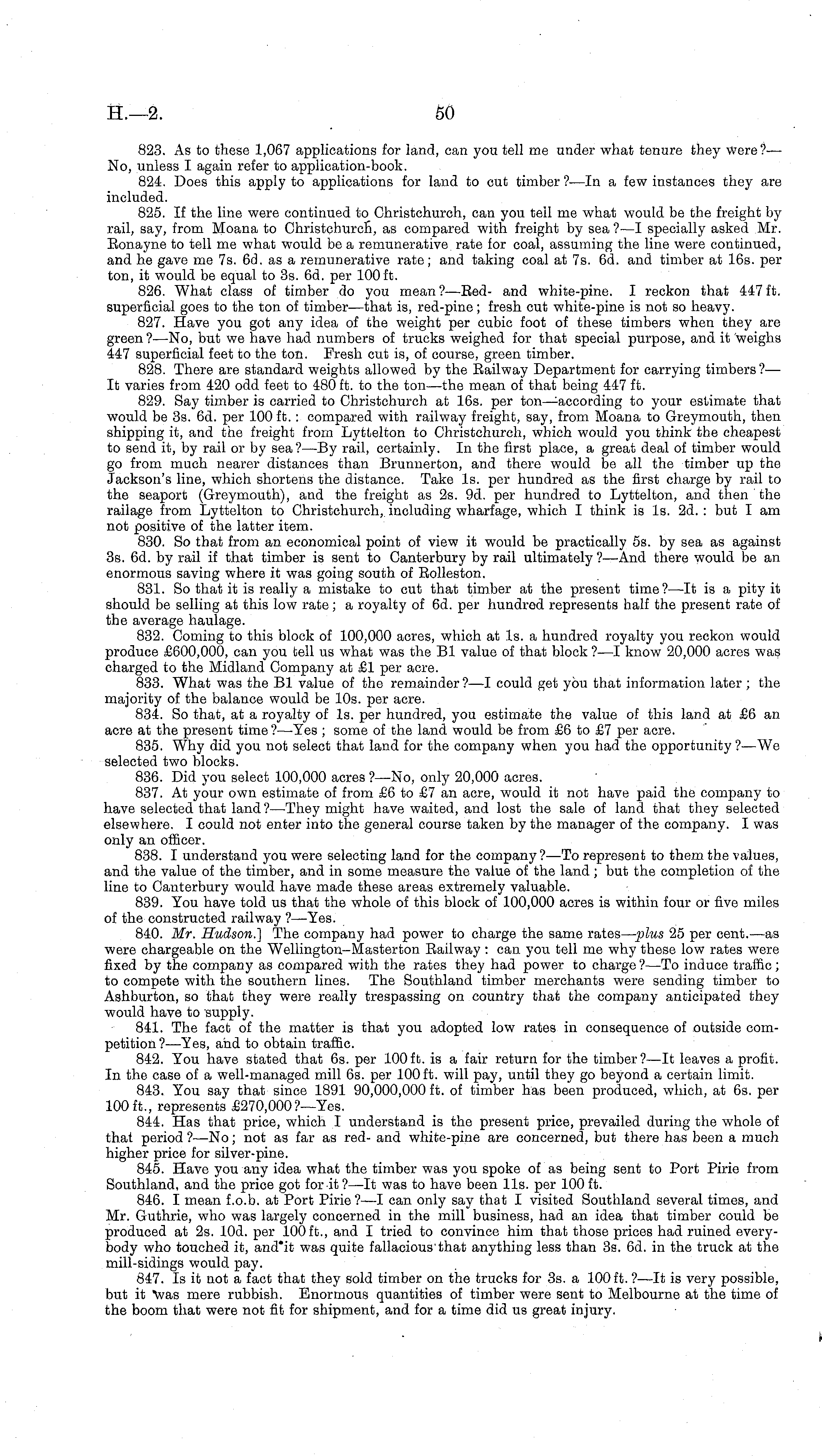 823. As to these 1,067 applications for land, can you tell me under what tenure they were?— No, unless I again refer to application-book. 824. Does this apply to applications for land to cut timber ?—ln a few instances they are included. 825. If the line were continued to Christchurch, can you tell me what would be the freight by rail, say, from Moana to Christchurcn, as compared with freight by sea? —I specially asked Mr. Eonayne to tell me what would be a remunerative rate for coal, assuming the line were continued, and he gave me 7s. 6d. as a remunerative rate; and taking coal at 7s. 6d. and timber at 16s. per ton, it would be equal to 3s. 6d. per 100 ft. 826. What class of timber do you mean? —Eed- and white-pine. I reckon that 447 ft. superficial goes to the ton of timber—that is, red-pine; fresh cut white-pine is not so heavy. 827. Have you got any idea of the weight per cubic foot of these timbers when they are green ? —No, but we have had numbers of trucks weighed for that special purpose, and it weighs 447 superficial feet to the ton. Fresh cut is, of course, green timber. 828. There are standard weights allowed by the Eailway Department for carrying timbers ?— It varies from 420 odd feet to 480 ft. to the ton—the mean of that being 447 ft. 829. Say timber is carried to Christchurch at 16s. per ton—-according to your estimate that would be 3s. 6d. per 100 ft. : compared with railway freight, say, from Moana to Greymouth, then shipping it, and the freight from Lyttelton to Christchurch, which would you think the cheapest to send it, by rail or by sea?—By rail, certainly. In the first place, a great deal of timber would go from much nearer distances than Brunnerton, and there would be all the timber up the Jackson's line, which shortens the distance. Take Is. per hundred as the first charge by rail to the seaport (Greymouth), and the freight as 2s. 9d. per hundred to Lyttelton, and then the railage from Lyttelton to Christchurch, including wharfage, which I think is Is. 2d. : but I am not positive of the latter item. 830. So that from an economical point of view it would be practically ss. by sea as against 3s. 6d. by rail if that timber is sent to Canterbury by rail ultimately ?—And there would be an enormous saving where it was going south of Eolleston. 831. So that it is really a mistake to cut that timber at the present time?—lt is a pity it should be selling at this low rate; a royalty of 6d. per hundred represents half the present rate of the average haulage. 832. Coming to this block of 100,000 acres, which at Is. a hundred royalty you reckon would produce £600,000, can you tell us what was the Bl value of that block ?—I know 20,000 acres was charged to the Midland Company at £1 per acre. 833. What was the Bl value of the remainder?—l could get you that information later ; the majority of the balance would be 10s. per acre. 834. So that, at a royalty of Is. per hundred, you estimate the value of this land at £6 an acre at the present time ?—Yes ; some of the land would be from £6 to £7 per acre. 835. Why did you not select that land for the company when you had the opportunity ?—We selected two blocks. 836. Did you select 100,000 acres ?—No, only 20,000 acres. 837. At your own estimate of from £6 to £7 an acre, would it not have paid the company to have selected that land ?—They might have waited, and lost the sale of land that they selected elsewhere. I could not enter into the general course taken by the manager of the company. I was only an officer. 838. I understand you were selecting land for the company ?—To represent to them the values, and the value of the timber, and in some measure the value of the land; but the completion of the line to Canterbury would have made these areas extremely valuable. 839. You have told us that the whole of this block of 100,000 acres is within four or five miles of the constructed railway ? —Yes. 840. Mr. Hudson.] The company had power to charge the same rates— plus 25 per cent.—as were chargeable on the Wellington-Masterton Eailway: can you tell me why these low rates were fixed by the company as compared with the rates they had power to charge ?—To induce traffic ; to compete with the southern lines. The Southland timber merchants were sending timber to Ashburton, so that they were really trespassing on country that the company anticipated they would have to supply. 841. The fact of the matter is that you adopted low rates in consequence of outside competition?— Yes, and to obtain traffic. 842. You have stated that 6s. per 100 ft. is a fair return for the timber?—lt leaves a profit. In the case of a well-managed mill 6s. per 100 ft. will pay, until they go beyond a certain limit. 843. You say that since 1891 90,000,000 ft. of timber has been produced, which, at 6s. per 100 ft., represents £270,000?— Yes. 844. Has that price, which I understand is the present price, prevailed during the whole of that period ?—No; not as far as red- and white-pine are concerned, but there has been a much higher price for silver-pine. 845. Have you any idea what the timber was you spoke of as being sent to Port Pirie from Southland, and the price got for it ? —lt was to have been 11s. per 100 ft. 846. I mean f.o.b. at Port Pirie ?—I can only say that I visited Southland several times, and Mr. Guthrie, who was largely concerned in the mill business, had an idea that timber could be produced at 2s. 10d. per 100 ft., and I tried to convince him that those prices had ruined everybody who touched it, and'it was quite fallacious that anything less than 3s. 6d. in the truck at the mill-sidings would pay. 847. Is it not a fact that they sold timber on the trucks for 3s. a 100 ft. ?—lt is very possible, but it Vas mere rubbish. Enormous quantities of timber were sent to Melbourne at the time of the boom that were not fit for shipment, and for a time did us great injury.