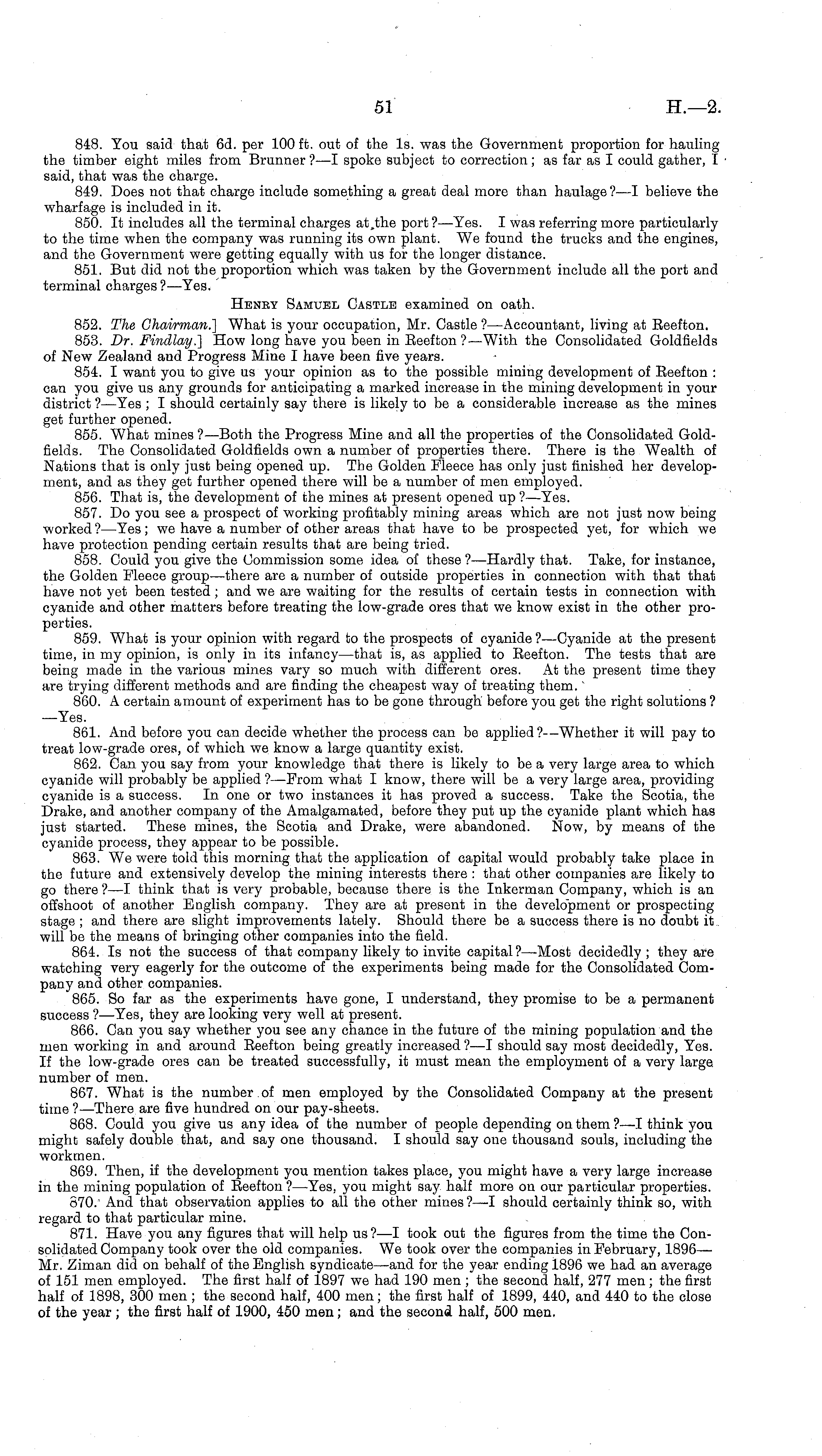 848. You said that 6d. per 100 ft. out of the Is. was the Government proportion for hauling the timber eight miles from Brunner ? —I spoke subject to correction; as far as I could gather, I said, that was the charge. 849. Does not that charge include something a great deal more than haulage?—l believe the wharfage is included in it. 850. It includes all the terminal charges at .the port ?—Yes. I was referring more particularly to the time when the company was running its own plant. We found the trucks and the engines, and the Government were getting equally with us for the longer distance. 851. But did not the proportion which was taken by the Government include all the port and terminal charges ?—Yes. Heney Samuel Castle examined on oath. 852. The Chairman.'] What is your occupation, Mr. Castle ?—Accountant, living at Eeefton. 853. Dr. Findlay.] How long have you been in Eeefton?—With the Consolidated Goldfields of New Zealand and Progress Mine I have been five years. 854. I want you to give us your opinion as to the possible mining development of Eeefton : can you give us any grounds for anticipating a marked increase in the mining development in your district ? —Yes; I should certainly say there is likely to be a considerable increase as the mines get further opened. 855. What mines ?—Both the Progress Mine and all the properties of the Consolidated Goldfields. The Consolidated Goldfields own a number of properties there. There is the Wealth of Nations that is only just being opened up. Tbe Golden Fleece has only just finished her development, and as they get further opened there will be a number of men employed. 856. That is, the development of the mines at present opened up?— Yes. 857. Do you see a prospect of working profitably mining areas which are not just now being worked ? —Yes; we have a number of other areas that have to be prospected yet, for which we have protection pending certain results that are being tried. 858. Could you give the Commission some idea of these ?—Hardly that. Take, for instance, the Golden Fleece group—there are a number of outside properties in connection with that that have not yet been tested; and we are waiting for the results of certain tests in connection with cyanide and other matters before treating the low-grade ores that we know exist in the other properties. 859. What is your opinion with regard to the prospects of cyanide ?—Cyanide at the present time, in my opinion, is only in its infancy —that is, as applied to Eeefton. The tests that are being made in the various mines vary so much with different ores. At the present time they are trying different methods and are finding the cheapest way of treating them.' 860. A certain amount of experiment has to be gone through before you get the right solutions ? —Yes. 861. And before you can decide whether the process can be applied?-—Whether it will pay to treat low-grade ores, of which we know a large quantity exist. 862. Can you say from your knowledge that there is likely to be a very large area to which cyanide will probably be applied ?—From what I know, there will be a very large area, providing cyanide is a success. In one or two instances it has proved a success. Take the Scotia, the Drake, and another company of the Amalgamated, before they put up the cyanide plant which has just started. These mines, the Scotia and Drake, were abandoned. Now, by means of the cyanide process, they appear to be possible. 863. We were told this morning that the application of capital would probably take place in the future and extensively develop the mining interests there : that other companies are likely to go there ?—I think that is very probable, because there is the Inkerman Company, which is an offshoot of another English company. They are at present in the development or prospecting stage ; and there are slight improvements lately. Should there be a success there is no doubt it. will be the means of bringing other companies into the field. 864. Is not the success of that company likely to invite capital?— Most decidedly ; they are watching very eagerly for the outcome of the experiments being made for the Consolidated Company and other companies. 865. So far as the experiments have gone, I understand, they promise to be a permanent success ?—Yes, they are looking very well at present. 866. Can you say whether you see any chance in the future of the mining population and the men working in and around Eeefton being greatly increased ?—I should say most decidedly, Yes. If the low-grade ores can be treated successfully, it must mean the employment of a very large number of men. 867. What is the number of men employed by the Consolidated Company at the present time ?—There are five hundred on our pay-sheets. 868. Could you give us any idea of the number of people depending on them ?—-I think you might safely double that, and say one thousand. I should say one thousand souls, including the workmen. 869. Then, if the development you mention takes place, you might have a very large increase in the mining population of Eeefton ?—Yes, you might say half more on our particular properties. S7O. And that observation applies to all the other mines?—l should certainly think so, with regard to that particular mine. 871. Have you any figures that will help us? —I took out the figures from the time the Consolidated Company took over the old companies. We took over the companies in February, 1896— Mr. Ziman did on behalf of the English syndicate —and for the year ending 1896 we had an average of 151 men employed. The first half of 1897 we had 190 men ; the second half, 277 men; the first half of 1898, 300 men; the second half, 400 men; the first half of 1899, 440, and 440 to the close of the year ; the first half of 1900, 450 men; and the second half, 500 men.