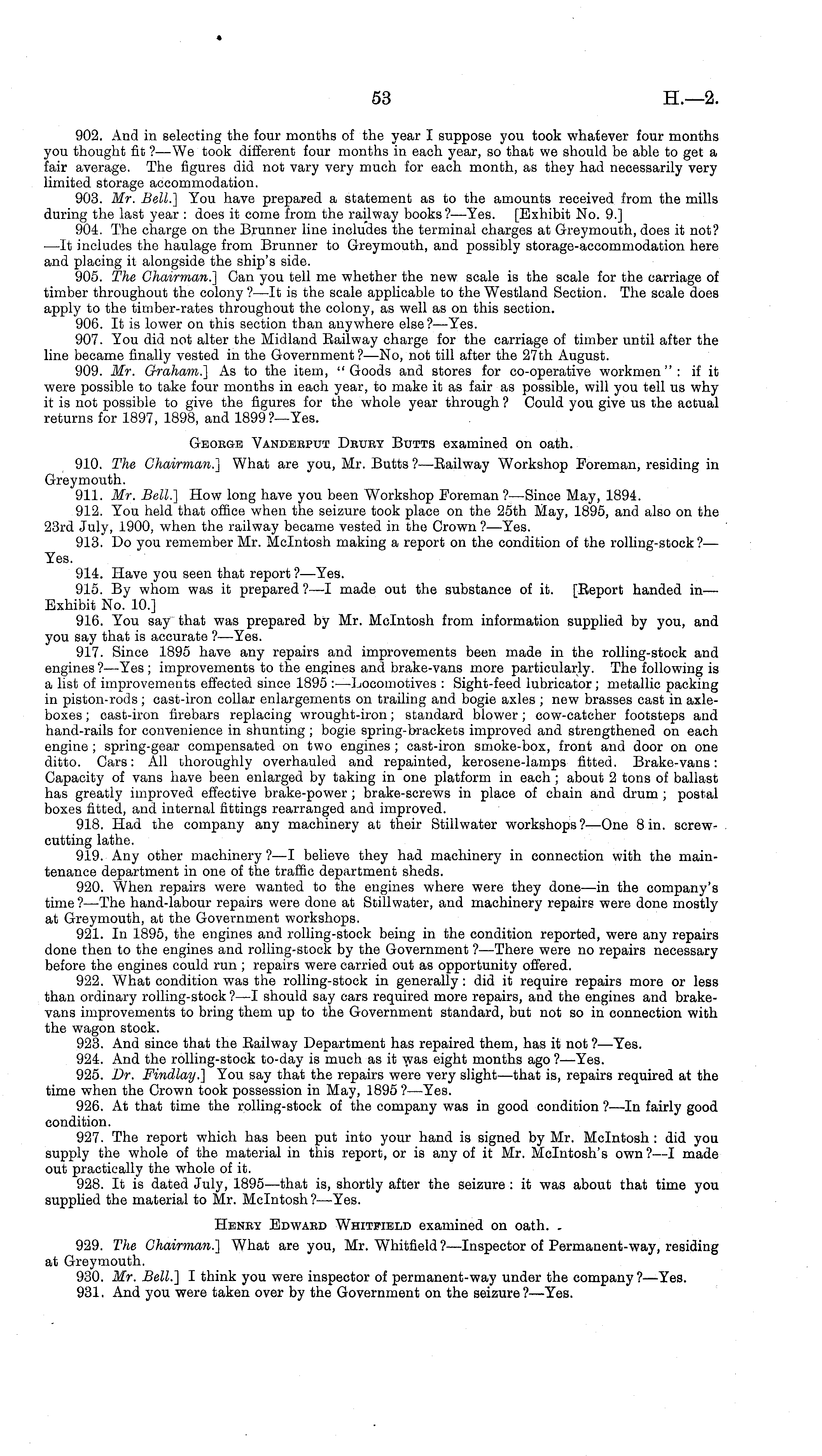 902. And in selecting the four months of the year I suppose you took whatever four months you thought fit ?—We took different four months in each year, so that we should be able to get a fair average. The figures did not vary very much for each month, as they had necessarily very limited storage accommodation. 903. Mr. Bell.] You have prepared a statement as to the amounts received from the mills during the last year : does it come from the railway books?— Yes. [Exhibit No. 9.] 904. The charge on the Brunner line includes the terminal charges at Greymouth, does it not? ■ —It includes the haulage from Brunner to Greymouth, and possibly storage-accommodation here and placing it alongside the ship's side. 905. The Chairman.] Can you tell me whether the new scale is the scale for the carriage of timber throughout the colony?—lt is the scale applicable to the Westland Section. The scale does apply to the timber-rates throughout the colony, as well as on this section. 906. It is lower on this section than anywhere else?— Yes. 907. You did not alter the Midland Railway charge for the carriage of timber until after the line became finally vested in the Government ?—No, not till after the 27th August. 909. Mr. Graham.] As to the item, "Goods and stores for co-operative workmen": if it were possible to take four months in each year, to make it as fair as possible, will you tell us why it is not possible to give the figures for the whole year through ? Could you give us the actual returns for 1897, 1898, and 1899?— Yes. Geobg-e Vandebput Dbuby Butts examined on oath. 910. The Chairman.] What are you, Mr. Butts ?—Railway Workshop Foreman, residing in Greymouth. 911. Mr. Bell.] How long have you been Workshop Foreman ?—Since May, 1894. 912. You held that office when the seizure took place on the 25th May, 1895, and also on the 23rd July, 1900, when the railway became vested in the Crown ?—Yes. 913. Do you remember Mr. Mclntosh making a report on the condition of the rolling-stock?— Yes. 914. Have you seen that report ?—Yes. 915. By whom was it prepared ?—I made out the substance of it. [Eeport handed in— Exhibit No. 10.] 916. You say that was prepared by Mr. Mclntosh from information supplied by you, and you say that is accurate ?—Yes. 917. Since 1895 have any repairs and improvements been made in the rolling-stock and engines ?—Yes ; improvements to the engines and brake-vans more particularly. The following is a list of improvements effected since 1895 : —Locomotives : Sight-feed lubricator; metallic packing in piston-rods; cast-iron collar enlargements on trailing and bogie axles ; new brasses east in axleboxes ; cast-iron firebars replacing wrought-iron; standard blower; cow-catcher footsteps and hand-rails for convenience in shunting ; bogie spring-brackets improved and strengthened on each engine ; spring-gear compensated on two engines ; cast-iron smoke-box, front and door on one ditto. Cars: All thoroughly overhauled and repainted, kerosene-lamps fitted. Brake-vans: Capacity of vans have been enlarged by taking in one platform in each ; about 2 tons of ballast has greatly improved effective brake-power ; brake-screws in place of chain and drum ; postal boxes fitted, and internal fittings rearranged and improved. 918. Had the company any machinery at their Stillwater workshops?— One 8 in. screwcutting lathe. 919. Any other machinery ?—I believe they had machinery in connection with the maintenance department in one of the traffic department sheds. 920. When repairs were wanted to the engines where were they done—in the company's time ? —The hand-labour repairs were done at Stillwater, and machinery repairs were done mostly at Greymouth, at the Government workshops. 921. In 1895, the engines and rolling-stock being in the condition reported, were any repairs done then to the engines and rolling-stock by the Government ?—There were no repairs necessary before the engines could run ; repairs were carried out as opportunity offered. 922. What condition was the rolling-stock in generally: did it require repairs more or less than ordinary rolling-stock ?—I should say cars required more repairs, and the engines and brakevans improvements to bring them up to the Government standard, but not so in connection with the wagon stock. 923. And since that the Eailway Department has repaired them, has it not ?—Yes. 924. And the rolling-stock to-day is much as it was eight months ago ?—Yes. 925. Dr. Findlay.] You say that the repairs were very slight—that is, repairs required at the time when the Crown took possession in May, 1895?— Yes. 926. At that time the rolling-stock of the company was in good condition ?—ln fairly good condition. 927. The report which has been put into your hand is signed by Mr. Mclntosh : did you supply the whole of the material in this report, or is any of it Mr. Macintosh's own?—l made out practically the whole of it. 928. It is dated July, 1895 —that is, shortly after the seizure : it was about that time you supplied the material to Mr. Mclntosh ? —Yes. Hbnby Edwaed Whitfibld examined on oath. - 929. The Chairman.] What are you, Mr. Whitfield ?—lnspector of Permanent-way, residing at Greymouth. 930. Mr. Bell.] I think you were inspector of permanent-way under the company?— Yes. 931. And you were taken over by the Government on the seizure?— Yes.
