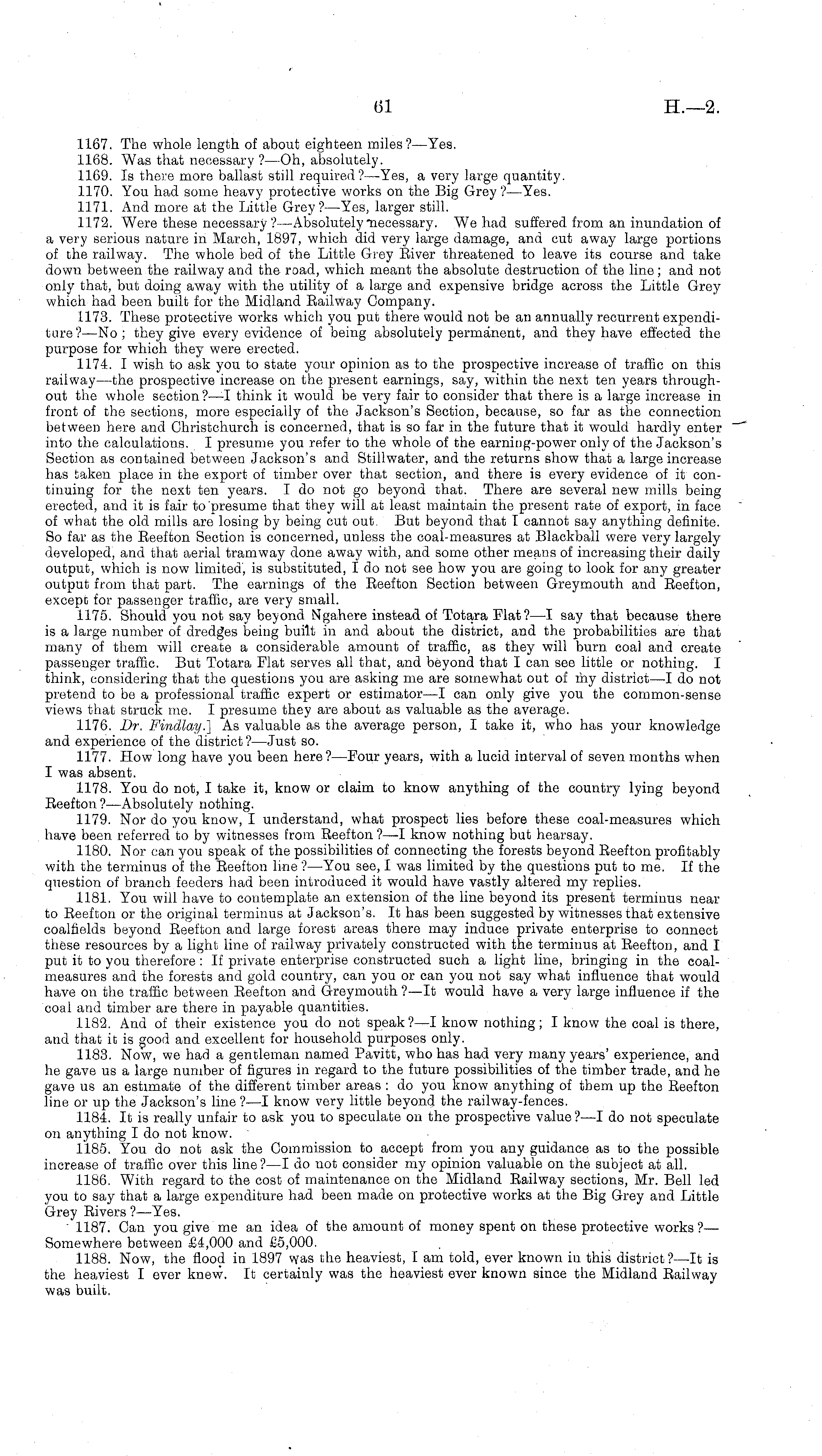 1167. The whole length of about eighteen miles? —Yes. 1168. Was that necessary ? —Oh, absolutely. 1169. Is there more ballast still required?— Yes, a very large quantity. 1170. You had some heavy protective works on the Big Grey?— Yes. 1171. And more at the Little Grey?— Yes, larger still. 1172. Were these necessary ?—Absolutely "necessary. We had suffered from an inundation of a very serious nature in March, 1897, which did very large damage, and cut away large portions of the railway. The whole bed of the Little Grey Eiver threatened to leave its course and take down between the railway and the road, which meant the absolute destruction of the line; and not only that, but doing away with the utility of a large and expensive bridge across the Little Grey which had been built for the Midland Eailway Company. 1173. These protective works which you put there would not be an annually recurrent expenditure?—No ; they give every evidence of being absolutely permanent, and they have effected the purpose for which they were erected. 1174. I wish to ask you to state your opinion as to the prospective increase of traffic on this railway —the prospective increase on the present earnings, say, within the next ten years throughout the whole section ?—-I think it would be very fair to consider that there is a large increase in front of the sections, more especially of the Jackson's Section, because, so far as the connection between here and Christchurch is concerned, that is so far in the future that it would hardly enter into the calculations. I presume you refer to the whole of the earning-power only of the Jackson's Section as contained between Jackson's and Stillwater, and the returns show that a large increase has taken place in the export of timber over that section, and there is every evidence of it continuing for the next ten years. I do not go beyond that. There are several new mills being erected, and it is fair to presume that they will at least maintain the present rate of export, in face of what the old mills are losing by being cut out. But beyond that I cannot say anything definite. So far as the Beefton Section is concerned, unless the coal-measures at Blackball were very largely developed, and that aerial tramway done away with, and some other means of increasing their daily output, which is now limited, is substituted, I do not see how you are going to look for any greater output from that part. The earnings of the Eeefton Section between Greymouth and Eeefton, except for passenger traffic, are very small. 1175. Should you not say beyond Ngahere instead of Totara Plat?—l say that because there is a large number of dredges being built in and about the district, and the probabilities are that many of them will create a considerable amount of traffic, as they will burn coal and create passenger traffic. But Totara Flat serves all that, and beyond that I can see little or nothing. I think, considering that the questions you are asking me are somewhat out of my district—l do not pretend to be a professional traffic, expert or estimator —I can only give you the common-sense views that struck me. I presume they are about as valuable as the average. 1176. Dr. Findlay.] As valuable as the average person, I take it, who has your knowledge and experience of the district? —Just so. 1177. How long have you been here?— Four years, with a lucid interval of seven months when I was absent. 1178. You do not, I take it, know or claim to know anything of the country lying beyond Eeefton ? —Absolutely nothing. 1179. Nor do you know, I understand, what prospect lies before these coal-measures which have been referred to by witnesses from Eeefton ?—I know nothing but hearsay. 1180. Nor can you speak of the possibilities of connecting the forests beyond Eeefton profitably with the terminus of the Eeefton line ? —You see, I was limited by the questions put to me. If the question of branch feeders had been introduced it would have vastly altered my replies. 1181. You will have to contemplate an extension of the line beyond its present terminus near to Eeefton or the original terminus at Jackson's. It has been suggested by witnesses that extensive coalfields beyond Eeefton and large forest areas there may induce private enterprise to connect these resources by a light line of railway privately constructed with the terminus at Eeefton, and I put it to you therefore : If private enterprise constructed such a light line, bringing in the coalmeasures and the forests and gold country, can you or can you not say what influence that would have on the traffic between Eeefton and Greymouth ?—lt would have a very large influence if the coal and timber are there in payable quantities. 1182. And of their existence you do not speak? —I know nothing; I know the coal is there, and that it is good and excellent for household purposes only. 1183. Now, we had a gentleman named Pavitt, who has had very many years' experience, and he gave us a large number of figures in regard to the future possibilities of the timber trade, and he gave us an estimate of the different timber areas : do you know anything of them up the Eeefton line or up the Jackson's line ?—I know very little beyond the railway-fences. 1184. It is really unfair to ask you to speculate on the prospective value ?—I do not speculate on anything I do not know. 1185. You do not ask the Commission to accept from you any guidance as to the possible increase of traffic over this line ? —I do not consider my opinion valuable on the subject at all. 1186. With regard to the cost of maintenance on the Midland Eailway sections, Mr. Bell led you to say that a large expenditure had been made on protective works at the Big Grey and Little Grey Eivers ?—Yes. ' 1187. Can you give me an idea of the amount of money spent on these protective works ?— Somewhere between £4,000 and £5,000. 1188. Now, the flood in 1897 was the heaviest, 