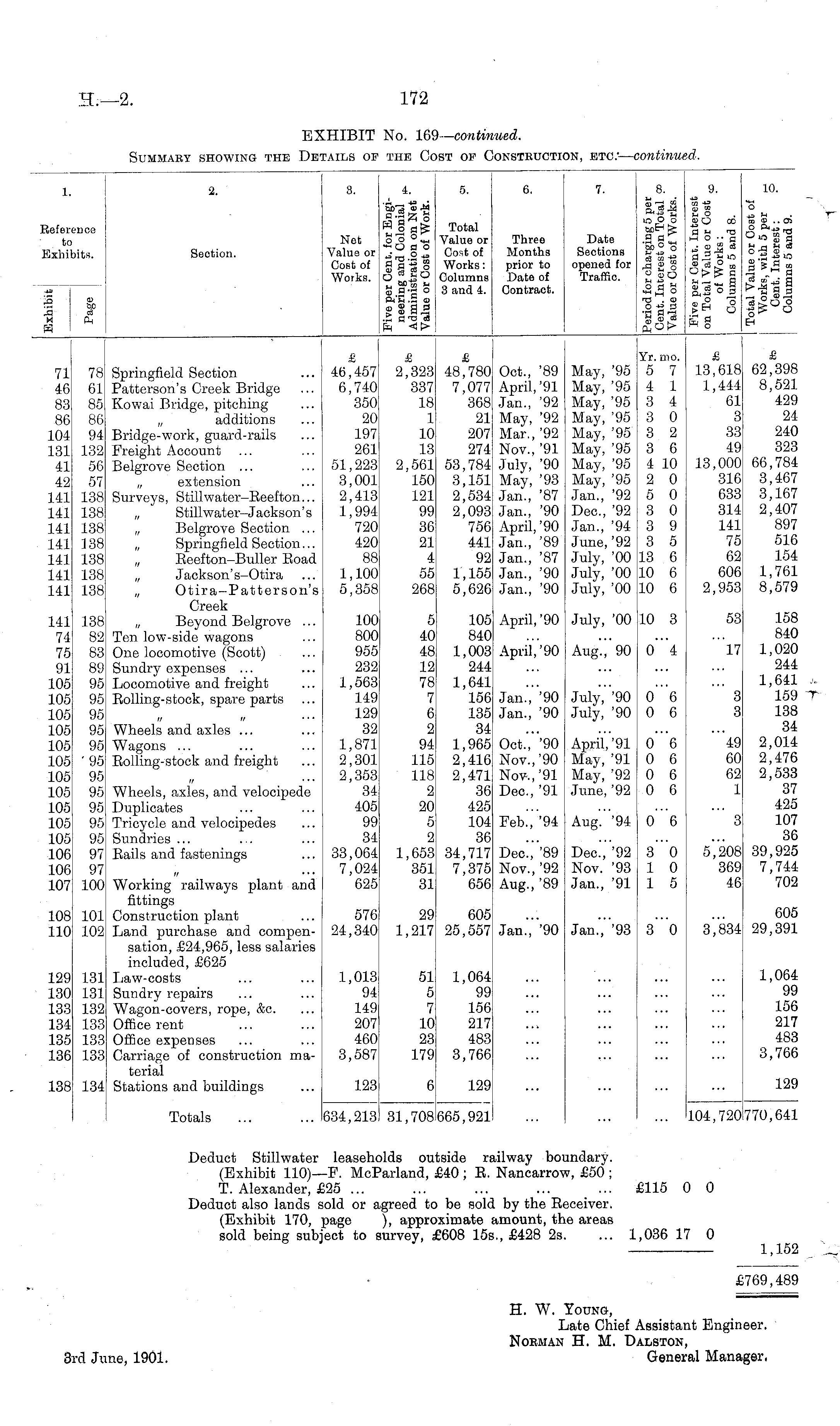 Deduct Stillwater leaseholds outside railway boundary. (Exhibit 110)— F. McParland, £40 ;E. Nancarrow, £50 ; T. Alexander, £25 ... £115 0 0 Deduct also lands sold or agreed to be sold by the Eeceiver. (Exhibit 170, page ), approximate amount, the areas sold being subject to survey, £608 155., £428 2s. ... 1,036 17 0 1,152 £769,489 H. W. Young, Late Chief Assistant Engineer. Noeman H. M. Dalston, 3rd June, 1901. General Manager.