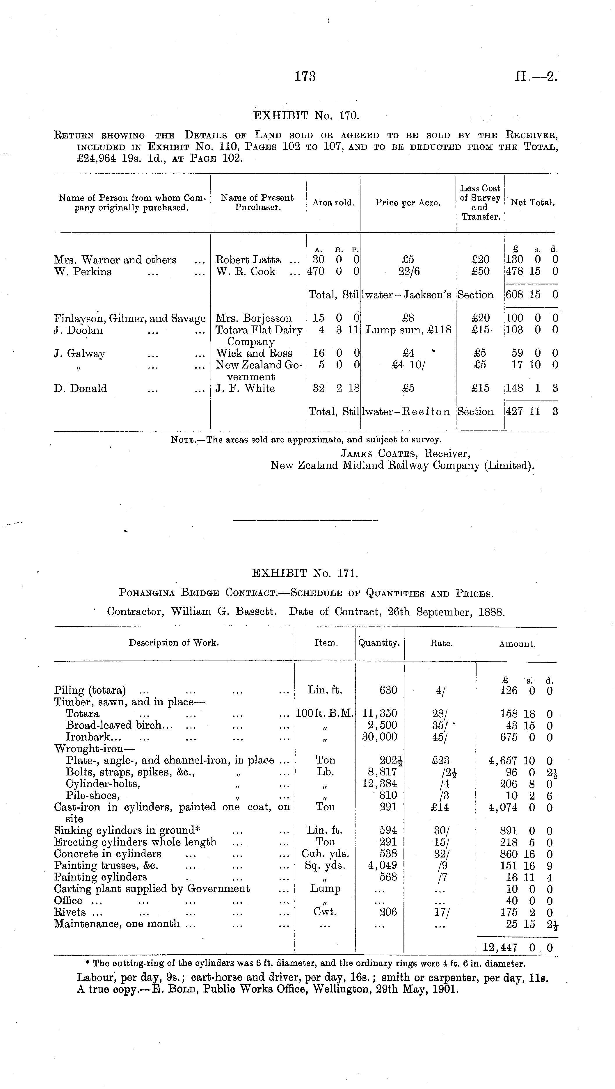 EXHIBIT No. 171. Pohangina Bridge Contract.-Schedule of Quantities and Prices. Contractor, William G. Bassett. Date of Contract, 26th September, 1888.