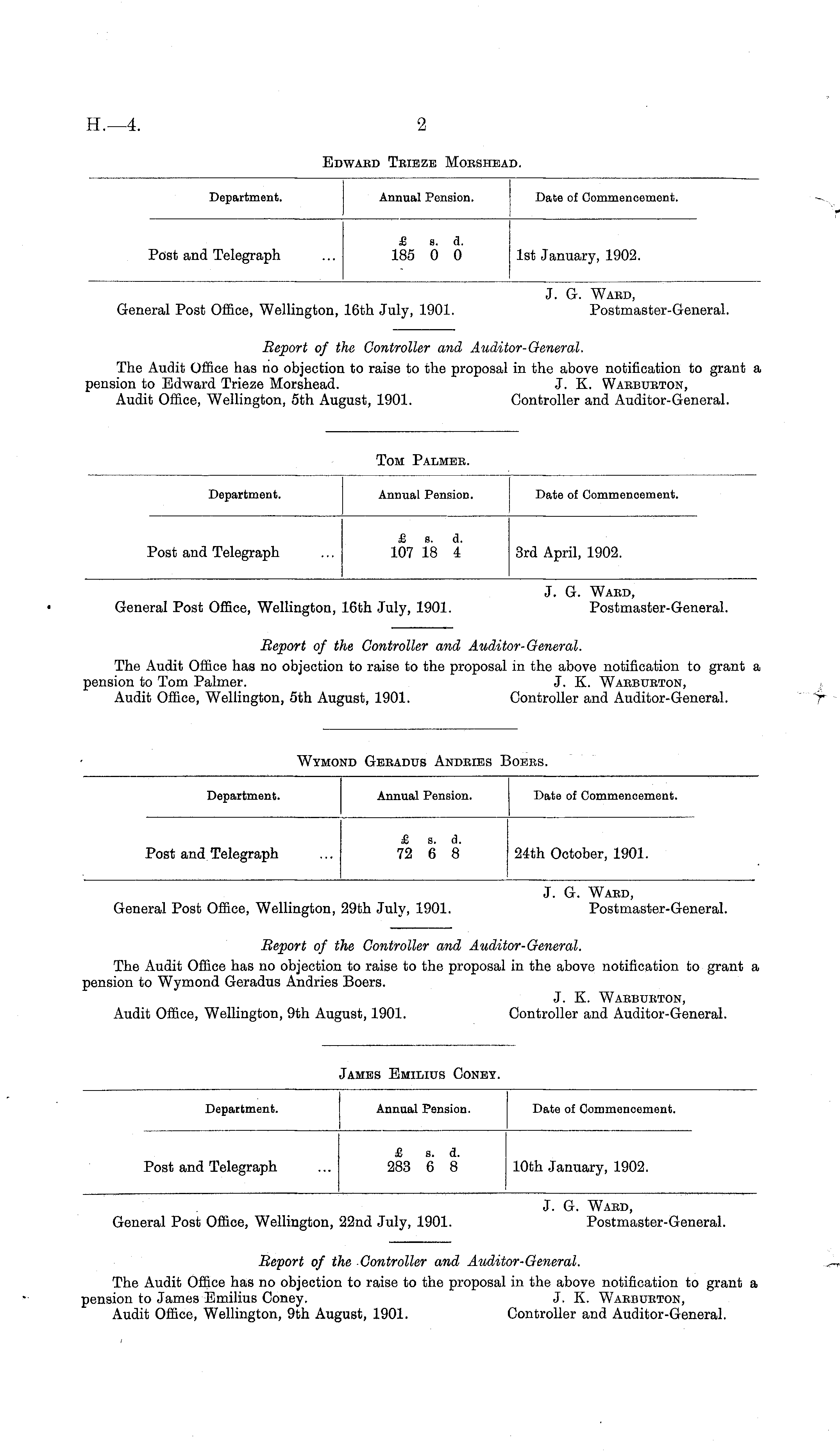 Department. Annual Pension. Date of Commencement. Post and Telegraph £ 185 s. 0 a. 0 1st January, 1902.