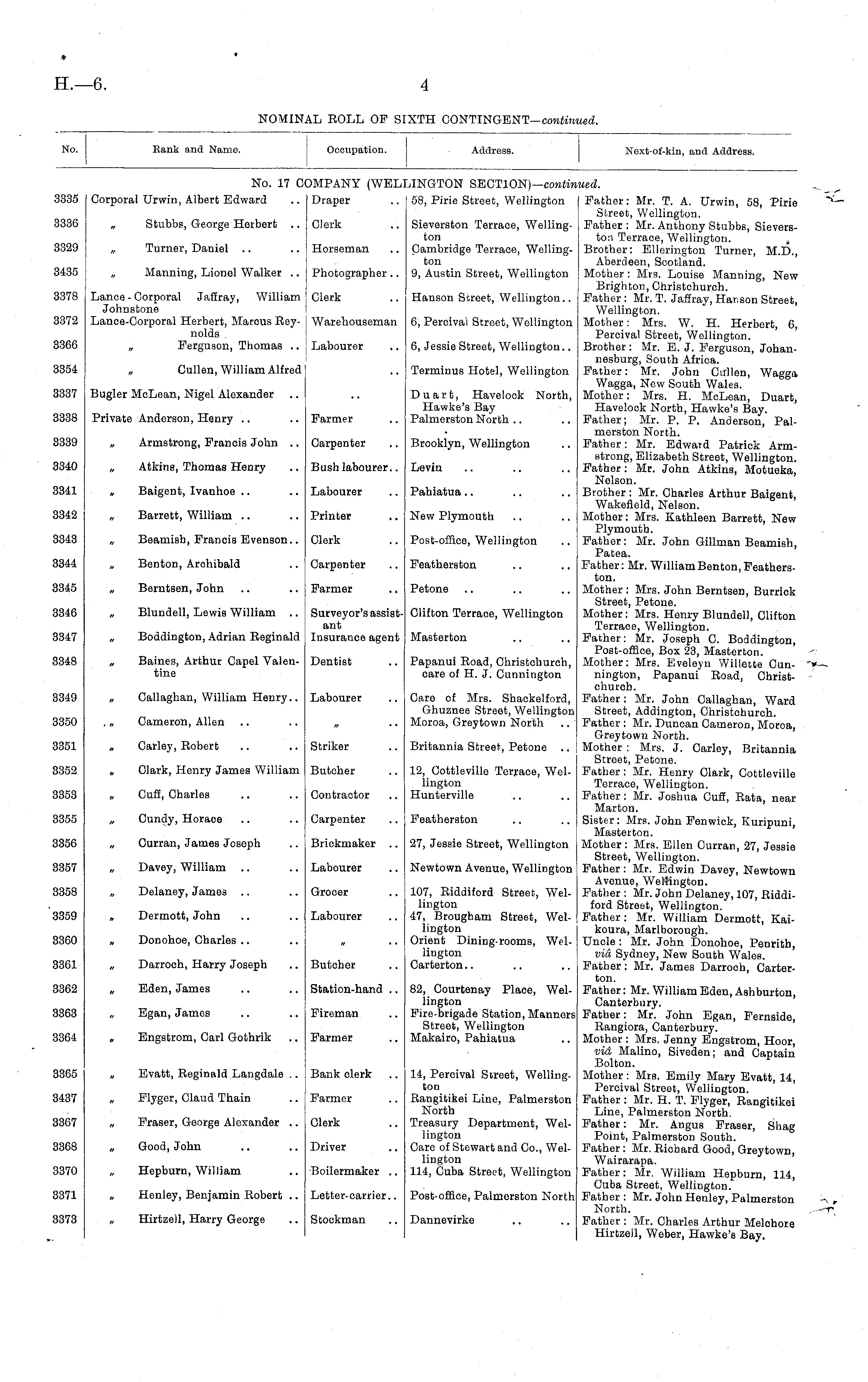 No. Eank and Name. Occupation. Address. Next-of-kin, and Address. 3335 No. 17 C< Corporal Urwin, Albert Edward )MPANY (WEL1 Draper -JNGTON SECTION)— contin; 58, Pirie Street, Wellington lied. Father: Mr. T. A. Urwin, 58, Pirie Street, Wellington. Father : Mr. Anthony Stubbs, Sieverston Terrace, Wellington. Brother: Ellerington Turner, M.D., Aberdeen, Scotland. Mother : Mrs. Louise Manning, New Brighton, Christchurch. Father : Mr. T. Jaffray, Hanson Street, Wellington. Mother: Mrs. W. H. Herbert, 6, Percivai Street, Wellington. Brother : Mr. E. J. Ferguson, Johannesburg, South Africa. Father: Mr. John Cullen, Wagga Wagga, New South Wales. Mother: Mrs. H. McLean, Duart, Havelook North, Hawke's Bay. Father; Mr. P. P. Anderson, Palmerston North. Father: Mr. Edward Patrick Armstrong, Elizabeth Street, Wellington. Father: Mr. John Atkins, Motueka, Nelson. Brother : Mr. Charles Arthur Baigent, Wakefield, Nelson. Mother: Mrs. Kathleen Barrett, New Plymouth. Father : Mr. John Gillman Beamish, Patea. Father: Mr. William Benton, Featherston. Mother : Mrs. John Berntsen, Burrick Street, Petone. Mother : Mrs. Henry Blundell, Clifton Terrace, Wellington. Father: Mr. Joseph C. Boddington, Post-office, Box 23, Masterton. Mother: Mrs. Eveleyn Willette Cunnington, Papanui Road, Christchuroh. Father: Mr. John Callaghan, Ward Street, Addington, Christchurch. Father : Mr. Duncan Cameron, Moroa, Greytown North. Mother : Mrs. J. Carley, Britannia Street, Petone. Father: Mr. Henry Clark, Cottleville Terrace, Wellington. Father: Mr. Joshua Cuff, Rata, near Marton. Sister : Mrs. John Fenwick, Kuripuni, Masterton. Mother : Mrs. Ellen Curran, 27, Jessie Street, Wellington. Father: Mr. Edwin Davey, Newtown Avenue, Wellington. Father : Mr. John Delaney, 107, Riddiford Street, Wellington. Father: Mr. William Dermott, Kaikoura, Marlborough. Uncle : Mr. John Donohoe, Penrith, via Sydney, New South Wales. Father: Mr. James Darroch, Carterton. Father: Mr. William Eden, Ashburton, Canterbury. Father: Mr. John Egan, Fernside, Rangiora, Canterbury. Mother : Mrs. Jenny Engstrom, Hoor, vid Malino, Siveden; and Captain Bolton. Mother: Mrs. Emily Mary Evatt, 14, Percivai Street, Wellington. Father : Mr. H. T. Flyger, Rangitikei Line, Palmerston North. Father: Mr. Angus Fraser, Shag Point, Palmerston South. Father: Mr. Richard Good, Greytown, Wairarapa. Father: Mr. William Hepburn, 114, Cuba Street, Wellington. Father : Mr. John Henley, Palmerston North. Father : Mr. Charles Arthur Melchore Hirtzeil, Weber, Hawke's Bay. 3336 3329 „ Stubbs, George Herbert .. „ Turner, Daniel .. Clerk Horseman Sieverston Terrace, Wellington Cambridge Terrace, Wellington 9, Austin Street, Wellington 3435 „ Manning, Lionel Walker .. Photographer.. 3378 Lance - Corporal Jaffray, William Johnstone Lance-Corporal Herbert, Marous Reynolds „ Ferguson, Thomas .. Clerk Hanson Street, Wellington.. 3372 Warehouseman 6, Percivai Street, Wellington 3366 Labourer 6, Jessie Street, Wellington.. 3354 Cullen, William Alfred Terminus Hotel, Wellington 3337 Bugler McLean, Nigel Alexander Duart, Havelook North, Hawke's Bay Palmerston North 3338 Private Anderson, Henry .. Farmer 3339 „ Armstrong, Francis John .. Carpenter Brooklyn, Wellington 3340 „ Atkins, Thomas Henry Bush labourer.. Levin 3341 „ Baigent, Ivanhoe .. Labourer Pahiatua 3342 „ Barrett, William .. Printer New Plymouth 3343 „ Beamish, Francis Evenson.. Clerk Post-office, Wellington 3344 „ Benton, Archibald Carpenter Featherston 3345 „ Berntsen, John Farmer Petone 3346 „ Blundell, Lewis William Surveyor's assistant Insurance agent Clifton Terrace, Wellington 3347 „ Boddington, Adrian Reginald Masterton 3348 „ Baines, Arthur Capel Valentine Dentist Papanui Road, Christchurch, care of H. J. Cunnington 3349 „ Callaghan, William Henry.. Labourer Care of Mrs. Shackelford, Ghuznee Street, Wellington Moroa, Greytown North 3350 , „ Cameron, Allen 3351 „ Carley, Robert Striker Britannia Street, Petone .. 3352 3353 „ Clark, Henry James William Cuff, Charles Butcher Contractor 12, Cottleville Terrace, Wellington Hunterville 3355 „ Cundy, Horace .. Carpenter Featherston 3356 „ Curran, James Joseph Brickmaker .. 27, Jessie Street, Wellington 3357 „ Davey, William Labourer Newtown Avenue, Wellington 3358 3359 3360 „ Delaney, James .. „ Dermott, John „ Donohoe, Charles .. Grocer Labourer 107, Riddiford Street, Wellington 47, Brougham Street, Wellington Orient Dining-rooms, Wellington Carterton 3361 „ Darroch, Harry Joseph Butcher 3362 3363 „ Eden, James „ Egan, James Station-hand .. Fireman 82, Courtenay Place, Wellington Fire-brigade Station, Manners Street, Wellington Makairo, Pahiatua 3364 „ Engstrom, Carl Gothrik Farmer 3365 „ Evatt, Reginald Langdale .. Bank clerk 14, Percivai Street, Wellington Rangitikei Line, Palmerston North Treasury Department, Wellington Care of Stewart and Co., Wellington 114, Cuba Street, Wellington 3437 Flyger, Claud Thain Farmer 3367 „ Fraser, George Alexander .. Clerk 3368 „ Good, John Driver 3370 „ Hepburn, William Boilermaker .. 3371 „ Henley, Benjamin Robert .. Letter-carrier.. Post-office, Palmerston North 3373 „ Hirtzeil, Harry George Stockman Dannevirke