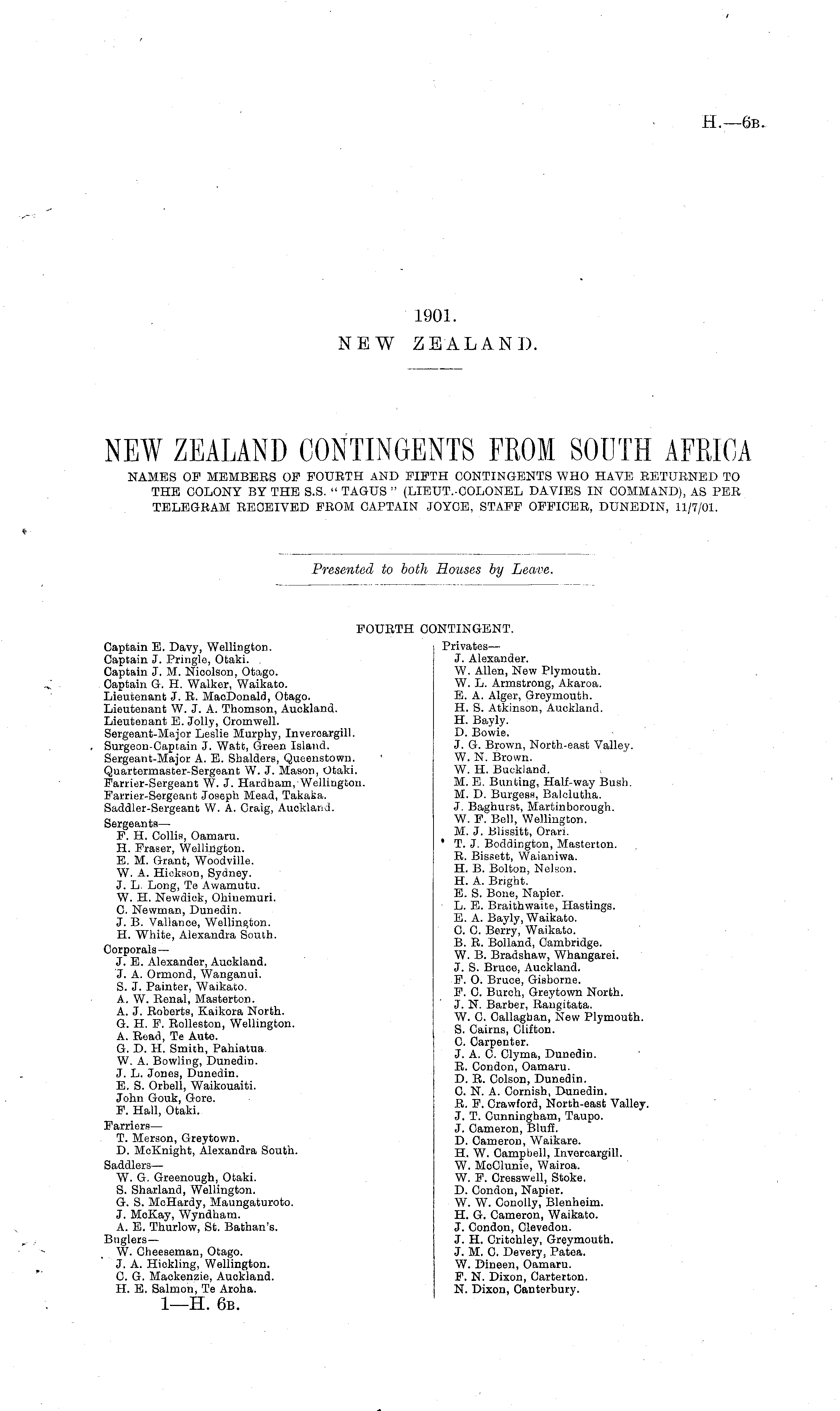 NEW ZEALAND CONTINGENTS FROM SOUTH AFRICA NAMES OF MEMBERS OF FOURTH AND FIFTH CONTINGENTS WHO HAVE RETURNED TO THE COLONY BY THE S.S. "TAGUS" (LIEUT.-OOLONEL DAVIES IN COMMAND), AS PER TELEGRAM RECEIVED FROM CAPTAIN JOYCE, STAFF OFFICER, DUNEDIN, 11/7/01.