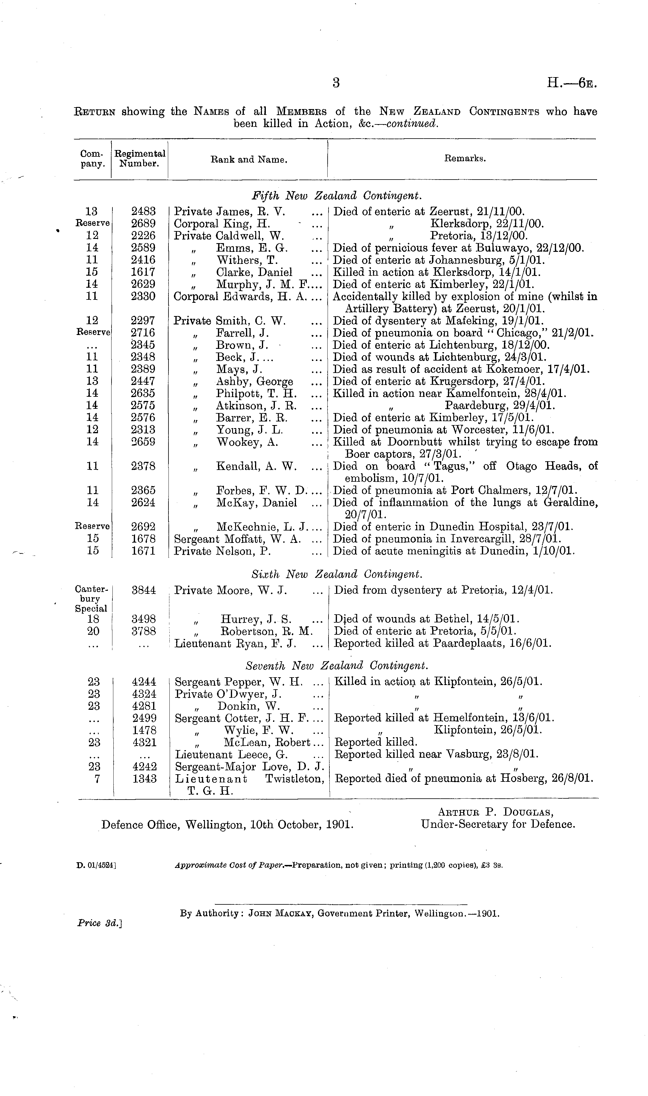 Abthub P. Douglas, Defence Office, Wellington, 10th October, 1901. Under-Secretary for Defence.