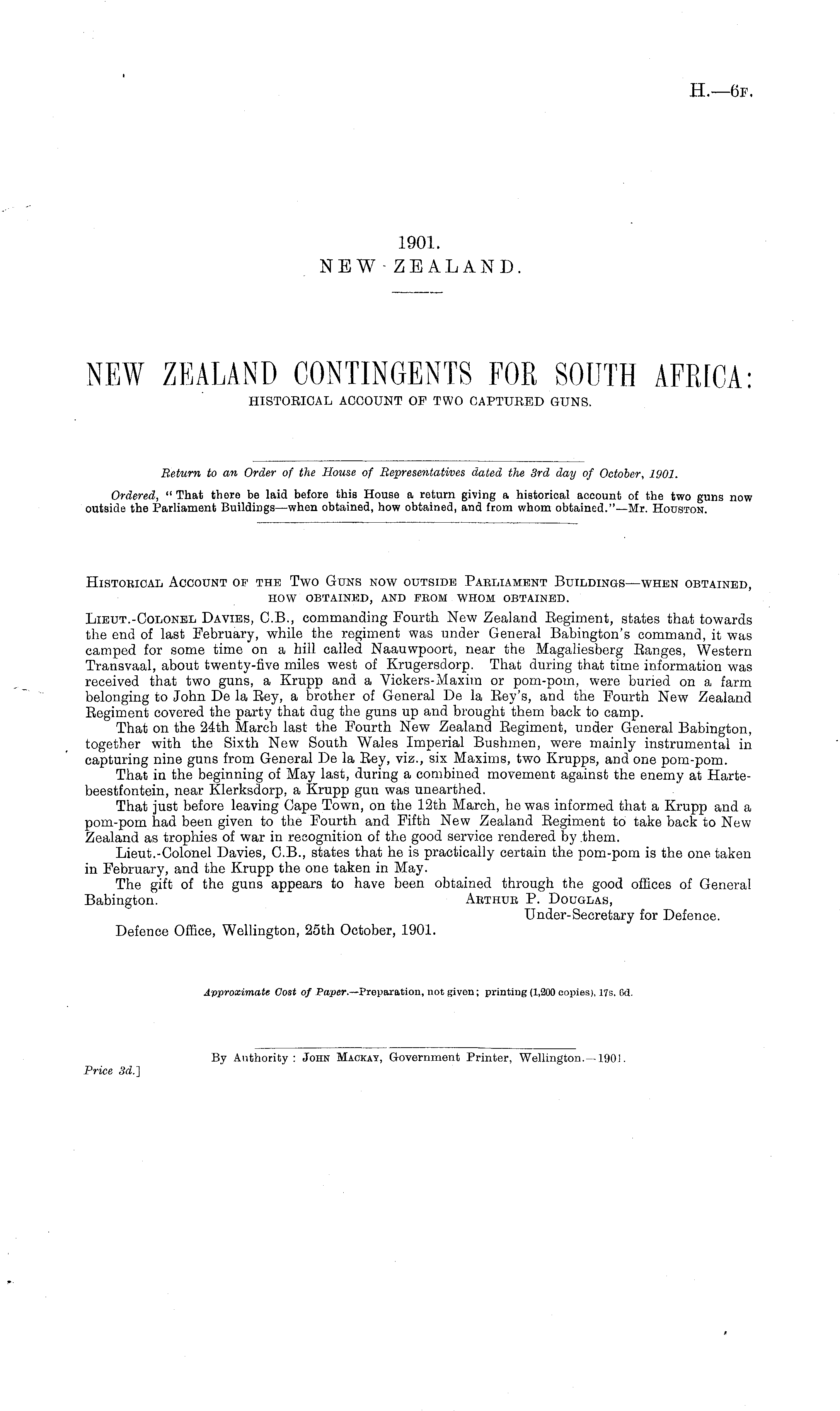 Historical Account of the Two Guns now outside Paeliament Buildings— when obtained, HOW OBTAINED, AND FEOM WHOM OBTAINED. Lieut.-Colonel Davibs, C.8., commanding Fourth New Zealand Eegiment, states that towards the end of last February, while the regiment was under General Babington's command, it was camped for some time on a hill called Naauwpoort, near the Magaliesberg Eanges, Western Transvaal, about twenty-five miles west of Krugersdorp. That during that time information was received that two guns, a Krupp and a Vickers-Maxim or pom-pom, were buried on a farm belonging to John De la Eey, a brother of General De la Bey's, and the Fourth New Zealand Eegiment covered the party that dug the guns up and brought them back to camp. That on the 24th March last the Fourth New Zealand Eegiment, under General Babington, together with the Sixth New South Wales Imperial Bushmen, were mainly instrumental in capturing nine guns from General De la Eey, via., six Maxims, two Krupps, and one pom-pom. That in the beginning of May last, during a combined movement against the enemy at Hartebeestfontein, near Klerksdorp, a Krupp gun was unearthed. That just before leaving Cape Town, on the 12th March, he was informed that a Krupp and a pom-pom had been given to the Fourth and Fifth New Zealand Eegiment to take back to New Zealand as trophies of war in recognition of the good service rendered by .them. Lieut.-Colonel Davies, C.8., states that he is practically certain the pom-pom is the one taken in February, and the Krupp the one taken in May. The gift of the guns appears to have been obtained through the good offices of General Babington. Aethue P. Douglas, Under-Secretary for Defence. Defence Office, Wellington, 25th October, 1901. Approximate Cost of Paper - .—Preparation, uot given; printing (1,200 copies). 17s. 6d.