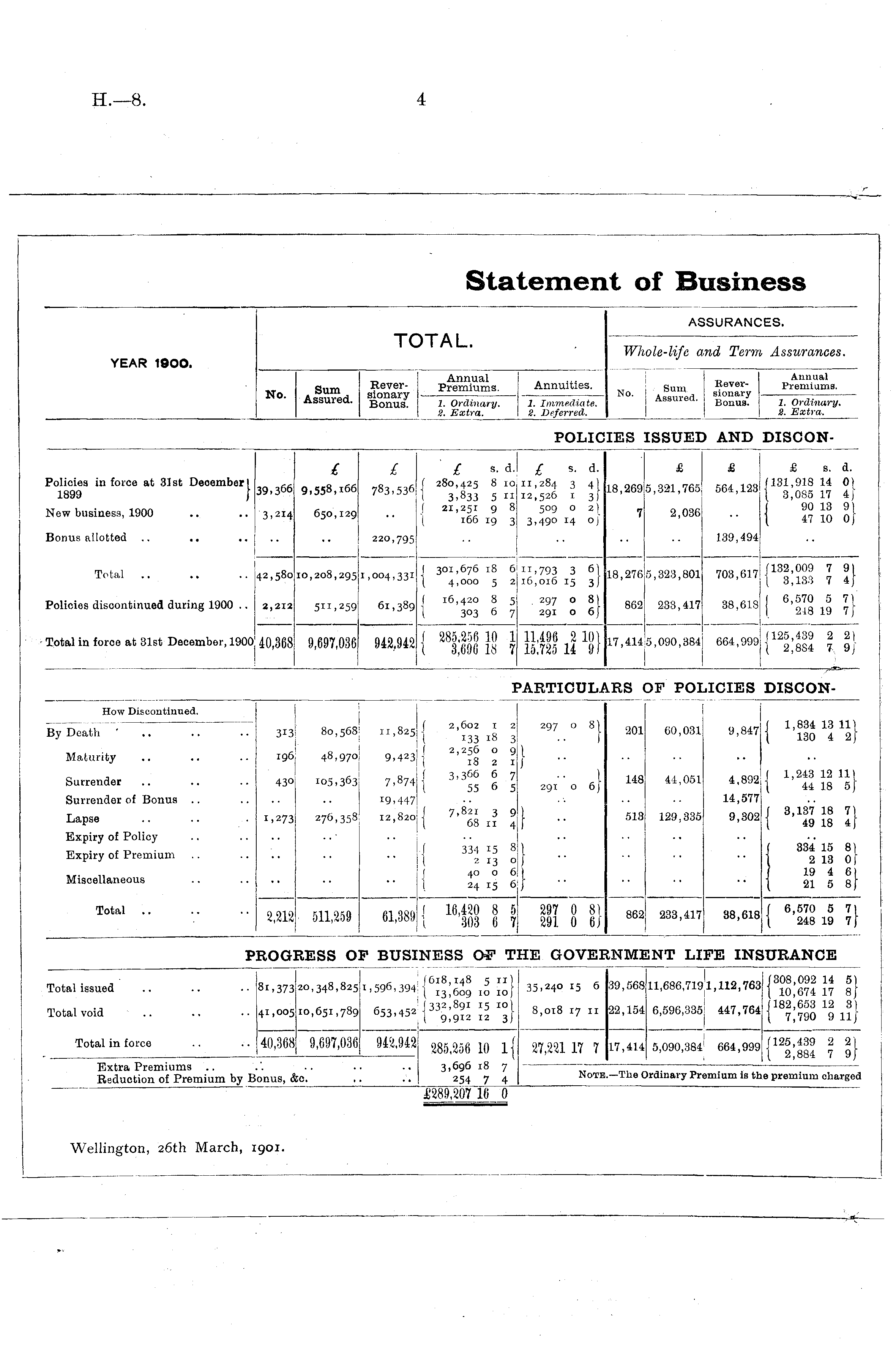 ASSURAN ES. YEAR 1900. TOTAL. Whole-life and Ter, Assurances. No. Sum Assured. Reversionary — Bonus. Annual Premiums. 1. Ordinary. 2. Extra. Annuities. 1. Immediate 2. Deferred. ,„ EeverNo - Assured 8iona «-y Assured. Bonua , Annual Premiums. 1. Immediate. 2. Deferred. 1. Ordinary. 2. Extra. POLI iES ISSUED AND DISCON'olicies in force at 31 st December I 1899 [ 39,366 £ 9,558,i66 £ 783,536 / s. d. ( 280,425 8 10 t 3, 8 33 5 11 f 21,251 9 8 I 166 19 3 £ s. d. 11,284 3 4) 12,526 I. 3 f 509 o 2) 3,490 14 oj 18,269 £ 5,321,765 & 564,123 £ s. d. (131,918 14 0) \ 3,085 17 4} ( 90 13 91 \ 47 10 0j lew business, 1900 3,214 650,129 7 2,036 Jonus allotted 220,795 139,494 Total .. 42,580 10,208,295 I 301,676 18 6 1 4,000 5 2 ",793 3 61 16,016 15 3j 18,276 5,323,801 703,617 (132,009 7 91 j 3,133 7 4/ 1,004,331 'olicies discontinued during 1900 .. 2,212 511,259 61,389 ( 16,420 8 5 t 3°3 6 7 297 o 81 291 o 6) 862 233,417 38,618 j 6,570 5 7) I 218 19 7} !otal in force at 31st December, 1900 40,368 9,697,036] 942,942 ( 285,256 10 1 3,696 18 7 11,496 2 10) 15,725 14 9 f 17,414 ;5,090,384| 664,999 (125,439 \ 2,884 2 2) 7 9j 'ARTICUL RS >F POLICIES DISCONHow Discontinued. By Death ' Maturity 313; 196 80,568; 48,970 11,825 9,423 f 1 f I I 2 1602 1 2 133 18 3 2,256 o 9 18 2 I 3,3 66 6 7 55 6 5 1 297 o 8) 201 60,031 9,847 I 1,834 13 111 130 4 2} Surrender 430 !o5,363 7, 8 74 291 o 6) 148 44,051 4,892 I 1,243 12 111 44 18 5} Surrender of Bonus 19,447 ( 1 7,821 3 9 68 11 4 14,577 I 3,137 18 7) 49 18 4f Lapse 1,273 276,358 12,820 :| 513 129,335 9,302 Expiry of Policy f ( 334 15 81 2 13 Of 19 4 6) 21 5 8} Expiry of Premium ! ( 1 334 15 8 2 13 o 40 o 6 24 15 6j :} Miscellaneous Total .. J 16,420 8 5 303 6 7 297 0 81 291 0 6J ( 6,570 5 71 248 19 7j 2,212 511,259 61,3891 862 233,417, 38,618 PROGRESS OP BUSINESS OF T :e GOVE NMENT LIFE INSURANCE Total issued Total void ■ .. Total in force •• 81,373 •• 4 I > 00 5 • • 40,368 20,348,825 10,651,789 1 (618,148 5 11) 1,596,394:] I3 ; 6oo / 0 I0 \ 653,452 ! | 332,891 I5 IO jj,tj 9,912 12 3j 35,240 15 6 8,018 17 11 39,56811,686,7191, 112, 763 22,154 6,596,335! 447,764 I (308,092 14 5) | 10,674 17 8J (182,653 12 3) 1 7,790 9 11/ 9,697,036; ™ 285,256 10 1 27,221 17 7 l 5,090,384 ! 664,999 (125,439 2 2) t 2,884 7 9} 17,414 Extra Premiums .. Reduction of Premium by Bjmus^&o._ 3,696 18 7 254 7 4 Note. —The Ordinary Premium is the premium charged 1289,207 16 0