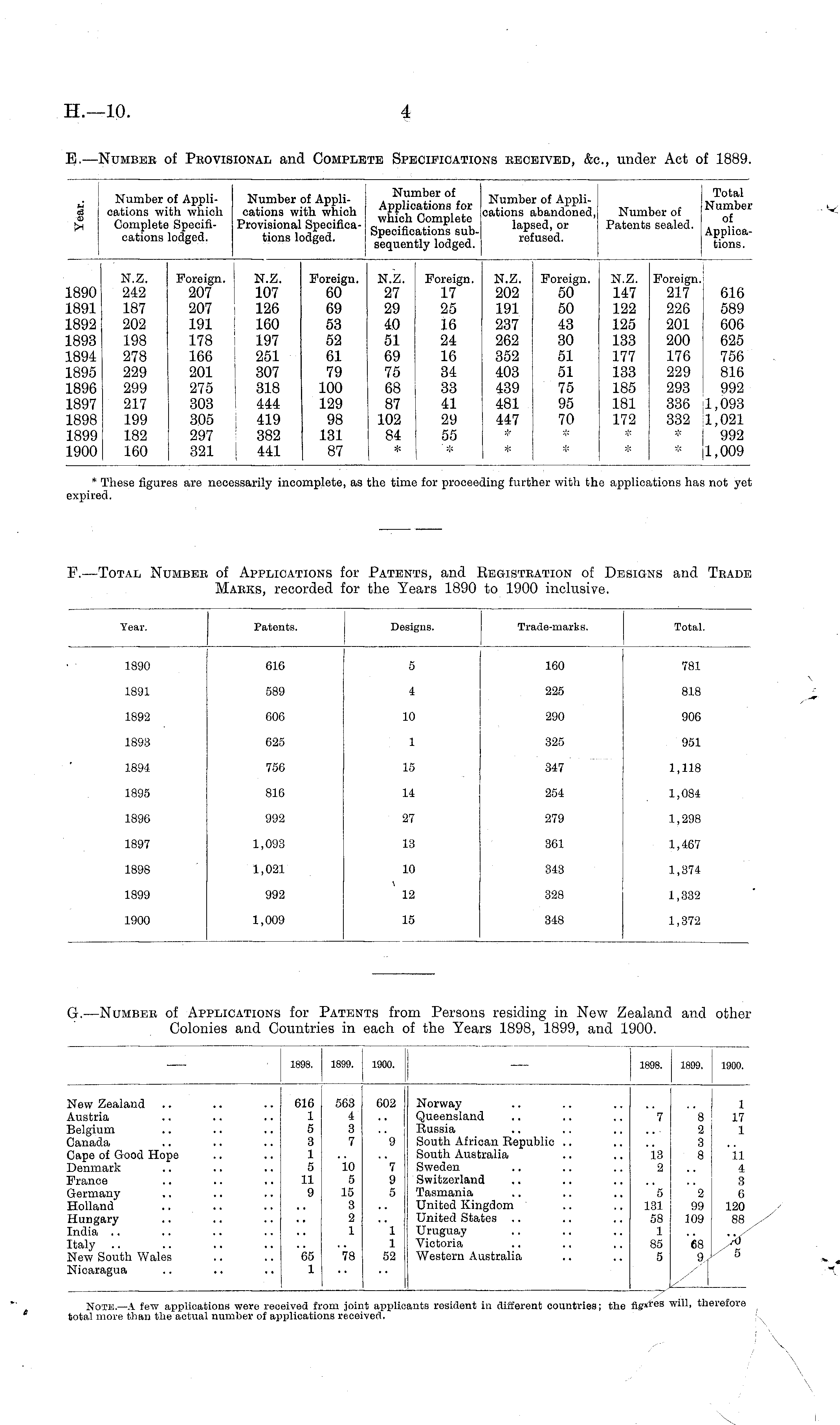 Number c. cations w: {* Complete cations of Appli- Number ith which cations w: 3 Specifi- Provisional lodged. tions li ith which £££!£* Specifica- s £™£, nber of , T . tZle-e' "3K Complete , ations sub- *) tly lodged. rel r of Applitbandoned, Num' sed, or Patents iused. Total ,er of Nu ™ ber seaIed ' Applications. 1890 1891 1892 1893 1894 1895 1896 1897 1898 1899 1900 N.Z. 242 187 202 198 278 229 299 217 199 182 160 Foreign. 207 207 191 178 166 201 275 303 305 297 321 N.Z. 107 126 160 197 251 307 318 444 419 382 441 Foreign. 60 69 53 52 61 79 100 129 98 131 87 N.Z. 27 29 40 51 69 75 68 87 102 84 * Foreign. 17 25 16 24 16 34 33 41 29 55 N.Z. 202 191 237 262 352 403 439 481 447 Foreign. 50 50 43 30 51 51 75 95 70 N.Z. 147 122 125 133 177 133 185 181 172 Foreign. 217 226 201 200 176 229 293 336 332 616 589 606 625 756 816 992 !l,093 1,021 992 jl,009 * i fhese figuri ss are necessarily incomplete, as ;he tinn for proc& ling furtl ier with th' applici .tions hai not yet expirei a.