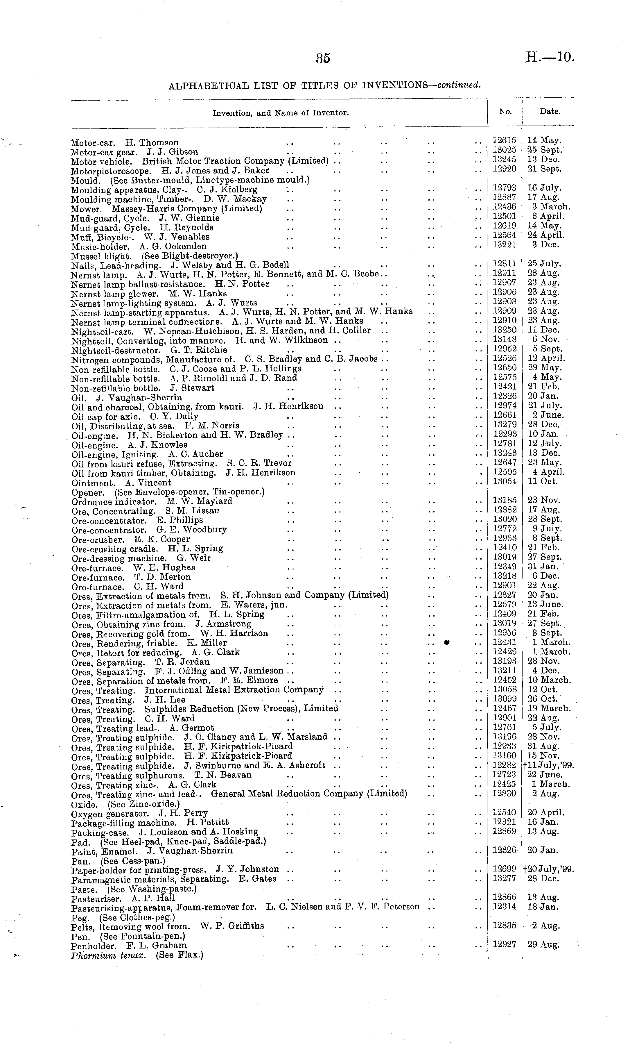 Invention, and Name of Inventor. No. Date. Motor-car. H. Thomson Motor-oar gear. J. J. Gibson Motor vehicle. British Motor Traction Company (Limited) .. Motorpictoroscope. H. J. Jones and J. Baker Mould. (See Butter-mould, Linotype-machine mould.) Moulding apparatus, Clay-. G. J. Kielberg Moulding machine, Timber-. D. W. Mackay Mower. Massey-Harris Company (Limited) Mud-guard, Cycle. J. W. Glennie Mud-guard, Cycle. H. Beynolds .. .. • • Muff, Bicycle-. W. J. Venables Music-holder. A. G. Ockenden Mussel blight. (See Blight-destroyer.) Nails, Lead-heading. J. Welsby and H. G. Bedell Nernsfc lamp. A. J. Wurts, H. N. Potter, E. Bennett, and M. C. Beebe.. .,. Nernst lamp ballast-resistance. H. N. Potter Nernst lamp glower. M. W. Hanks Nernst lamp-lighting system. A. J. Wurts Nernst lamp-starting apparatus. A. J. Wurts, H. N. Potter, and M. W. Hanks Nernst lamp terminal coiinections. A. J. Wurts and M. W. Hanks Nightsoil-cart. W. Nepean-Hutchison, H. S. Harden, and H. Collier Nightsoil, Converting, into manure. H. and W. Wilkinson .. Nightsoil-destructor. G. T. Ritchie .. Nitrogen compounds, Manufacture of. O. S. Bradley and C. B. Jacobs .. Non-rerillable bottle. O. J. Cooze and P. L. Hollirgs Non-refillable bottle. A. P. Bimoldi and J. D. Rand Non-refiilable bottle. J. Stewart Oil. J. Vaughan-Sherrin Oil and oharooal, Obtaining, from kauri. J. H. Henrikson Oil-cap for axle. C. Y. Dally .. Oil, Distributing,at sea. F. M. Norris Oil-engine. H. N. Bickerton and H. W. Bradley Oil-engine. A. J. Knowles Oil-engine, Igniting. A. C. Aucher Oil from kauri refuse, Extractine. S. C. R. Trevor Oil from kauri timber, Obtaining. J. H. Henrikson Ointment. A. Vincent Opener. (See Envelope-opener, Tin-opener.) Ordnance indicator. M. W. Maylard Ore, Concentrating. S. M. Lissau Ore-concentrator. E. Phillips Ore-concentrator. G. E. Woodbury Ore-crusher. B. K. Cooper Ore-crushing cradle. H. L. Spring Ore-dressing machine. G. Weir Ore-furnace. W. E. Hughes Ore-furnace. T. D. Merton Ore-furnace. C. H. Ward Ores, Extraction of metals from. S. H. Johnson and Company (Limited) Ores, Extraction of metals from. E. Waters, jun. Ores, Filtro-amalgamation of. H. L. Spring Ores, Obtaining zinc from. J. Armstrong Ores, Recovering gold from. W. H. Harrison Ores, Rendering, friable. K. Miller .. .. .. .. • Ores, Retort for reducing. A. G. Clark Ores, Separating. T. R. Jordan Ores, Separating. F. J. Odling and W. Jamieson .. Ores, Separation of metals from. F. E. Elmore Ores, Treating. International Metal Extraction Company Ores, Treating. J. H. Lee Ores, Treating. Sulphides Reduction (New Process), Limited Ores, Treating. C. H. Ward Ores, Treating lead-. A. Germot .. .. ■ Ore?, Treating sulphide. J. C. Clancy and L. W. Marsland Ores, Treating sulphide. H. F. Kirkpatrick-Picard Ores, Treating sulphide. H. F. Kirkpatrick-Picard Ores, Treating sulphide. J. Swinburne and B. A. Ashcroft Ores, Treating sulphurous. T. N. Beavan Ores, Treating zinc-. A. G. Clark Ores, Treating zinc- and lead-. General Metal Reduction Company (Limited) Oxide. (See Zinc-oxide.) Oxygen-generator. J. H. Perry Package-filling machine. H. Pettitt Packing-oase. J. Louisson and A. Hosking .. .. Pad. (See Heel-pad, Knee-pad, Saddle-pad.) Paint, Enamel. J. Vaughan-Sherrin Pan. (See Cess-pan.) Paper-holder for printing-press. J. Y. Johnston Paramagnetic materials, Separating. E. Gates Paste. (See Washing-paste.) Pasteuriser. A. P. Hall Pasteurising-apj.aratus, Foam-remover for. L. C. Nielsen and P. V. F. Petersen .. Peg. (See Clothes-peg.) Pelts, Removing wool from. W. P. Griffiths Pen. (See Fountain-pen.) Penholder. F. L. Graham Phormium teiiax. (See Flax.) 12615 13025 13245 12920 14 May. 25 Sept. 13 Dec. 21 Sept. 12793 12887 12436 12501 12619 12564 13221 16 July. 17 Aug. 3 March. 3 April. 14 May. 24 April. 3 Deo. 12811 12911 12907 12906 12908 12909 12910 13250 13148 12952 12520 12650 12575 12421 12326 J 2974 12661 13279 12293 12781 13243 12647 12505 13054 25 July. 23 Aug. 23 Aug. 23 Aug. 23 Aug. 23 Aug. 23 Aug. 11 Deo. 6 Nov. 5 Sept. 12 April. 29 May. 4 May. 21 Feb. 20 Jan. 21 July. 2 June. 28 Deo, 10 Jan. 12 July. 13 Deo. 23 May. 4 April. 11 Oct. 13185 12882 13020 12772 12963 12410 13019 12349 13218 12901 12327 12679 12409 13019 12956 12431 12426 13193 13211 12452 13058 13099 12467 12901 12761 13190 12933 13160 12282 12723 12425 12830 23 Nov. 17 Aug. 28 Sept. 9 July. 8 Sept. 21 Feb. 27 Sept. 31 Jan. 6 Deo. 22 Aug. 20 Jan. 13 June. 21 Feb. 27 Sept. 3 Sept. 1 March. 1 March. 28 Nov. 4 Dec. 10 March. 12 Oot. 26 Oct. 19 March. 22 Aug. 5 July. 28 Nov. 31 Aug. 15 Nov. |lljuly,'99, 22 June. 1 March. 2 Aug. 12540 12321 12869 20 April. 16 Jan. 13 Aug. 12326 20 Jan. 12699 13277 f20July,'99 28 Dec. 12866 12314 13 Aug. 18 Jan. 12835 2 Aug. 12927 29 Aug.