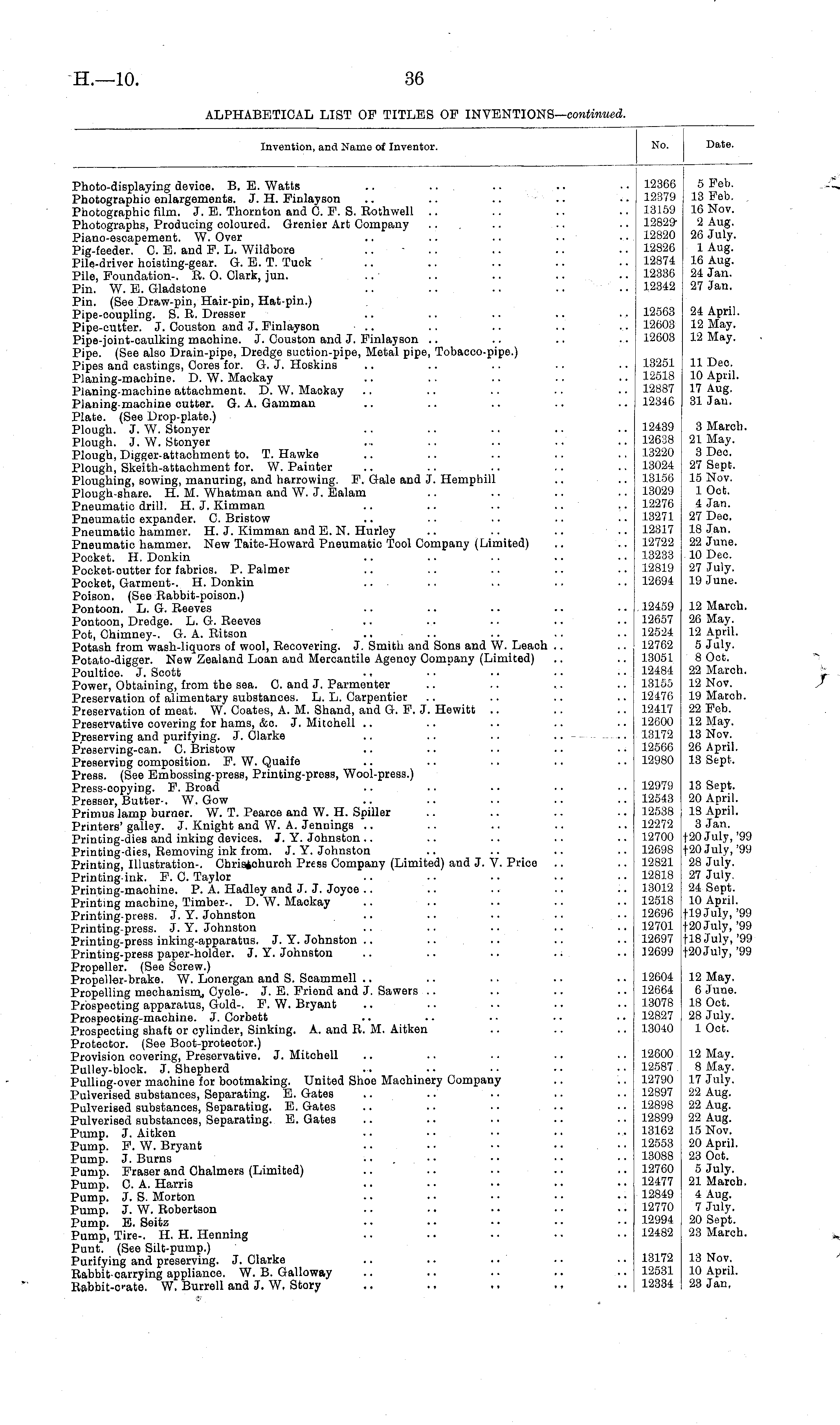 Invention, and Name of Inventor. No. Date. Photo-displaying devioe. B. E. Watts Photographic enlargements. J. H. Finlayson Photographic film. J. B. Thornton and C. F. S. Rothwell Photographs, Producing coloured. Grenier Art Company Piano-escapement. W. Over .. .. .. Pig-feeder. C. E. and F. L. Wildbore .. - Pile-driver hoisting-gear. G. E. T. Tuck Pile, Foundation-. B. O. Clark, jun. Pin. W. E. Gladstone Pin. (See Draw-pin, Hair-pin, Hat-pin.) Pipe-coupling. S. R. Dresser Pipe-cutter. J. Oouston and J. Finlayson Pipe-joint-caulking machine. J. Couston and J. Finlayson Pipe. (See also Drain-pipe, Dredge suction-pipe, Metal pipe, Tobacco-pipe.) Pipes and castings, Corea for. G. J. Hoskins Planing-machine. D. W. Mackay Planing-machine attachment. D. W. Mackay Planing-machine cutter. G. A. Gamman Plate. (See Drop-plate.) Plough. J. W. Stonyer Plough. J. W. Stonyer Plough, Digger-attachment to. T. Hawke Plough, Skeith-attachment for. W. Painter Ploughing, sowing, manuring, and harrowing. F. Gale and J. Hemphill Plough-share. H. M. Whatman and W. J. Ealam Pneumatic drill. H. J. Kimman Pneumatic expander. C. Bristow Pneumatic hammer. H. J. Kimman and E. N. Hurley Pneumatic hammer. New Taite-Howard Pneumatic Tool Company (Limited) Pocket. H. Donkin Pocket-outter for fabrics. P. Palmer Pocket, Garment-. H. Donkin Poison. (See Rabbit-poison.) Pontoon. L. G. Reeves Pontoon, Dredge. L. G. Reeves Pot, Chimney-. G. A. Ritson Potash from wash-liquors of wool, Recovering. J. Smith and Sons and W. Leach .. Potato-digger. New Zealand Loan and Mercantile Agency Company (Limited) Poultice. J. Scott Power, Obtaining, from the sea. C. and J. Parmenter Preservation of alimentary substances. L. L. Carpentier Preservation of meat. W. Coates, A. M. Shand, and G. E\ J. Hewitt Preservative covering for hams, &o. J. Mitchell Preserving and purifying. J. Clarke Preserving-can. C. Bristow Preserving composition. F. W. Quaife Press. (See Embossing-press, Printing-press, Wool-press.) Press-copying. F. Broad Presser, Butter-. W. Gow Primus lamp burner. W. T. Pearce and W. H. Spiller Printers' galley. J. Knight and W. A. Jennings Printing-dies and inking devices. J. Y. Johnston Printing-dies, Removing ink from. J. Y. Johnston Printing, Illustration-. Christehurch Press Company (Limited) and J. V. Price Printing-ink. F.C.Taylor PrintiDg-machine. P. A. Hadley and J. J. Joyoe Printing machine, Timber-. D. W. Mackay Printing-press. J.Y.Johnston .. .. .. ... Printing-press. J. Y. Johnston Printing-press inking-apparatus. J. Y. Johnston Printing-press paper-holder. J. Y. Johnston .. .. .. Propeller. (See Screw.) Propeller-brake. W. Lonergan and S. Scammell Propelling mechanism, Cycle-. J. E. Friend and J. Sawers Prospecting apparatus, Gold-. F. W. Bryant .. .. ... Prospecting-machine. J. Corbett Prospecting shaft or cylinder, Sinking. A. and R. M. Aitken Protector. (See Boot-proteotor.) Provision covering, Preservative. J. Mitchell Pulley-block. J. Shepherd Pulling-over machine for bootmaking. United Shoe Machinery Company Pulverised substances, Separating. E. Gates Pulverised substances, Separating. B. Gates Pulverised substances, Separating. E. Gates Pump. J. Aitken Pump. F. W. Bryant Pump. J. Burns ... Pump. Fraser and Chalmers (Limited) Pump. O. A. Harris Pump. J. S. Morton Pump. J. W. Robertson Pump. E. Seitz Pump, Tire-. H. H. Henning Punt. (See Silt-pump.) Purifying and preserving. J. Clarke Rabbit-oarrying appliance. W. B. Galloway Rabbit-o-ate. W. Burrell and J. W, Story 12366 12379 ! 13159 I 1282912820 12826 12874 12336 12342 5 Feb. 13 Feb. 16 Nov. 2 Aug. 26 July. 1 Aug. 16 Aug. 24 Jan. 27 Jan. 12563 12603 12603 24 April. 12 May. 12 May. 13251 12518 12887 12346 11 Dec. 10 April. 17 Aug. 31 Jan. 12439 12638 13220 13024 13156 13029 12276 13271 12317 12722 13233 12819 12694 3 March. 21 May. 3 Dec. 27 Sept. 15 Nov. 1 Oct. 4 Jan. 27 Dec. 18 Jan. 22 June. . 10 Dec. 27 July. 19 June. 12459 12657 12524 12762 13051 12484 13155 12476 12417 12600 13172 12566 12980 12 March. 26 May. 12 April. 5 July. 8 Oct. 22 March. 12 Nov. 19 March. 22 Feb. 12 May. 13 Nov. 26 April. 13 Sept. 12979 12543 12538 12272 12700 12698 12821 12818 13012 12518 12696 12701 12697 12699 13 Sept. 20 April. 18 April. 3 Jan. f20 July, '99 \20 July, '99 28 July. 27 July. 24 Sept. 10 April. 119 July, '99 l 20July, '99 tl8July,'99 f20July, '99 12604 12664 13078 12827 13040 12 May. 6 June. 18 Oct. 28 July. lOct. 12800 12587 12790 12897 12898 12899 13162 12553 13088 12760 12477 12849 12770 12994 12482 12 May. 8 May. 17 July. 22 Aug. 22 Aug. 22 Aug. 15 Nov. 20 April. 23 Oct. 5 July. 21 March. 4 Aug. 7 July. 20 Sept. 23 March. 13172 12531 12334 13 Nov. 10 April. 23 Jan,