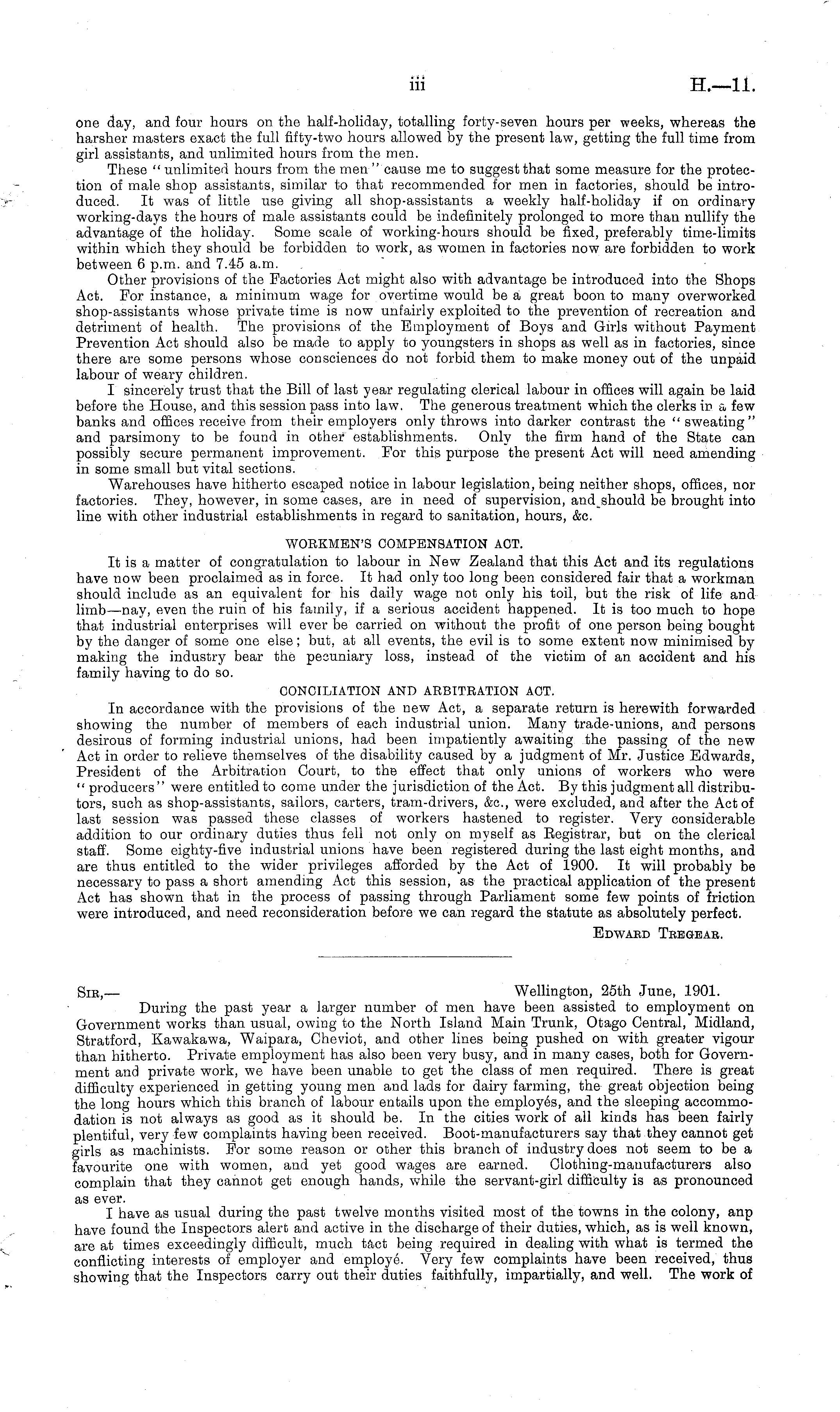 one day, and four hours on the half-holiday, totalling forty-seven hours per weeks, whereas the harsher masters exact the full fifty-two hours allowed by the present law, getting the full time from girl assistants, and unlimited hours from the men. These "unlimited hours from the men "cause me to suggest that some measure for the protection of male shop assistants, similar to that recommended for men in factories, should be introduced. It was of little use giving all shop-assistants a weekly half-holiday if on ordinary working-days the hours of male assistants could be indefinitely prolonged to more than nullify the advantage of the holiday. Some scale of working-hours should be fixed, preferably time-limits within which they should be forbidden to work, as women in factories now are forbidden to work between 6 p.m. and 7.45 a.m. Other provisions of the Factories Act might also with advantage be introduced into the Shops Act. For instance, a minimum wage for overtime would be a great boon to many overworked shop-assistants whose private time is now unfairly exploited to the prevention of recreation and detriment of health. The provisions of the Employment of Boys and Girls without Payment Prevention Act should also be made to apply to youngsters in shops as well as in factories, since there are some persons whose consciences do not forbid them to make money out of the unpaid labour of weary children. I sincerely trust that the Bill of last year regulating clerical labour in offices will again be laid before the House, and this session pass into law. The generous treatment which the clerks in a few banks and offices receive from their employers only throws into darker contrast the "sweating" and parsimony to be found in other establishments. Only the firm hand of the State can possibly secure permanent improvement. For this purpose the present Act will need amending in some small but vital sections. Warehouses have hitherto escaped notice in labour legislation, being neither shops, offices, nor factories. They, however, in some cases, are in need of supervision, and should be brought into line with other industrial establishments in regard to sanitation, hours, &c. WORKMEN'S COMPENSATION ACT. It is a matter of congratulation to labour in New Zealand that this Act and its regulations have now been proclaimed as in force. It had only too long been considered fair that a workman should include as an equivalent for his daily wage not only his toil, but the risk of life and limb—nay, even the ruin of his family, if a serious accident happened. It is too much to hope that industrial enterprises will ever be carried on without the profit of one person being bought by the danger of some one else; but, at all events, the evil is to some extent now minimised by making the industry bear the pecuniary loss, instead of the victim of an accident and his family having to do so. CONCILIATION AND ARBITRATION ACT. In accordance with the provisions of the new Act, a separate return is herewith forwarded showing the number of members of each industrial union. Many trade-unions, and persons desirous of forming industrial unions, had been impatiently awaiting the passing of the new Act in order to relieve themselves of the disability caused by a judgment of Mr. Justice Edwards, President of the Arbitration Court, to the effect that only unions of workers who were " producers" were entitled to come under the jurisdiction of the Act. By this judgment all distributors, such as shop-assistants, sailors, carters, tram-drivers, &c, were excluded, and after the Act of last session was passed these classes of workers hastened to register. Very considerable addition to our ordinary duties thus fell not only on myself as Registrar, but on the clerical staff. Some eighty-five industrial unions have been registered during the last eight months, and are thus entitled to the wider privileges afforded by the Act of 1900. It will probably be necessary to pass a short amending Act this session, as the practical application of the present Act has shown that in the process of passing through Parliament some few points of friction were introduced, and need reconsideration before we can regard the statute as absolutely perfect. Edward Tregear.