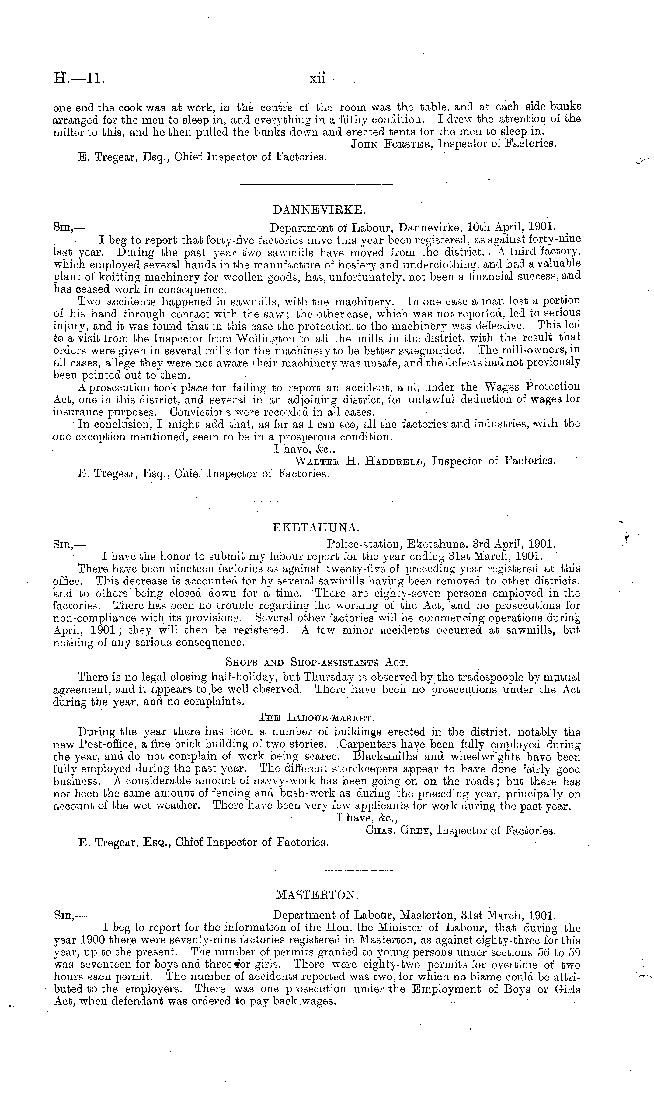 MASTERTON. Sir, — Department of Labour, Masterton, 31st March, 1901. I beg to report for the information of the Hon. the Minister of Labour, that during the year 1900 there were seventy-nine factories registered in Masterton, as against eighty-three for this year, up to the present. The number of permits granted to young persons under sections 56 to 59 was seventeen for boys and three 4or girls. There were eighty-two permits for overtime of two hours each permit. The number of accidents reported was two, for which no blame could be attributed to the employers. There was one prosecution under the Employment of Boys or Girls Act, when defendant was ordered to pay back wages.