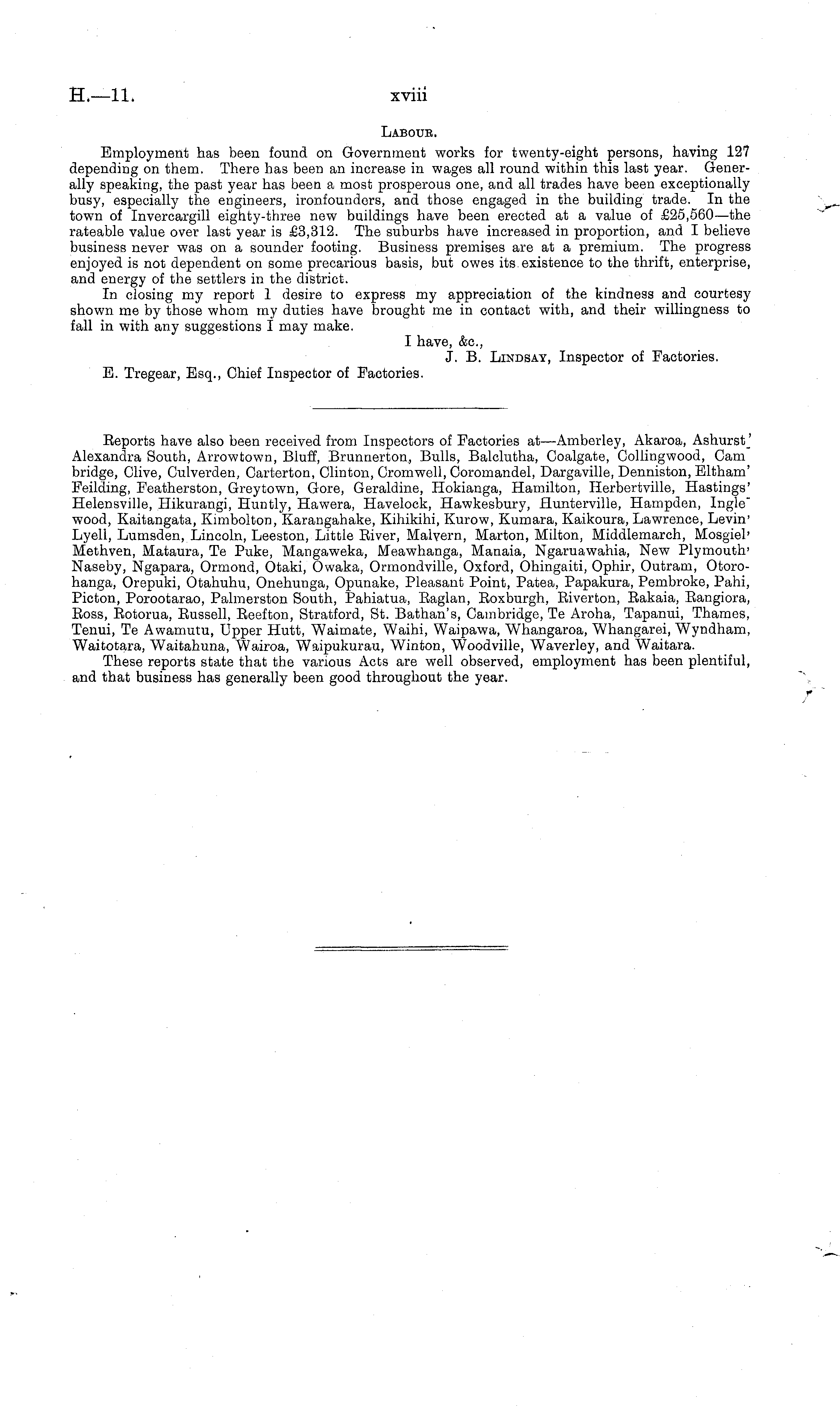 Reports have also been received from Inspectors of Factories at—Amberley, Akaroa, Ashurst_' Alexandra South, Arrowtown, Bluff, Brunnerton, Bulls, Balclutha, Coalgate, Collingwood, Cam bridge, Clive, Culverden, Carterton, Clinton, Cromwell, Coromandel, Dargaville, Denniston, Eltham' Feilding, Featherston, Greytown, Gore, Geraldine, Hokianga, Hamilton, Herbertville, Hastings' Helensville, Hikurangi, Huntly, Hawera, Havelock, Hawkesbury, Hunterville, Hampden, Ingle" wood, Kaitangata, Kimbolton, Karangahake, Kihikihi, Kurow, Kumara, Kaikoura, Lawrence, Levin' Lyell, Lumsden, Lincoln, Leeston, Little River, Malvern, Marton, Milton, Middlemarch, Mosgiel' Methven, Mataura, Te Puke, Mangaweka, Meawhanga, Manaia, Ngaruawahia, New Plymouth' Naseby, Ngapara, Ormond, Otaki, Owaka, Ormondville, Oxford, Ohingaiti, Ophir, Outram, Otorohanga, Orepuki, Otahuhu, Onehunga, Opunake, Pleasant Point, Patea, Papakura, Pembroke, Pahi, Picton, Porootarao, Palmerston South, Pahiatua, Raglan, Roxburgh, Riverton, Rakaia, Rangiora, Ross, Rotorua, Russell, Reefton, Stratford, St. Bathan's, Cambridge, Te Aroha, Tapanui, Thames, Tenui, Te Awamutu, Upper Hutt, Waimate, Waihi, Waipawa, Whangaroa, Whangarei, Wyndham, Waitotara, Waitahuna, Wairoa, Waipukurau, Winton, Woodville, Waverley, and Waitara. These reports state that the various Acts are well observed, employment has been plentiful, and that business has generally been good throughout the year.
