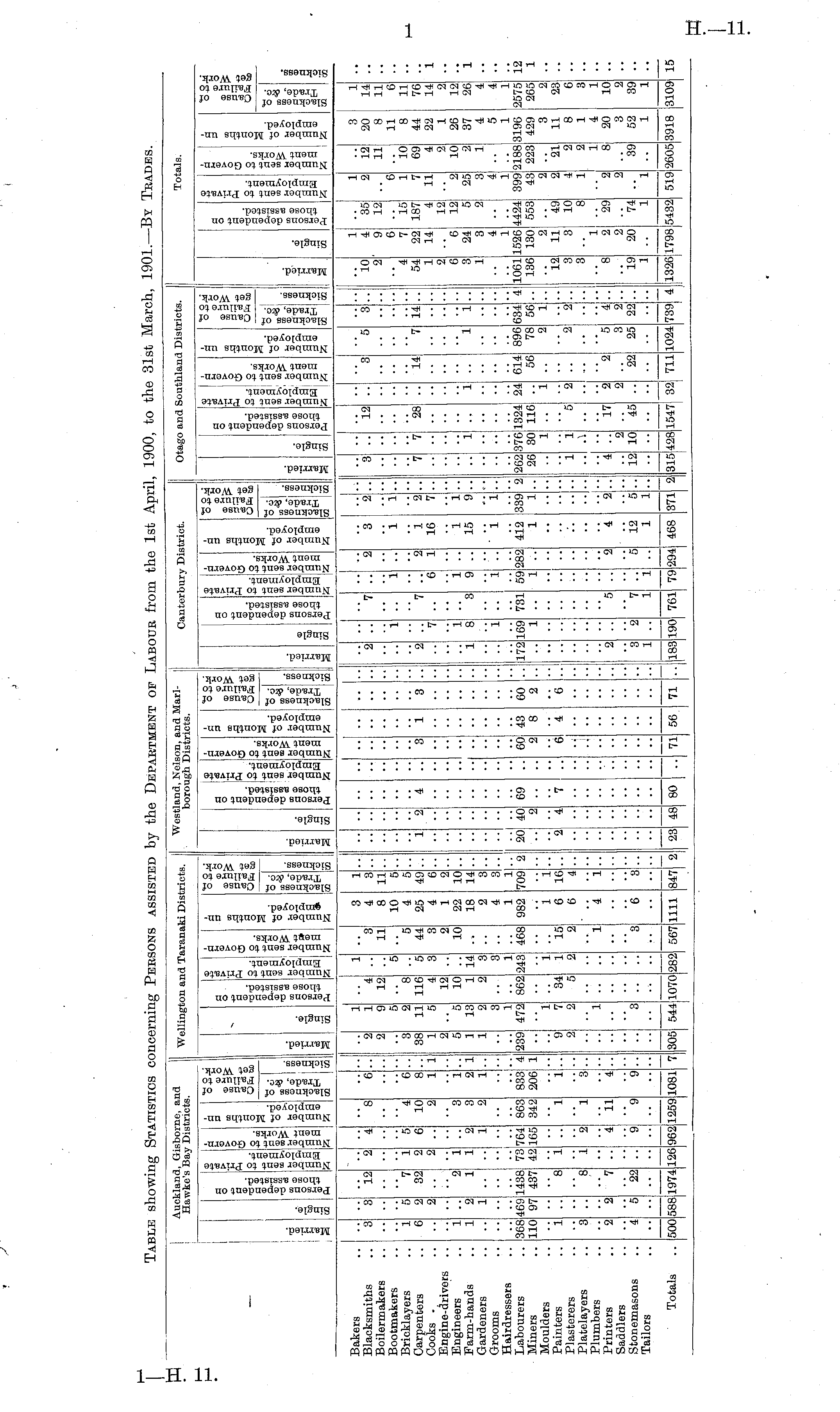 I Auckland, Gisborne, and Hawke's Bay Districts. Wellington and Taranaki Districts. Westland, Nelson, and Marlborough Districts. Canterbury District. Otago and Southland Districts. Totals. I d O d © • a © "_ <D"*= S ga la l«" O O • += 02 a a 3 co o o Ol o J2 ft aa 3 © a © O IIP o d to - co © © co CD 4- -rf 33 53 3 o 3 a a® 5 I ca 2 a a2 CD 3 co (^ a a CD O o . co a a CD O CD 43 .a » a§ 3 a a a 3 CO 43 a o •HT3 o © aa 3 © a o d S CO © j 43 Sh a Ph a® ! a §_ aa r\ !5 d © o a 3 CO +4 a o o © .a P. aa 3 © a © o 33_ Oft „ CO - co © © co .a g a 53 33 a o 43 a © . •B-3 a © ©44 ■§1 S © © as ■a S° © 'P o _; il a 3 CD - -o >, a 3 © 4= CO a a © o .0 d IS a a CO .a a o o © ©^ 3 © a © o O d © d © © w d © og 02 © ©+= S | a eg 4H a: * » 43 © : 43D1J a a a 3 © a © o CO >> coj> a la a 3 CO 43 3 o © aa 3 © a 044 © sa co c3 oh © a o © . a ® ll 2 © P4 © d * CD 9 a d © O += 03 d b Oj O la a a 3 CO -4= a o o © KC? 3Q a aa 3 © a T< O _I © o o © So S © -d c5 CO CO a o © O . ©43 A2 3 a O O. CO -' a _ 53 CO CO a o at o d ! CO - CO CD a-o CD H 53 03 m ID O ©' H CD DC a 53 a 33 CD 53 © d CD a - 1 4 ' 9 6 7 22 14 1 2 3 20 8 11 8 44 22 1 26 37 4 5 1 3196 429 3 11 8 1 4 20 3 52 1 1 14 11 6 11 76 14 2 12 26 4 4 1 2575 265 2 23 6 3 1 10 39 1 Bakers Blacksmiths Boilermakers Bootmakers Bricklayers Carpenters Cooks Engine-drivers .. Engineers Farm-hands Gardeners Grooms Hairdressers Labourers Miners Moulders Painters Plasterers Platelayers Plumbers Printers Saddlers Stonemasons Tailors 3 6 1 1 '3 5 2 2 '2 1 '12 "7 32 "2 1 1438 437 2 1 2 2 1 1 73 42 '4 '5 6 2 1 "8 •• 4 10 2 3 3 2 •• I 863 342 6 6 8 1 1 2 1 "I i 2 2 3 38 1 2 5 1 1 1 1 9 5 2 11 5 5 13 2 3 1 472 4 12 8 116 4 12 10 1 2 1 h "5 3 14 3 3 1 243 '3 11 5 44 3 2 10 1 3 4 8 10 4 25 4 1 22 18 2 4 1 982 1 3 11 5 5 49 6 2 10 14 3 3 1 709 •• •• •I •■I 1 •• '2 •• '4 ..1 ..I 1 ..I "I • - "3 ••I ■• i 3 2 2 I 1 1 7 1 8 i "7 7 "3 •• I 731 i 6 1 9 i 59 1 2 "2 1 282 3 i i 16 i 15 ' i 412 1 '2 i 2 7 i 9 "i 339 1 " 262 26 '3 7 •• '7 " 1 376 30 1 12 '28 1324 116 ■■ 1 24 3 '14 614 56 "5 "7 "l •• I 896 78 2 3 - - 14 1 634 56 1 io 2' •• 4 54 1 2 6 3 1 1061 136 6 24 3 4 1 1526 130 2 11 3 35 12 15 187 4 12 12 5 2 4424 553 6 1 7 11 2 25 3 4 1 399 43 2 2 4 1 i2 11 10 69 4 2 10 2 1 " 21881 223j 1 i 12 1 368 110 469 97 764 165 833 206 4 l 239 862 468 2 20 40 2 69 60 2 43 8 60 2 172 169 1 '2 '4 1 7 2 1 1 2 1 6 6 1 16 4 "I i 12 3 3 49 10 8 i "8 i 1 1 9 2 34 5 15 2 2 4 ' 7 6 '4 I 6 •• ! "I ■• • ■I 1 i 1 "5 2 2 2 •• 21 2 2 1 8 3 "8 i '_ 1 3 " I ••! "1 ... 1 2 2 20 '2 2 '4 ii "l "l '4 1 "5 '2 4 '2 '4 H I 17 '2 2 "2 5 3 25 4 2 22 ..I "8 29 "2 2 '7 '4 •■ " 2 4 5 '22 9 "9 9 "3 "3 6 3 3 1 2 7 1 5 12 1 '5 1 12 2 10 '45 22 19 1 74 1 39 •• "l i •• H •• •• ■■• •I 1326 Totals .. 500 588 1974 - 962 1259 1081 7 305 544 1070 282 847 - H — 80 — 56 — - 183 190 761 79 294 371 2 315 428 1547 32 711 1024 739 4 1798 5432 519 2605 3918 3109 126J 567 1111 2 23 48 •• 71 71 468