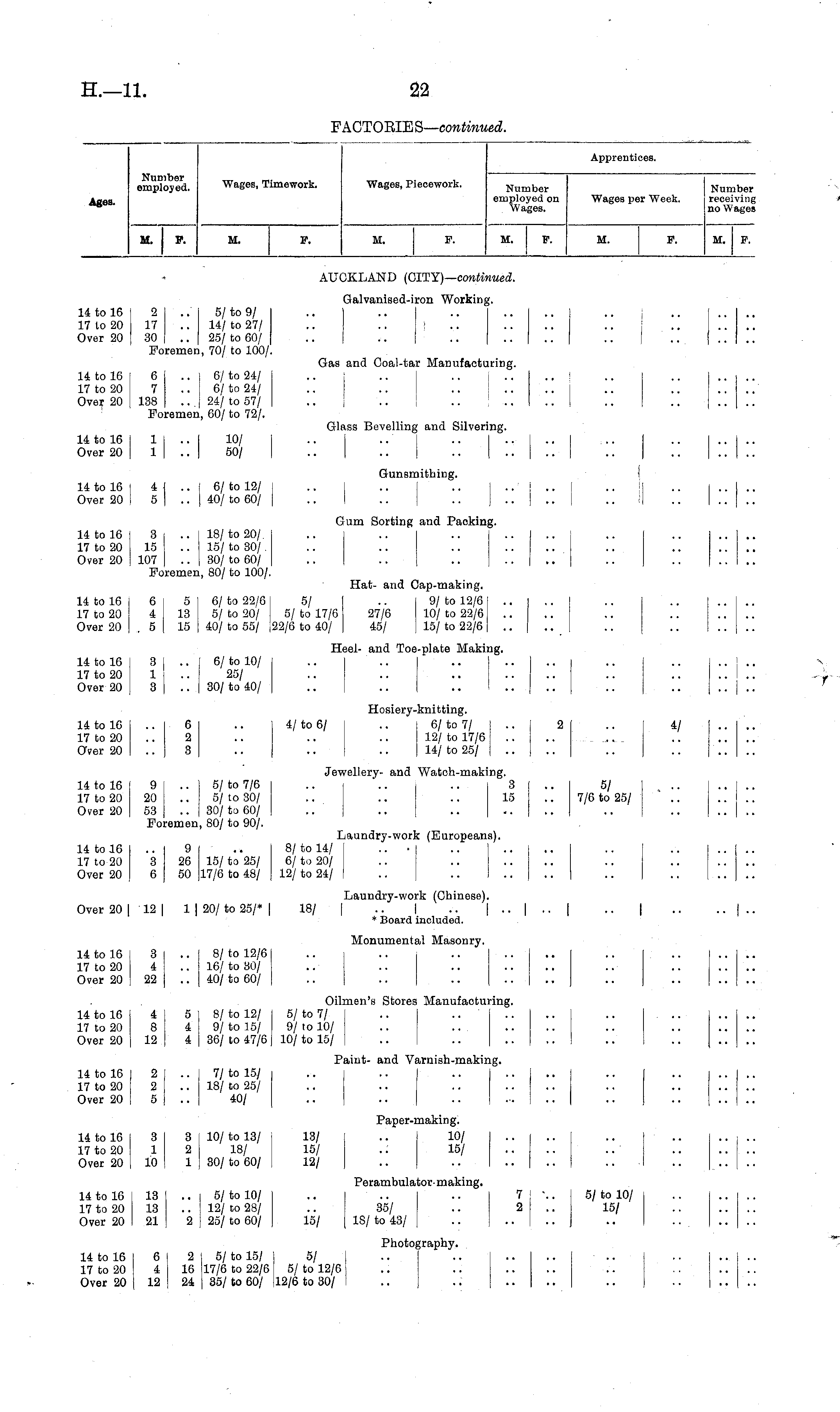 Apprentices. Number employed. Wages, Timework. Wages, Piecework. Wages per Week. Number receiving no Wages Ages. Number employed on Wages. M. F. M. F. M. F. M. F. M. F. M. F. AUCKLAND (CITY)— continued. Galvanised-iron Working. 14 to 16 2 .. 5/ to 9/ .. | 17 to 20 17 .. 14/ to 27/ .. .. I .. Over 20 30 .. 25/ to 60/ Foremen, 70/ to 100/. Gas and Coal-tar Manufacturing. 14 to 16 6 .. 6/ to 24/ .. .. .. .. .. ! 17 to 20 7 .. 6/ to 24/ Over 20 138 .. 24/ to 57/ .. .. .. .. | .. | Foremen, 60/ to 72/. Glass Bevelling and Silvering. 14 to 16 j 1 | .. I 10/ I .. ..' .. I .. I .. I .. [ Over 20 | 1 | .. | 50/ | .. .. | .. | .. | .. .. | Gunsmithing. ! 14 to 16 I 4 | .. I 6/ to 12/ j .. I .. I .. | .. | .. [ .. I Over 20 I 5 | .. | 40/to 60/ | .. I .. .. j .. j .. .. !| Gum Sorting and Paoking. 14 to 16 3 .. 18/to 20/. I 17 to 20 15 .. 15/ to 30/. Over 20 107 .. 30/ to 60/ | Foremen, 80/ to 100/. Hat- and Cap-making. 14 to 16 6 5 6/ to 22/615/ .. 9/ to 12/6 .. i .. 17 to 20 4 13 5/ to 20/ 5/ to 17/6 27/6 10/ to 22/6 Over 20 5 15 40/to 55/ ,22/6 to 40/ 45/ 15/to 22/6 .. | .. Heel- and Toe-plate Making. 14 to 16 3 | .. I 6/ to 10/ 17 to 20 1 I ■ ■ 25/ Over 20 3 | .. | 30/ to 40/ 1 :: j:: Hosiery-knitting. 14 to 16 .. 6 .. 4/ to 6/ .. 6/ to 7/ .. 2 17 to 20 .. 2 .. .. .. 12/ to 17/6 Over 20 3 .. .. .. 14/ to 25/ il Jewellery- and Watch-making. 14 to 16 9 .. 5/ to 7/6 .. .. .. 3 .. 5/ 17 to 20 20 .. 5/ to 30/ .. .. .. 15 .. 7/6 to 25/ Over 20 53 .. 30/to 60/ Foremen, 80/ to 90/. Laundry-work (Europeans). 14 to 16 .. 9 .. 8/ to 14/ • • ■ I 17 to 20 3 26 15/to 25/ 6/to 20/ Over 20 6 50 17/6 to 48/ 12/ to 24/ Laundry-work (Chinese). Over 20 | 12 | 1 | 20/ to 25/* | 18/ | .. I .. | .. | .. | .. | * Board included. .. i.. Monumental Masonry. 14 to 16 3 .. 8/ to 12/6 17 to 20 4 .. 16/ to 30/ Over 20 22 .. 40/ to 60/ Oilmen's Stores Manufacturing. 14 to 16 4 5 8/ to 12/ 5/ to 7/ .. 17 to 20 8 4 9/ to 15/ 9/ to 10/ Over 20 12 4 36/ to 47/6 10/ to 15/ Paint- and Varnish-making. 14 to 16 2 .. 7/ to 15/ .. .. [ •• 17 to 20 2 .. 18/ to 25/ Over 20 5 40/ .. .. .. .... Paper-making. 14 to 16 3 3 10/ to 13/ 13/ .. 10/ .... 17 to 20 1 2 18/ 15/ .: 15/ .... Over 20 10 1 30/ to 60/ 12/ .. .. .. .. ... Perambulator- making. 14 to 16 13 .. 5/ to 10/ .. .. .. 7 j •.. 5/ to 10/ 17 to 20 13 .. 12/ to 28/ .. 35/ .. 2 I .. 15/ Over 20 21 2 25/ to 60/ 15/ IS/ to 43/ Photography. 14 to 16 6 2 I 5/ to 15/ 5/ 17 to 20 4 16 17/6 to 22/6 5/ to 12/6 Over 20 12 24 | 35/ to 60/ 12/6 to 30/ I