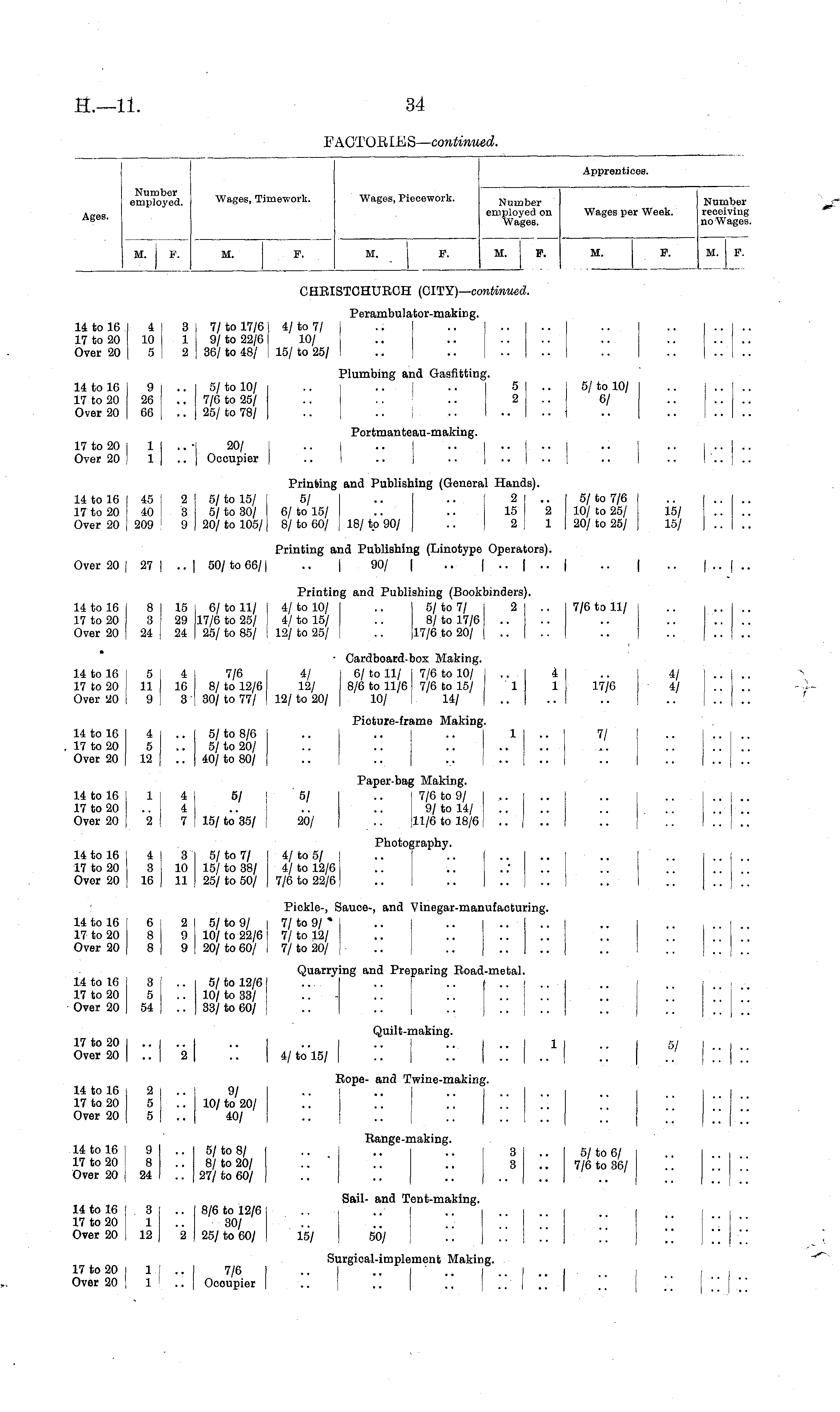Lpprem iices. Number employed. Wages, Timework. Wages, Piecework. Number receiving no Wages-. Ages. Number employed on Wages. Wages per Week. I ~~ " ' I M. F. M. F. M. F. M. F. M. M. P. M. F. M. F. M. P. F. M. F. M. F. CHRISTCHURCH (CITY)— continued. Perambulator-making. 14 to 16 4 3 7/ to 17/6 4/ to 7/ 17 to 20 10 1 9/ to 22/6 10/ Over 20 5 2 36/ to 48/ 15/ to 25/ Plumbing and Gasfitting. 14 to 16 9 .. 5/ to 10/ .. .. [ .. 5 .. 5/ to 10/ 17 to 20 26 .. 7/6 to 25/ .. .. .. 2 .. 6/ Over 20 66 .. 25/ to 78/ .. .. | .. .. .. \ Portmanteau-making. 17 to 20 l 11 .. -I 20/ I .. I .. .. I ..' I .. I .. | Over 20 I 1 | .. | Oooupier | .. 1 .. .. | .." * | .. .. | Printing and Publishing (General Hands). 14 to 16 45: 2 5/to 15/ 5/ .. .. 2 .. 5/to 7/6 17 to 20 40 I 3 5/ to 30/ 6/ to 15/ .. .. 15 2 10/ to 25/ Over 20 209 ' 9 20/ to 105/ 8/ to 60/ 18/ to 90/ .. 2 1 20/ to 25/ 15/ 15/ Printing and Publishing (Linotype Operators). Over 20 | 27 | .. | 50/ to 66/1 .. | 90/ | .. | .. | .. | .. | I •• I •• Printing and Publishing (Bookbinders). 14 to 16 8 15 6/ to 11/ 4/ to 10/ .. 5/ to 7/ 2 .. 7/6 to 11/ 17 to 20 3 29 17/6 to 25/ 4/ to 15/ .. 8/ to 17/6 Over 20 24 24 25/ to 85/ 12/ to 25/ .. 17/6 to 20/ ■ Cardboard-box Making. 14 to 16 5 4 7/6 4/ I 6/ to 11/ 7/6 to 10/ I .. 4 17 to 20 11 16 8/ to 12/6 12/ 8/6 to 11/6 7/6 to 15/ 1 1 17/6 Over 20 9 3 30/ to 77/ 12/ to 20/ | 10/ 14/ | .. 4/ il Picture-frame Making. 14 to 16 4 .. 5/ to 8/6 .. I .. j .. 1 .. 7/ 17 to 20 5 .. 5/ to 20/ Over 20 12 .. 40/ to 80/ Paper-bag Making. 14 to 16 1 41 5/ ! '5/ .. 7/6 to 9/ .. i .. .. I 17 to 20 .. 4 | .. .. .. 9/ to 14/ .... Over 20 2 7 I 15/ to 35/ \ 20/ .. 11/6 to 18/6 .. | .. Photography. 14 to 16 4 3 "5/ to 7/ 4/to 5/ 17 to 20 3 10 15/ to 38/ 4/ to 12/6 Over 20 16 11 25/ to 50/ 7/6 to 22/6 Pickle-, Sauce-, and Vinegar-manufacturing. 14 to 16 6 2 5/ to 9/ 7/ to 9/ * .. .. .. I .. 17 to 20 8 9 10/ to 22/6 7/ to 12/ .. .. .. I .. Over 20 8 9 20/ to 60/ 7/ to 20/ .. .. .. I .. Quarrying and Preparing Road-metal. 14 to 16 3 .. 1 5/ to 12/6 .. .. I .. .. I .. ■ 17 to 20 5 .. 10/ to 33/ Over 20 54 .. j 33/ to 60/ .. .. | Quilt-making. 17 to 20 I .. I .. I .. I .. I .. .. I .. I 11 I Over 20 | .. | 2 | .. | 4/ to 15/ | .. | .. | .. 5/ Rope- and Twine-making. 14 to 16 2 9/ 17 to 20 5 .. 10/ to 20/ Over 20 5 40/ Range-making. 14 to 16 | 9 .. 5/ to 8/ .. I .. .. 3 .. 5/ to 6/ 17to20l 8 .. 8/to 20/ .. .. .. 3 .. 7/6 to 36/ Over 20 j 24 .. 27/ to 60/ .. Sail- and Tent-making. 14 to 16 3 .. 8/6 to 12/6 17 to 20 1 .. 30/ Over 20 12 2 25/ to 60/ 15/ 50/ Surgical-implement Making. 17 to 20 | 1 | .. I 7/6 1 .. .. j .. [ .. I .. I I Over 20 I 1 [ .. j Oooupier | .. .. .. ..."",..
