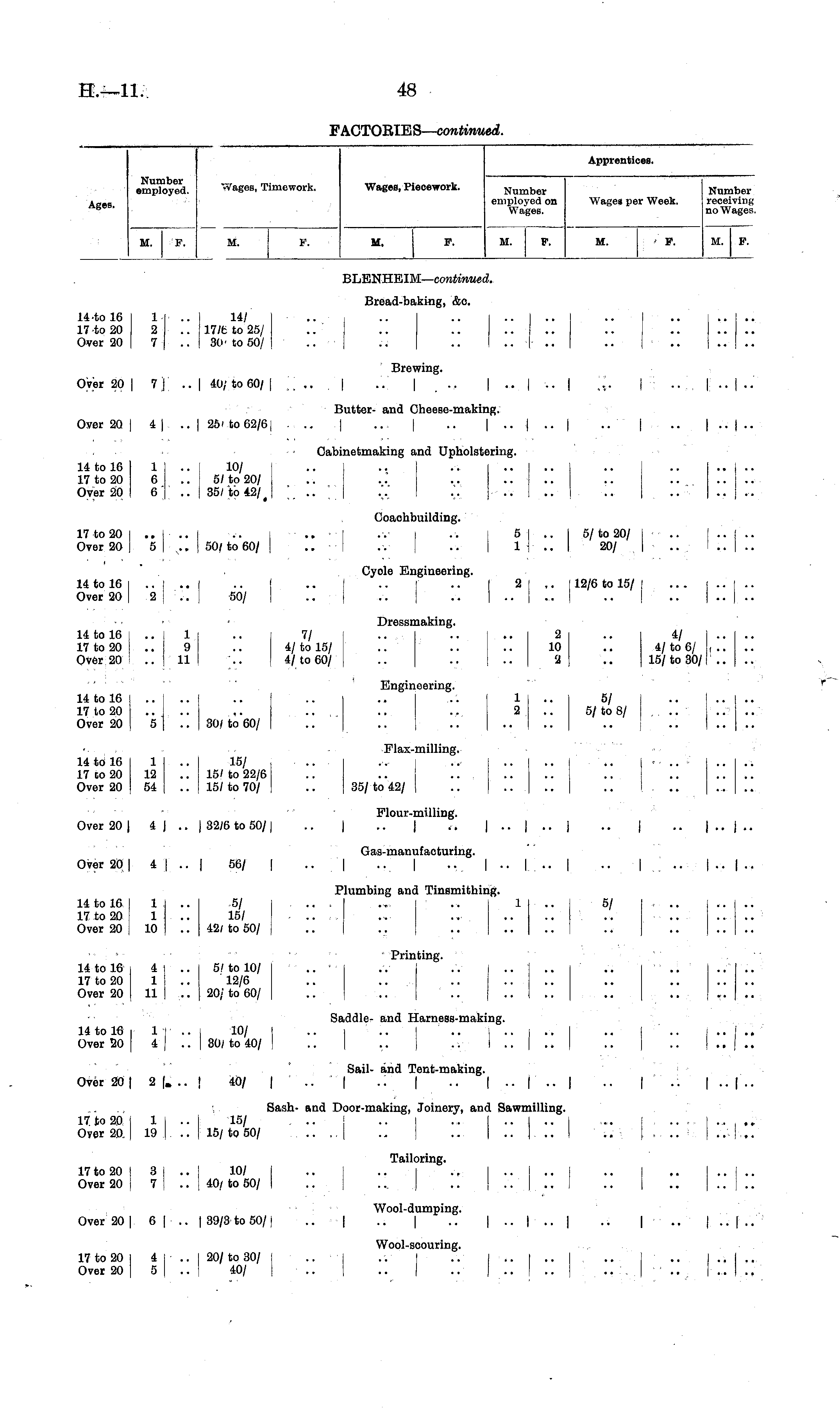 Lpprenl bices. Number employed. Wages, Timework. Wages, Piecework. Ages. Number employed on Wages. Wages per Week. Number receiving no Wages. M. F. M. F. M. F. M. F. M. - F. M. F. BLENHEIM— continued. Bread-baking, &c. L4tol6 1 .. 14/ .. .. .. .. .. I .. l7 to 20 2 .. 17/6 to 25/ .. ' .. .. .. .. .. Dver 20 7 .. 30' to 50/ .. .. .. .. .. .. .. .. .. Brewing. Dyer 20 | 7J .. | 40/to 60/| ;... . | .','. I . •• I •• I •• I '.'•>• I ••'.. I ••!•• Butter- and Cheese-making. Dver 20 | 4| .. | 25' to 62/61 ... | ... | .. | .. | .. | .. " | .. |.. | .. Cabinetmaking and Upholstering. L4tol6 1 .. 10/ .. .. .. I .. .. .. L7 to 20 6 .. 5/ to 20/ .. ..' .. .... .. Dver 20 6 .. 35/ to 42/ * .. .'.' .'. .. .. .. .. .... Coachbuilding. L7to20 I .. I .. I .. .. •• I .v | .. I 5 I .. I 5/to 20/ I - .. I .. I ., Dver 20 | 5 I ,.. | 50/to 60/ | .. --| .-.- | .. I 1 \- .. I 20/ I .. ; I .... | .. , Cyole Engineering. .4 to 16 I .. I .. I .. | .. | .. I .. | 2 I .. 112/6 to 15/ I ... | ,.' I ., Dver 20 | 2 | .. | -50/ .. .-. .. | .. ! .. .. | .. | .. | .. Dressmaking. .4 to 16 I .. | 1 .. 7/ .. .. .. 2 .. 4/ .... L7 to 20 .. I 9 .. 4/ to 15/ .. .. .. 10 .. 4/ to 6/ , .... Dver 20 .. I 11 .. 4/co60/ .. .. .. 2 .. 15/to 30/ .. .. Engineering. A to 16 .. .. .. .. 1 .. 5/ j .. I .. .. .7 to 20 .. .. ,. ... .. .. 2 .. 5/ to 8/ j ........ Dver 20 5 | .. 30/ to 60/ .. .. .. .. .. .. | .. | .. .. • , Flax-milling. L4 to 16 1 .. 15/ ... .-, j .. .. .. .. ... .. .. .7 co 20 12 .. 15/to 22/6 .. .. .. .. .. .. Dver 20 54 .. 15/ to 70/ .. 35/to 42/ | .. .... .. .. Flour-milling. Dver 20 | 4 J .. | 32/6 to 50/| | | .. 1 .. | .. | .. | .. | .. | .. Gas-manufacturing. Dver 20 | 4 | .. | 56/ | .. | .. | .. | .. | . .. | ... \ .. | ... | .. Plumbing and Tinsmithing. L4tol6 1 5/ ...... I ., .. 1 .. 5/ L7 to 20 1 .. 15/ .. .. .,. .. .... .. .. .. Dver 20 10 .. 42/ to 50/ .. .. .. .. .. .. '.•;•■ Printing. 14 to 16 4 .. 5/ to 10/ .. .. .. I .. .. .. .. .. .. 17 to 20 1 .. 12/6 .. .. .. .. .. .. Dver 20 11 ... 20; to 60/ .. .. .. .. .. .. Saddle- and HarneSB-making. 14 to 16 I Ir ., I 10/ I .. I .. I .. I .. I '.-,' I .. I ' .. | .. | .. Dver 20 | 4 ) .. I 30/ to 40/ | .. .. .. I .. | .. .. .. | .. | ... Sail- and Tent-making. Dver 20 | 2 |. .. | 40/ | .. ' | .. | .. | .. | .. | .. | " .. | .. | .. ... , Sash- and Door-making, Joinery, and Sawmilling. L7 to 20 | 1 1 .. 1 15/ . .. | .. 1 ... I .. 1. .. I ... I .... I .... .. Dyer 20. | 19 |... | 15/ to 50/ . .. ,.| .. .. | ..)... I .. [....' |..-1... Tailoring. 17 to 20 I 3 I .. I 10/ I .. I .. I ., I .. | .. I .. j .. | .. | .. Dver 20 | 7 | .. | 40/to 50/ I •• . I • •. J •• .. | .. I .. | .. |.. |.. Wool-dumping. Dver 20 | 6 | .. | 39/3 to 50/| .. | .. | .. | .. | • .. | .. | .. | .. | .. Wool-scouring. L7 to 20 I 4 j .. I 20/ to 30/ I .. I .. | .. | .. I .. .. .. I ,'., I .. Dver 20 | 5J .. | 40/ | .. | .. | .. | .. ' .. ..'-I '... I ... I..