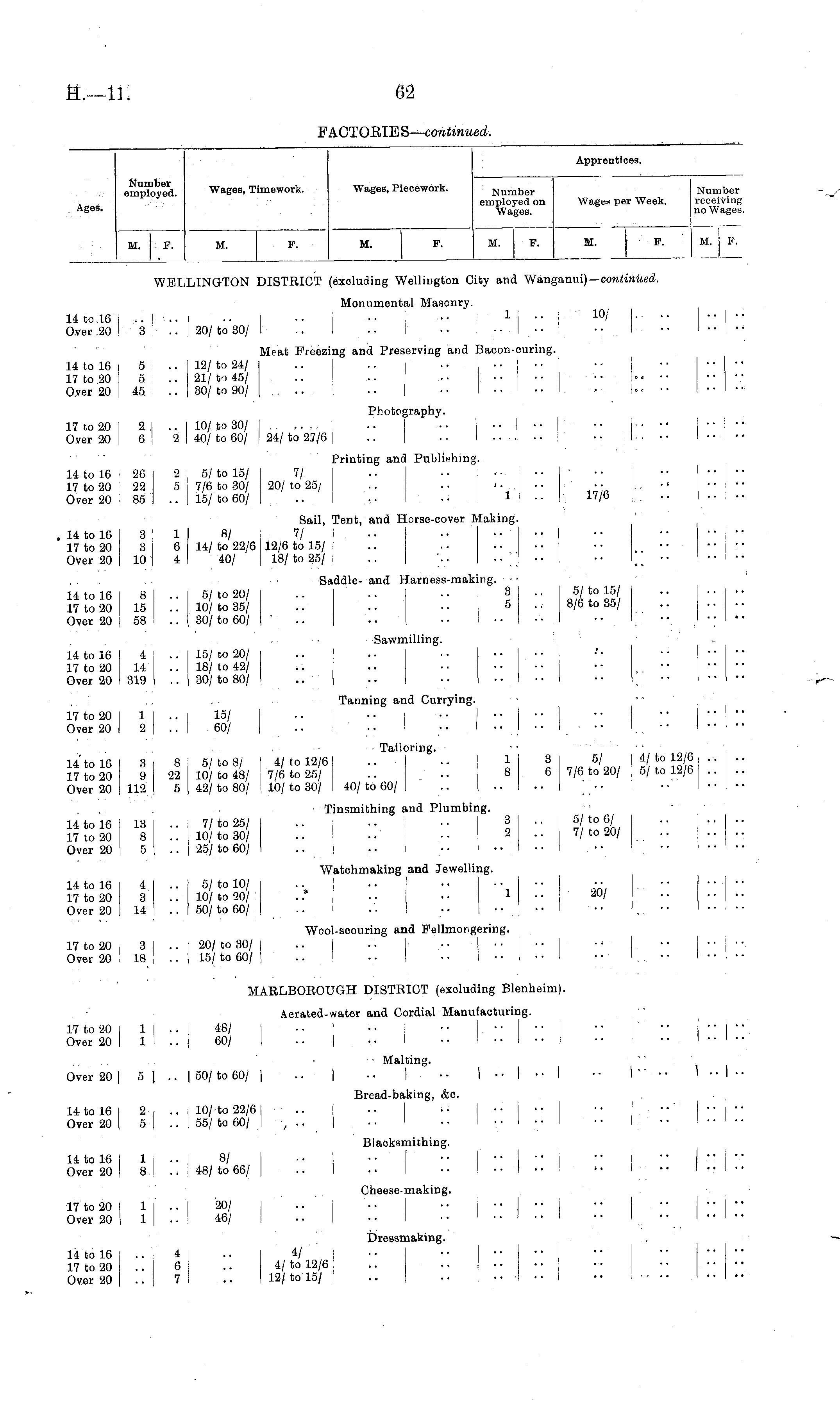 Apprentices. Number employed. Wages, Timework. Wages, Piecework. Number employed on Wages. Wage* per Week. Number reoeiving no Wages. Ages. M. F. M. F. M. F. M. F. M. F. M. F. WELLINGTON DISTRICT (exoluding Wellington City and Wanganui)— continued. Monumental Masonry. 14 to 16 I ... I .. | .- j •• I •■ I •• 1 | •• j 10 ' •• | "' | " Over 20 I 3 I .. ! 20/ to 30/ .. 1 - • I ■ • .. | .. 1 .. 1 • ■ 1 • • I • • Meat Freezing and Preserving and Bacon-curing. 14 to 16 5 1 .. | 12/ to 24/ .. •• •• j • • ■ • • • J •• • • • • 17 to 20 5: .. 21/to 45/ .. ... •■ •• •• •• 1° Over 20 45 .. | 30/to 90/ .. .. •• ! •• •• • 1 Photography. 17 to 20 [ 2 | .. | 10/to 30/ I . .... I .. .- | • • | ■• • • | ' ' - | - - | ": Over 20 | 6 1 2 I 40/ to 60/ | 24/ to 2.7/6 1 .. | .. I .. . ,| .. | • • I. - • • I • • .1 •• Printing and Publishing. 14 to 16 | 26 2 5/to 15/ 7/ .. .• • • • • •• •• ■ • • ■ 17 to 20 22 5 | 7/6 to 30/ 20/ to 25/ ,,. ... i. •• •■ Over 20 | 85 .. I 15/to 60/ .. .. •■ 1 .. 17/6 Sail, Tent, and Horse-cover Making. 14 to 16 3 1 8/ 7/ .. .• • • • • • • ...... 17 to 20 3 6 14/ to 22/6 12/6 to 15/ .. .. • • • • ■ • , .. .. Over 20 10 4 40/ 18/ to 25/ .. - .. .." .. .. _ ■• I •• •• Saddle- and Harness-making. • • 14 to 16 I 8 1 .. 5/to 20/ .. •• •• 9 ■■ Jjl^l 5 ! 17 to 20 ! 15 | .. 10/ to 35/ .. .. • • 5 .. 8/6 to 35/ Over 20 : 58 1 .. 30/ to 60/ .. .. . • • • • • • • • • , ■ •; • • Sawmilling. 14 to 16 4 1 .. 15/ to 20/ .. . • I • • • • • • •' • • • • • • • 17 to 20 14 !.. 18/ to 42/ .. .. •• • • • ■ •• • • • • . • Over 20 319 i .. 30/ to 80/ .. .. I •• •■ •■ ■• . Tanning and Currying. 17 to 20 I 11 .. i 15/ | •• I • • | ■ • | • • | ' - " | " '" " Over 20 I 2 | .. I 60/ | .. I •• ! ...!.._ \ •• I ■ •• I.. •• !••!•• Tailoring. 14 to 16 3 i 8 5/to 8/ 1 4/to 12/6 .. .. 1 1 3 5/ 4/ to 12/6 , .. .. 17 to 20 9 22 10/to 48/ i 7/6 to 25/ .. ..8 6 7/6 to 20/ 5/ to 12/6 ... .. Over 20 112 | 5 42/ to 80/ | 10/ to 30/ 40/ to 60/ .. I .. . • • ■ • • I • • • • Tinsmithing and Plumbing. 14tol6 13 .. 7/to 25/ .. j •■ 8 .. 1 5/to 6/ 17 to 20 8 .. 10/to 30/ .. •• •• 2 .. 7/to 20/ Over 20 5 .. 25/ to 60/ .. .. I • • • • • ■ I • • , Watchmaking and Jewelling. 14 to 16 4 j .. 5/ to 10/ -- •• •• •• •■ •■ .. •• I •• •• 17 to 20 3 .. 10/ to 20/ . .* • • • • 1 .. 20/ .. .... Over 20 14 .. 50/ to 60/ .. . • • • • • • • ' • • ,. • • I • • • • Wool-scouring and Fellmongering. 17 to 20 , 3 I .. [ 20/ to 30/ j .. I .• •• •■ ■• | •' •■ ■• j ■ ■ Over 20 i 18 | .. I 15/ to 60/ | .. I • ■ ] • ■ I • • 1 • • 1 • • I .. • • I • • I • • MARLBOROUGH DISTRICT (excluding Blenheim). Aerated-water and Cordial Manufacturing. 17 to 20 I 1 j .. I 48/ I . • •• • • | • ■ • • • • •• j " | '" Over 20 I 1 1 .. | 60/ I .. | • • I • • I • • I • • I • • I • • I • • ' • • Malting. Over 20 | 5 | .. | 50/ to 60/ | .. | • • I • • I • • I • ■ I • • I " • • I "•"'.]. . Bread-baking, &c. 14 to 16 1 2- r .. i 10/ to 22/6 j .. I •• ■• I •• •• •• j ••' |"|" Over 20 | 5-| .. | 55/ to 60/ I • •. .. I • • I • • I .. I • • 1 • • I . • • I • • I •• - . i i . f Blacksmithing. 14 to 16 I 1 i . - 8/ | • • I • • | • • • • • • | • • • • I •" | '-• Over 20 | 8 !.. | 48/ to 66/ | .. I • ■ • • !••!•• • • I "" • • I • • I • • Cheese-making. 17 to 20 | 1 I .. I 20/ I .. j '.. •• | •' | •" " " j " | " Over 20 I 1 | .. I 46/ | .. • • 1 • • .. . I .. I • • I • • !••!•• Dressmaking. 14 to 16 .. 4 .. 4/ .. •. •• •• •• • • .... 17 to 20 .. 6 .. 4/ to 12/6 .. .. • • • • • • Over 20 7 .. 12/ to 15/ .. • • • • • • • • I ■ • .- ....