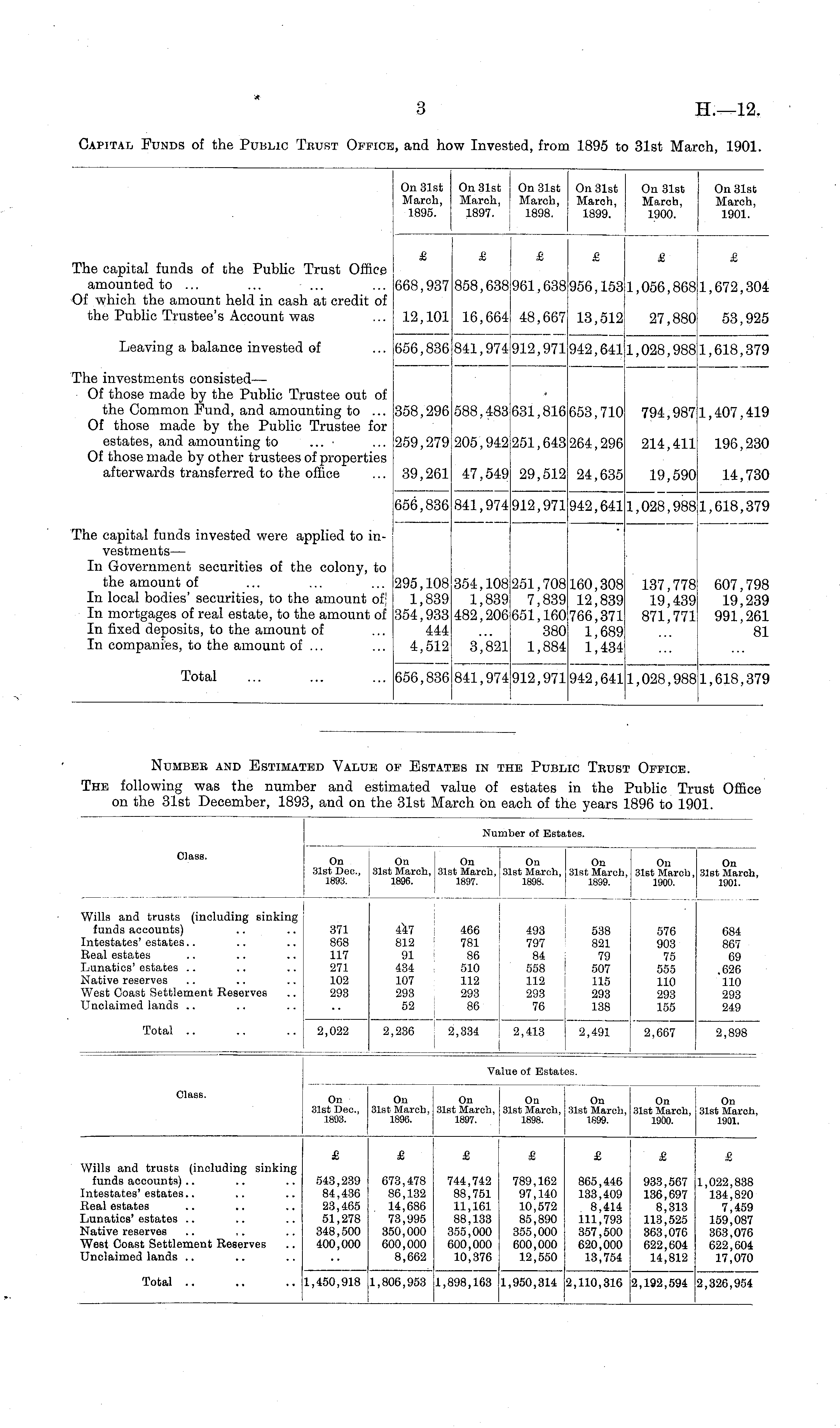 Number and Estimated Value of Estates in the Public Trust Office. The following was the number and estimated value of estates in the Public Trust Office on the 31st December, 1893, and on the 31st March on each of the years 1896 to 1901.