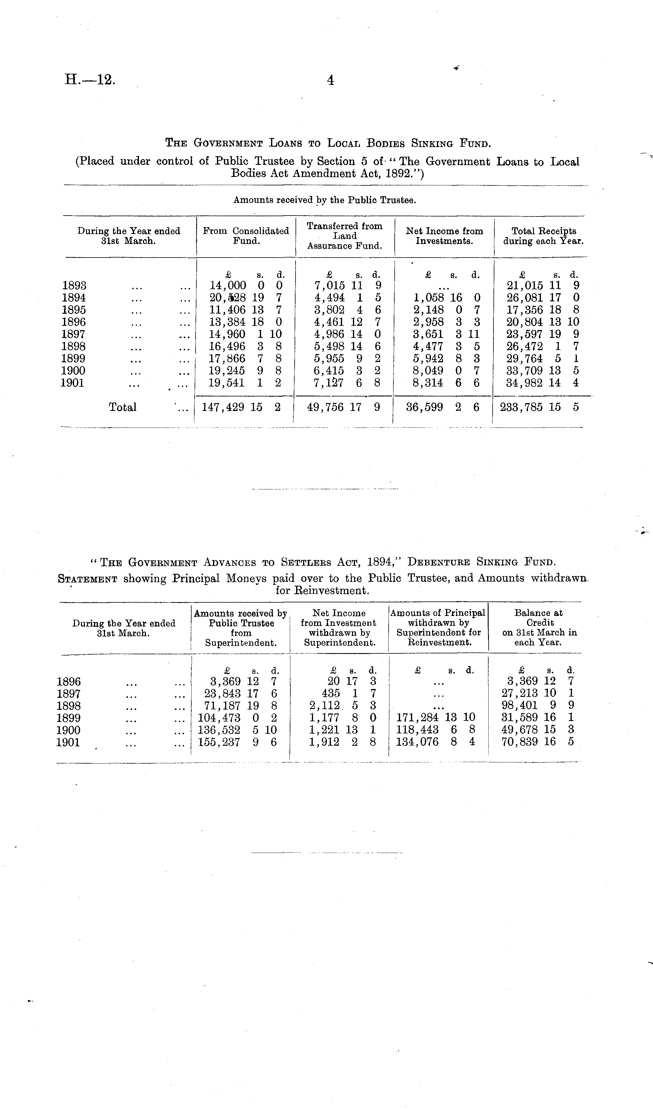 "The Government Advances to Settlers Act, 1894," Debenture Sinking Fund. Statement showing Principal Moneys paid over to the Public Trustee, and Amounts withdrawn for Reinvestment.