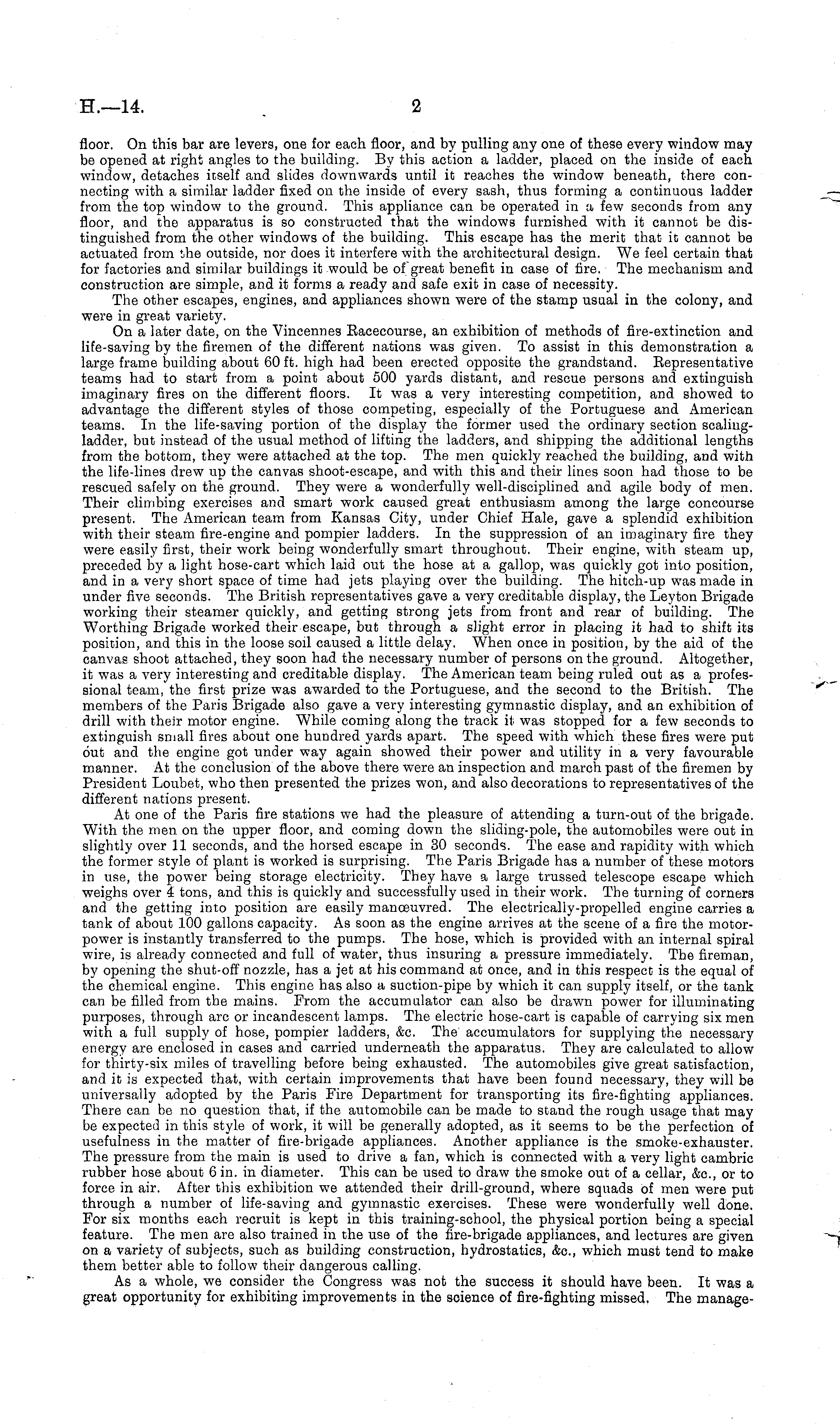 floor. On this bar are levers, one for each floor, and by pulling any one of these every window may be opened at right angles to the building. By this action a ladder, placed on the inside of each window, detaches itself and slides downwards until it reaches the window beneath, there connecting with a similar ladder fixed on the inside of every sash, thus forming a continuous ladder from the top window to the ground. This appliance can be operated in a few seconds from any floor, and the apparatus is so constructed that the windows furnished with it cannot be distinguished from the other windows of the building. This escape has the merit that it cannot be actuated from the outside, nor does it interfere with the architectural design. We feel certain that for factories and similar buildings it would be of great benefit in case of fire. The mechanism and construction are simple, and it forms a ready and safe exit in case of necessity. The other escapes, engines, and appliances shown were of the stamp usual in the colony, and were in great variety. On a later date, on the Vincennes Eacecourse, an exhibition of methods of fire-extinction and life-saving by the firemen of the different nations was given. To assist in this demonstration a large frame building about 60 ft. high had been erected opposite the grandstand. Representative teams had to start from a point about 500 yards distant, and rescue persons and extinguish imaginary fires on the different floors. It was a very interesting competition, and showed to advantage the different styles of those competing, especially of the Portuguese and American teams. In the life-saving portion of the display the former used the ordinary section scalingladder, but instead of the usual method of lifting the ladders, and shipping the additional lengths from the bottom, they were attached at the top. The men quickly reached the building, and with the life-lines drew up the canvas shoot-escape, and with this and their lines soon had those to be rescued safely on the ground. They were a wonderfully well-disciplined and agile body of men. Their climbing exercises and smart work caused great enthusiasm among the large concourse present. The American team from Kansas City, under Chief Hale, gave a splendid exhibition with their steam fire-engine and pompier ladders. In the suppression of an imaginary fire they were easily first, their work being wonderfully smart throughout. Their engine, with steam up, preceded by a light hose-cart which laid out the hose at a gallop, was quickly got into position, and in a very short space of time had jets playing over the building. The hitch-up was made in under five seconds. The British representatives gave a very creditable display, the Leyton Brigade working their steamer quickly, and getting strong jets from front and rear of building. The Worthing Brigade worked their escape, but through a slight error in placing it had to shift its position, and this in the loose soil caused a little delay. When once in position, by the aid of the canvas shoot attached, they soon had the necessary number of persons on the ground. Altogether, it was a very interesting and creditable display. The American team being ruled out as a professional team, the first prize was awarded to the Portuguese, and the second to the British. The members of the Paris Brigade also gave a very interesting gymnastic display, and an exhibition of drill with their motor engine. While coming along the track it was stopped for a few seconds to extinguish small fires about one hundred yards apart. The speed with which these fires were put out and the engine got under way again showed their power and utility in a very favourable manner. At the conclusion of the above there were an inspection and march past of the firemen by President Loubet, who then presented the prizes won, and also decorations to representatives of the different nations present. At one of the Paris fire stations we had the pleasure of attending a turn-out of the brigade. With the men on the upper floor, and coming down the sliding-pole, the automobiles were out in slightly over 11 seconds, and the horsed escape in 30 seconds. The ease and rapidity with which the former style of plant is worked is surprising. The Paris Brigade has a number of these motors in use, the power being storage electricity. They have a large trussed telescope escape which weighs over 4 tons, and this is quickly and successfully used in their work. The turning of corners and the getting into position are easily manoeuvred. The electrically-propelled engine carries a tank of about 100 gallons capacity. As soon as the engine arrives at the scene of a fire the motorpower is instantly transferred to the pumps. The hose, which is provided with an internal spiral wire, is already connected and full of water, thus insuring a pressure immediately. The fireman, by opening the shut-off nozzle, has a jet at his command at once, and in this respect is the equal of the chemical engine. This engine has also a suction-pipe by which it can supply itself, or the tank can be filled from the mains. From the accumulator can also be drawn power for illuminating purposes, through arc or incandescent lamps. The electric hose-cart is capable of carrying six men with a full supply of hose, pompier ladders, &c. The accumulators for supplying the necessary energy are enclosed in cases and carried underneath the apparatus. They are calculated to allow for thirty-six miles of travelling before being exhausted. The automobiles give great satisfaction, and it is expected that, with certain improvements that have been found necessary, they will be universally adopted by the Paris Fire Department for transporting its fire-fighting appliances. There can be no question that, if the automobile can be made to stand the rough usage that may be expected in this style of work, it will be generally adopted, as it seems to be the perfection of usefulness in
