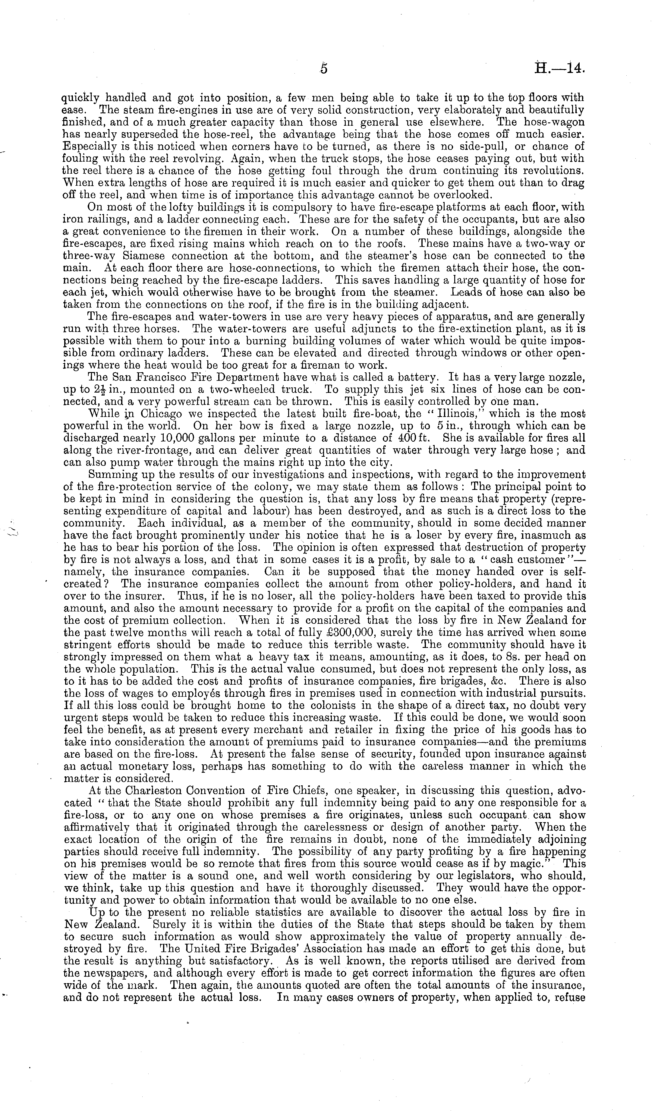 quickly handled and got into position, a few men being able to take it up to the top floors with ease. The steam fire-engines in use are of very solid construction, very elaborately and beautifully finished, and of a much greater capacity than those in general use elsewhere. The hose-wagon has nearly superseded the hose-reel, the advantage being that the hose comes off much easier. Especially is this noticed when corners have to be turned, as there is no side-pull, or chance of fouling with the reel revolving. Again, when the truck stops, the hose ceases paying out, but with the reel there is a chance of the hose getting foul through the drum continuing its revolutions. When extra lengths of hose are required it is much easier and quicker to get them out than to drag off the reel, and when time is of importance this advantage cannot be overlooked. On most of the lofty buildings it is compulsory to have fire-escape platforms at each floor, with iron railings, and a ladder connecting each. These are for the safety of the occupants, but are also a great convenience to the firemen in their work. On a number of these buildings, alongside the fire-escapes, are fixed rising mains which reach on to the roofs. These mains have a two-way or three-way Siamese connection at the bottom, and the steamer's hose can be connected to the main. At each floor there are hose-connections, to which the firemen attach their hose, the connections being reached by the fire-escape ladders. This saves handling a large quantity of hose for each jet, which would otherwise have to be brought from the steamer. Leads of hose can also be taken from the connections on the roof, if the fire is in the building adjacent. The fire-escapes and water-towers in use are very heavy pieces of apparatus, and are generally run with three horses. The water-towers are useful adjuncts to the fire-extinction plant, as it is possible with them to pour into a burning building volumes of water which would be quite impossible from ordinary ladders. These can be elevated and directed through windows or other openings where the heat would be too great for a fireman to work. The San Francisco Fire Department have what is called a battery. It has a very large nozzle, up to 2-Jin., mounted on a two-wheeled truck. To supply this jet six lines of hose can be connected, and a very powerful stream can be thrown. This is easily controlled by one man. While in Chicago we inspected the latest built fire-boat, the " Illinois," which is the most powerful in the world. On her bow is fixed a large nozzle, up to 5 in., through which can be discharged nearly 10,000 gallons per minute to a distance of 400 ft. She is available for fires all along the river-frontage, and can deliver great quantities of water through very large hose ; and can also pump water through the mains right up into the city. Summing up the results of our investigations and inspections, with regard to the improvement of the fire-protection service of the colony, we may state them as follows : The principal point to be kept in mind in considering the question is, that any loss by fire means that property (representing expenditure of capital and labour) has been destroyed, and as such is a direct loss to the community. Each individual, as a member of the community, should in some decided manner have the fact brought prominently under his notice that he is a loser by every fire, inasmuch as he has to bear his portion of the loss. The opinion is often expressed that destruction of property by fire is not always a loss, and that in some cases it is a profit, by sale to a " cash customer"— namely, the insurance companies. Can it be supposed that the money handed over is selfcreated? The insurance companies collect the amount from other policy-holders, and hand it over to the insurer. Thus, if he is no loser, all the policy-holders have been taxed to provide this amount, and also the amount necessary to provide for a profit on the capital of the companies and the cost of premium collection. When it is considered that the loss by fire in New Zealand for the past twelve months will reach a total of fully £300,000, surely the time has arrived when some stringent efforts should be made to reduce this terrible waste. The community should have it strongly impressed on them what a heavy tax it means, amounting, as it does, to Bs. per head on the whole population. This is the actual value consumed, but does not represent the only loss, as to it has to be added the cost and profits of insurance companies, fire brigades, &c. There is also the loss of wages to employes through fires in premises used in connection with industrial pursuits. If all this loss could be brought home to the colonists in the shape of a direct tax, no doubt very urgent steps would be taken to reduce this increasing waste. If this could be done, we would soon feel the benefit, as at present every merchant and retailer in fixing the price of his goods has to take into consideration the amount of premiums paid to insurance companies—and the premiums are based on the fire-loss. At present the false sense of security, founded upon insurance against an actual monetary loss, perhaps has something to do with the careless manner in which the matter is considered. At the Charleston Convention of Fire Chiefs, one speaker, in discussing this question, advocated " that the State should prohibit any full indemnity being paid to any one responsible for a fire-loss, or to any one on whose premises a fire originates, unless such occupant can show affirmatively that it originated through the carelessness or design of another party. When the exact location of the origin of the fire remains in doubt, none of the immediately adjoining parties should receive full indemnity. The possibility of any party profiting by a fire happening on his premises would be so remote that fires from this source would cease as if by magic." This view of the matter is 