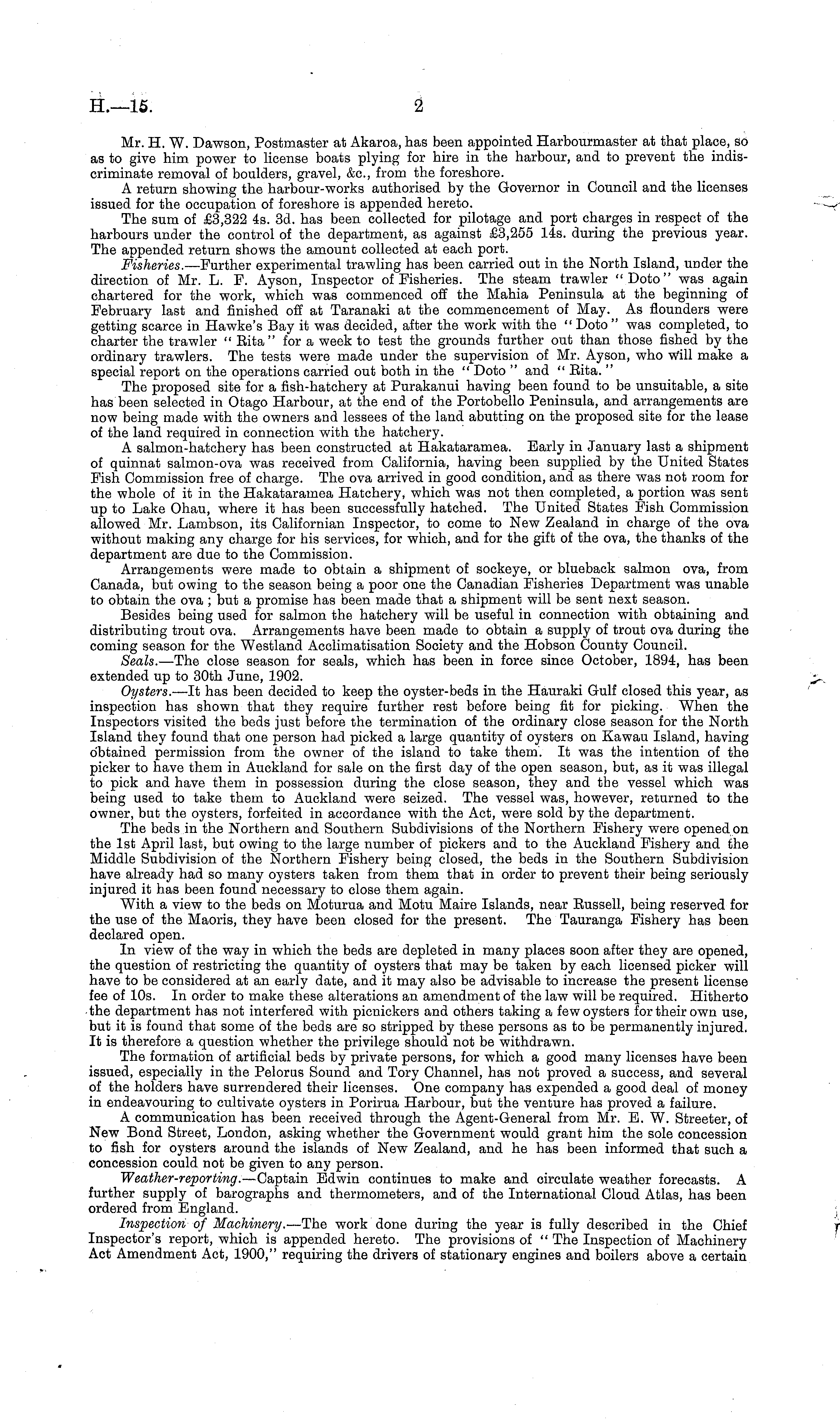Mr. H. W. Dawson, Postmaster at Akaroa, has been appointed Harbourmaster at that place, so as to give him power to license boats plying for hire in the harbour, and to prevent the indiscriminate removal of boulders, gravel, &c, from the foreshore. A return showing the harbour-works authorised by the Governor in Council and the licenses issued for the occupation of foreshore is appended hereto. The sum of £3,322 4s. 3d. has been collected for pilotage and port charges in respect of the harbours under the control of the department, as against £3,255 14s. during the previous year. The appended return shows the amount collected at each port. Fisheries. —Further experimental trawling has been carried out in the North Island, under the direction of Mr. L. F. Ayson, Inspector of Fisheries. The steam trawler "Doto" was again chartered for the work, which was commenced off the Mahia Peninsula at the beginning of February last and finished off at Taranaki at the commencement of May. As flounders were getting scarce in Hawke's Bay it was decided, after the work with the " Doto " was completed, to charter the trawler " Eita " for a week to test the grounds further out than those fished by the ordinary trawlers. The tests were made under the supervision of Mr. Ayson, who Will make a special report on the operations carried out both in the " Doto " and " Eita. " The proposed site for a fish-hatchery at Purakanui having been found to be unsuitable, a site has been selected in Otago Harbour, at the end of the Portobello Peninsula, and arrangements are now being made with the owners and lessees of the land abutting on the proposed site for the lease of the land required in connection with the hatchery. A salmon-hatchery has been constructed at Hakataramea. Early in January last a shipment of quinnat salmon-ova was received from California, having been supplied by the United States Fish Commission free of charge. The ova arrived in good condition, and as there was not room for the whole of it in the Hakataramea Hatchery, which was not then completed, a portion was sent up to Lake Ohau, where it has been successfully hatched. The United States Fish Commission allowed Mr. Lambson, its Californian Inspector, to come to New Zealand in charge of the ova without making any charge for his services, for which, and for the gift of the ova, the thanks of the department are due to the Commission. Arrangements were made to obtain a shipment of sockeye, or blueback salmon ova, from Canada, but owing to the season being a poor one the Canadian Fisheries Department was unable to obtain the ova; but a promise has been made that a shipment will be sent next season. Besides being used for salmon the hatchery will be useful in connection with obtaining and distributing trout ova. Arrangements have been made to obtain a supply of trout ova during the coming season for the Westland Acclimatisation Society and the Hobson County Council. Seals. —The close season for seals, which has been in force since October, 1894, has been extended up to 30th June, 1902. Oysters. —lt has been decided to keep the oyster-beds in the Hauraki Gulf closed this year, as inspection has shown that they require further rest before being fit for picking. When the Inspectors visited the beds just before the termination of the ordinary close season for the North Island they found that one person had picked a large quantity of oysters on Kawau Island, having obtained permission from the owner of the island to take them. It was the intention of the picker to have them in Auckland for sale on the first day of the open season, but, as it was illegal to pick and have them in possession during the close season, they and the vessel which was being used to take them to Auckland were seized. The vessel was, however, returned to the owner, but the oysters, forfeited in accordance with the Act, were sold by the department. The beds in the Northern and Southern Subdivisions of the Northern Fishery were opened on the Ist April last, but owing to the large number of pickers and to the Auckland Fishery and the Middle Subdivision of the Northern Fishery being closed, the beds in the Southern Subdivision have already had so many oysters taken from them that in order to prevent their being seriously injured it has been found necessary to close them again. With a view to the beds on Moturua and Motu Maire Islands, near Eussell, being reserved for the use of the Maoris, they have been closed for the present. The Tauranga Fishery has been declared open. In view of the way in which the beds are depleted in many places soon after they are opened, the question of restricting the quantity of oysters that may be taken by each licensed picker will have to be considered at an early date, and it may also be advisable to increase the present license fee of 10s. In order to make these alterations an amendment of the law will be required. Hitherto the department has not interfered with picnickers and others taking a few oysters for their own use, but it is found that some of the beds are so stripped by these persons as to be permanently injured. It is therefore a question whether the privilege should not be withdrawn. The formation of artificial beds by private persons, for which a good many licenses have been issued, especially in the Pelorus Sound and Tory Channel, has not proved a success, and several of the holders have surrendered their licenses. One company has expended a good deal of money in endeavouring to cultivate oysters in Porirua Harbour, but the venture has proved a failure. A communication has been received through the Agent-General from Mr. E. W. Streeter, of New Bond Street, London, asking whether the Government would grant him the sole concession to fish for oysters around the islands of New Zealand, and he has been informed that such a concession could not be given to any person. Weather-reporting. —Captain Edwin continues to make and circulate weather fo