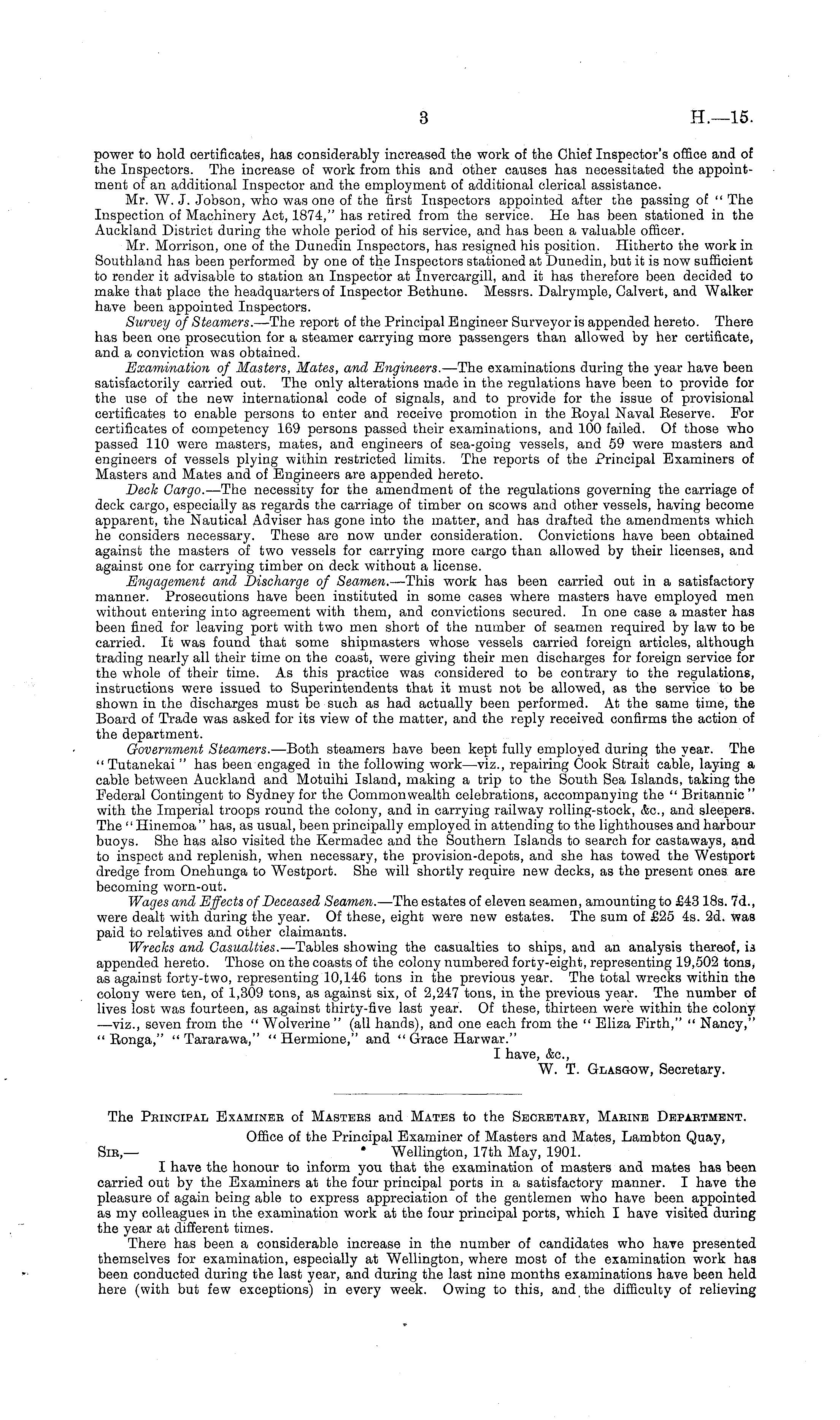 The Principal Examiner of Masters and Mates to the Secretary, Marine Department. Office of the Principal Examiner of Masters and Mates, Lambton Quay, Sir,— ' Wellington, 17th May, 1901. I have the honour to inform you that the examination of masters and mates has been carried out by the Examiners at the four principal ports in a satisfactory manner. I have the pleasure of again being able to express appreciation of the gentlemen who have been appointed as my colleagues in the examination work at the four principal ports, which I have visited during the year at different times. There has been a considerable increase in the number of candidates who have presented themselves for examination, especially at Wellington, where most of the examination work has been conducted during the last year, and during the last nine months examinations have been held here (with but few exceptions) in every week. Owing to this, and the difficulty of relieving