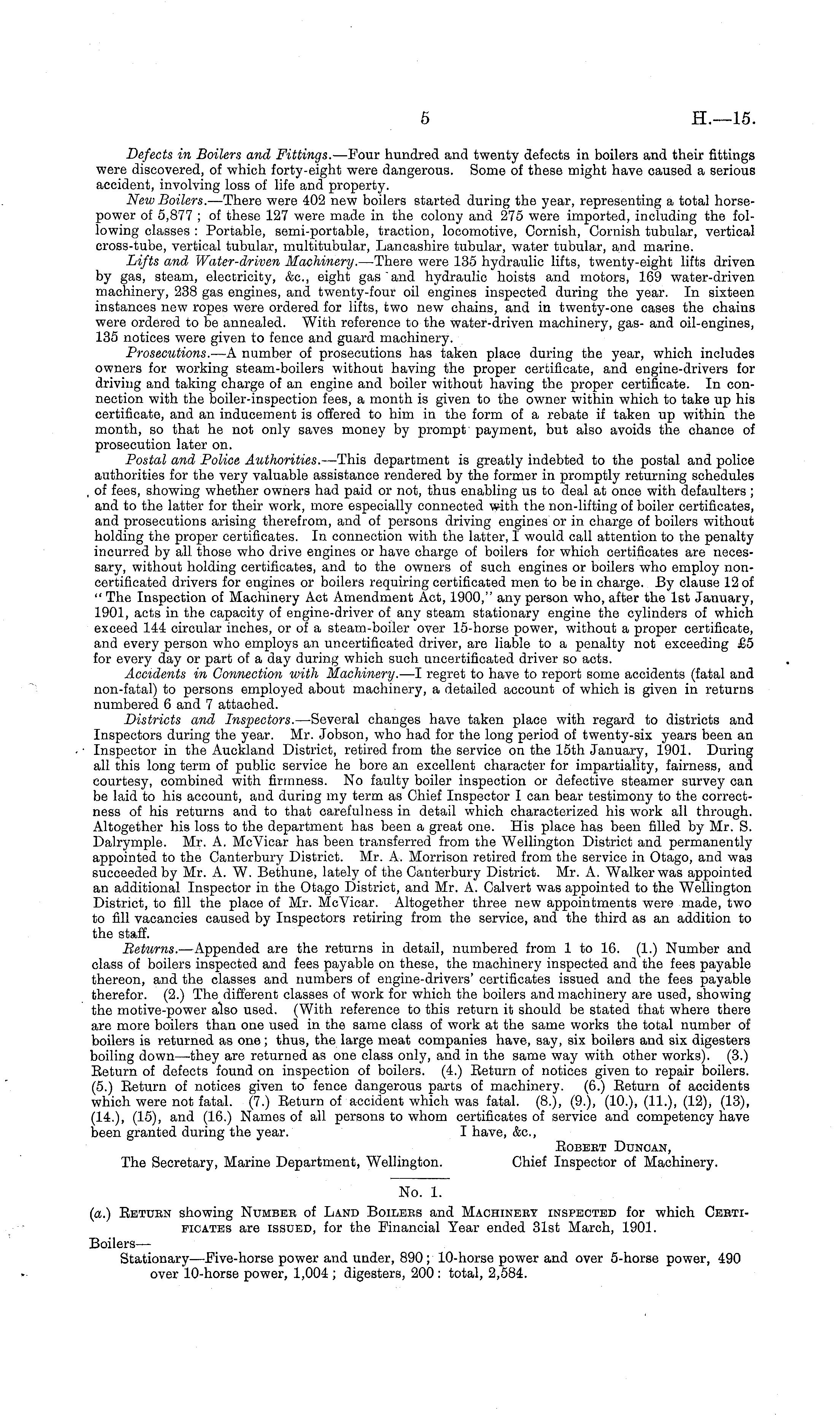 No. 1. (a.) Eeturn showing Number of Land Boilers and Machinery inspected for which Certificates are issued, for the Financial Tear ended 31st March, 1901. Boilers — Stationary—Five-horse power and under, 890; 10-horse power and over 5-horse power, 490 over 10-horse power, 1,004 ; digesters, 200 : total, 2,584.