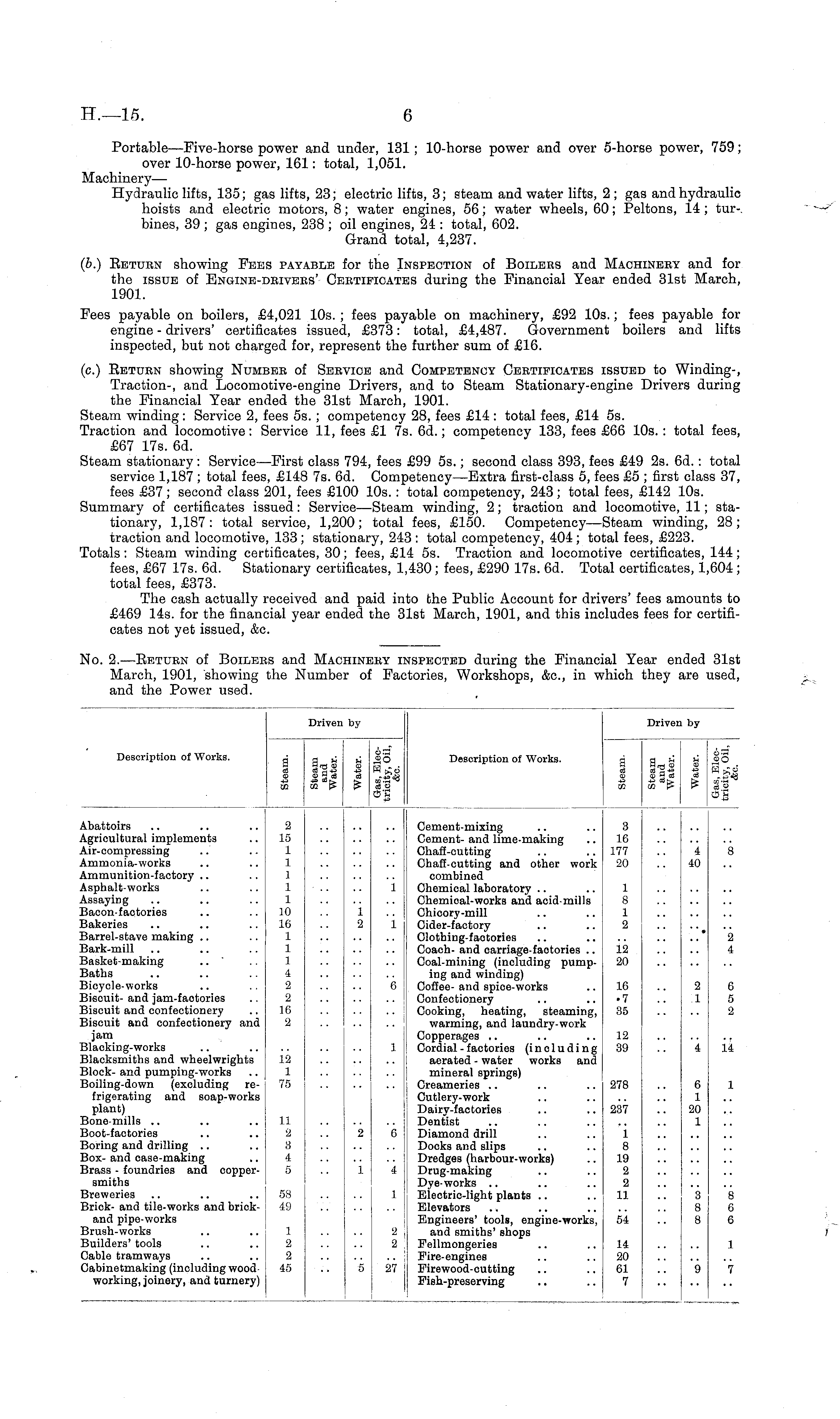 Portable—Five-horse power and under, 131; 10-horse power and over 5-horse power, 759; over 10-horse power, 161: total, 1,051. Machinery— Hydraulic lifts, 135; gas lifts, 23; electric lifts, 3; steam and water lifts, 2 ; gas and hydraulic hoists and electric motors, 8; water engines, 56; water wheels, 60; Peltons, 14; tur-. bines, 39 ; gas engines, 238 ; oil engines, 24 : total, 602. Grand total, 4,237. (b.) Eeturn showing Fees payable for the Inspection of Boilers and Machinery and for the issue of Engine-drivers' Certificates during the Financial Year ended 31st March, 1901. Fees payable on boilers, £4,021 10s. ; fees payable on machinery, £92 10s.; fees payable for engine - drivers' certificates issued, £373: total, £4,487. Government boilers and lifts inspected, but not charged for, represent the further sum of £16. (c.) Eeturn showing Number of Service and Competency Certificates issued to Winding-, Traction-, and Locomotive-engine Drivers, and to Steam Stationary-engine Drivers during the Financial Year ended the 31st March, 1901. Steam winding: Service 2, fees 55.; competency 28, fees £14 : total fees, £14 ss. Traction and locomotive: Service 11, fees £1 7s. 6d.; competency 133, fees £66 10s.: total fees, £67 17s. 6d. Steam stationary: Service—First class 794, fees £99 55.; second class 393, fees £49 2s. 6d.: total service 1,187 ; total fees, £148 7s. 6d. Competency—Extra first-class 5, fees £5 ; first class 37, fees £37; second class 201, fees £100 10s.: total competency, 243; total fees, £142 10s. Summary of certificates issued: Service—Steam winding, 2; traction and locomotive, 11; stationary, 1,187: total service, 1,200; total fees, £150. Competency—Steam winding, 28; traction and locomotive, 133; stationary, 243 : total competency, 404; total fees, £223. Totals: Steam winding certificates, 30; fees, £14 ss. Traction and locomotive certificates, 144; fees, £67 17s. 6d. Stationary certificates, 1,430; fees, £290 17s. 6d. Total certificates, 1,604; total fees, £373. The cash actually received and paid into the Public Account for drivers' fees amounts to £469 14s. for the financial year ended the 31st March, 1901, and this includes fees for certificates not yet issued, &c.