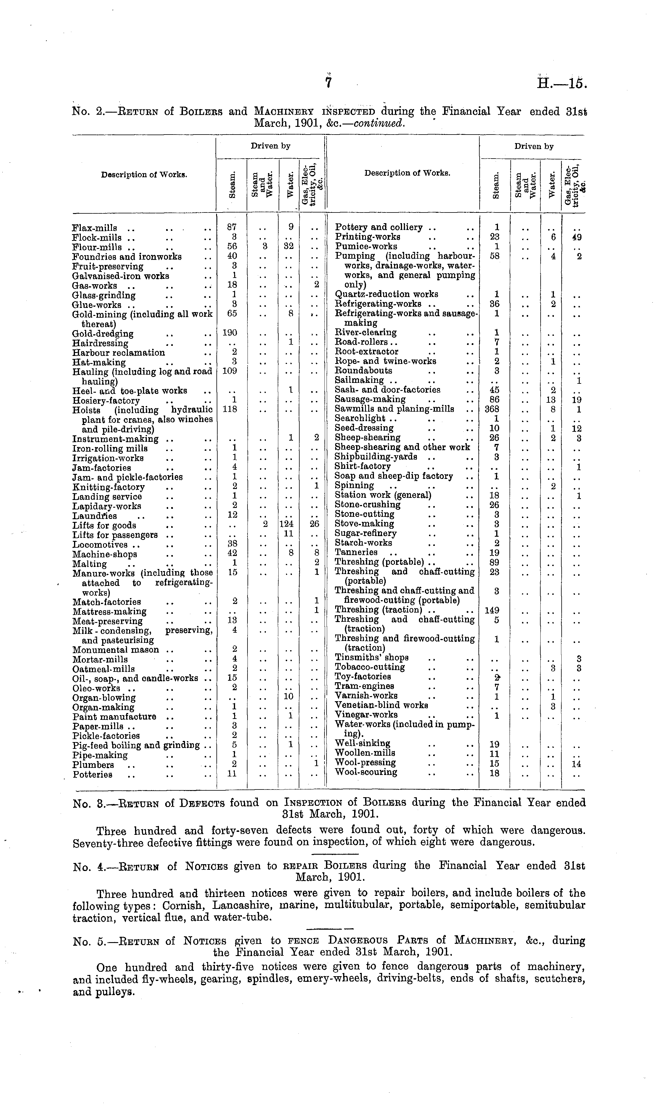 No. 5. —Eeturn of Notices given to fence Dangerous Parts of Machinery, &c, during the Financial Year ended 31st March, 1901. One hundred and thirty-five notices were given to fence dangerous parts of machinery, and included fly-wheels, gearing, spindles, emery-wheels, driving-belts, ends of shafts, scutchers, and pulleys.