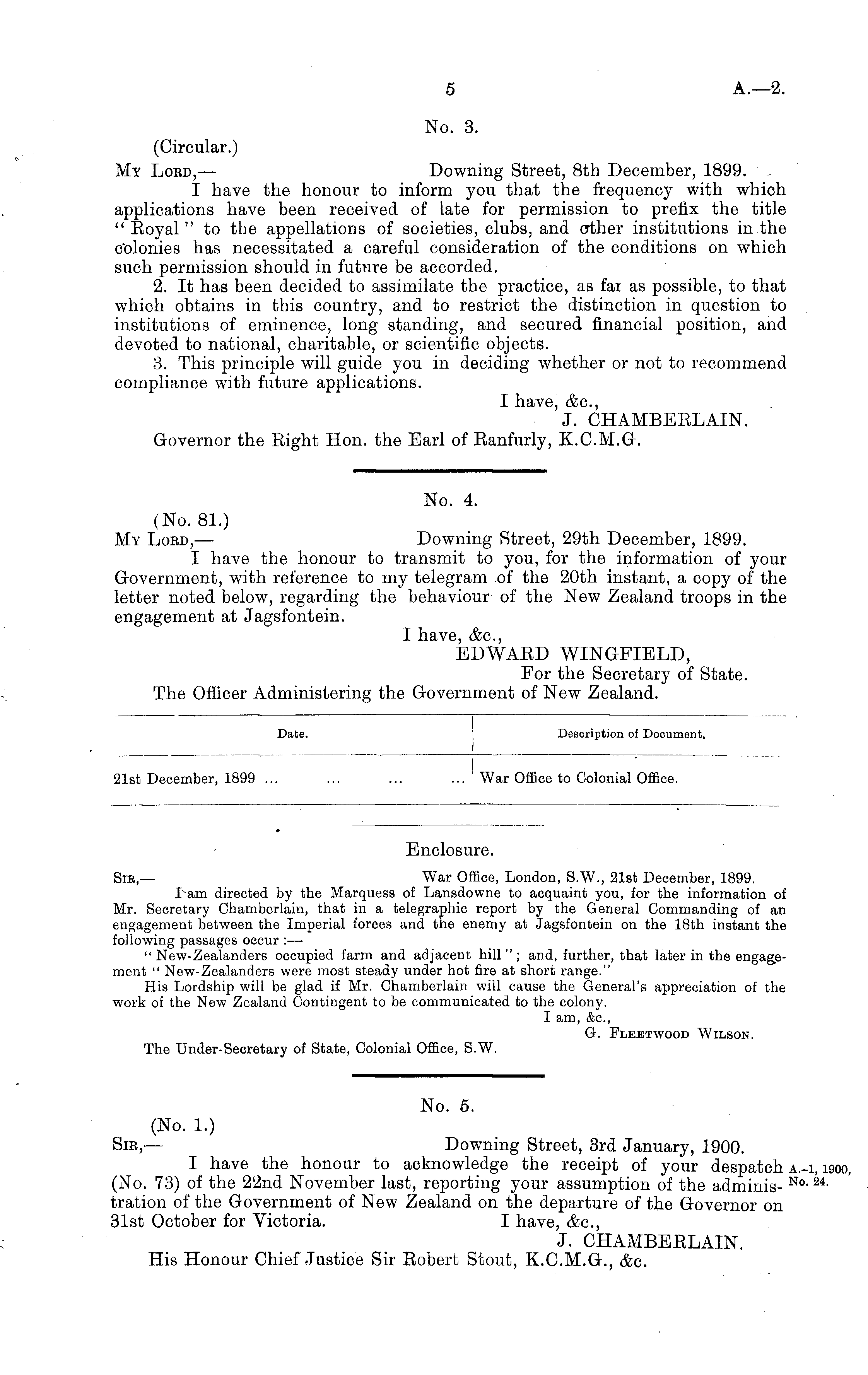 No. 5. (No. 1.) Sib, — Downing Street, 3rd January, 1900. I have the honour to acknowledge the receipt of your despatch (No. 73) of the 22nd November last, reporting your assumption of the administration of the Government of New Zealand on the departure of the Governor on 31st October for Victoria. I have, &c, J. CHAMBERLAIN. His Honour Chief Justice Sir Robert Stout, K.C.M.G., &c.
