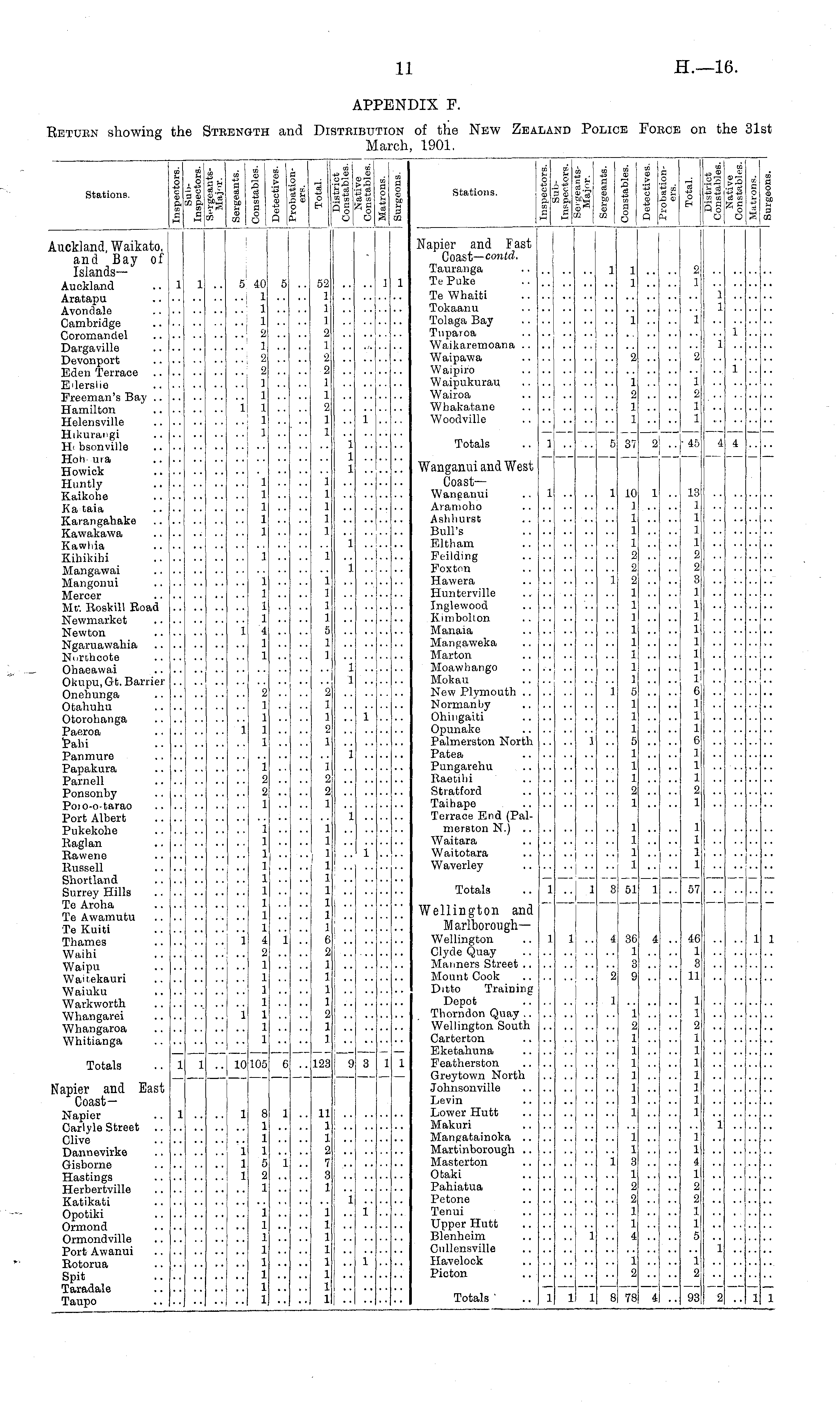 APPENDIX F. Return showing the Strength and Distribution of the New Zealand Police Force on the 31st March, 1901.