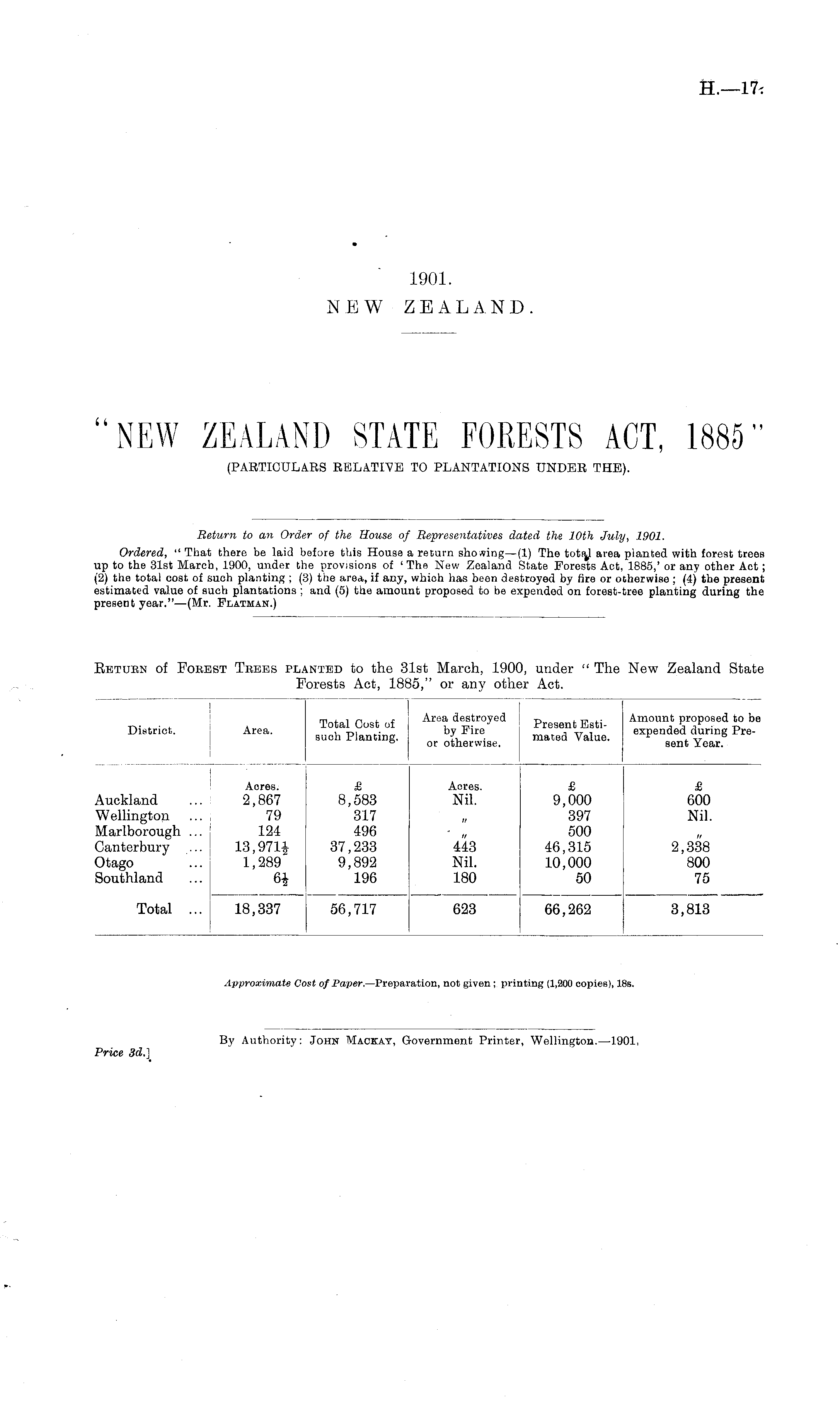 Return to an Order of the House of Representatives dated the 10th July, 1901. Ordered, " That there be laid before this House a return showing—(l) The totaj area planted with forest trees up to the 31st March, 1900, under the provisions of ' The New Zealand State Forests Act, 1885,' or any other Act; (2) the total cost of such planting ; (3) the area, if any, which has been destroyed by fire or otherwise ; (4) the present estimated value of such plantations ; and (5) the amount proposed to be expended on forest-tree planting during the present year."—(Mr. Flatman.)